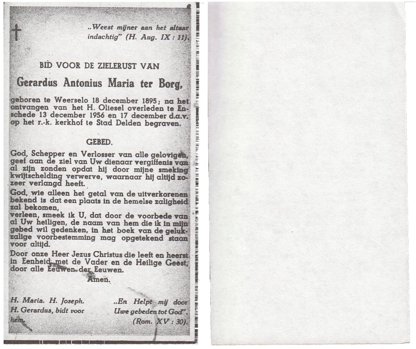 BORG, ter, Gerardus Antonius Maria, geboren op 18-12-1895 te Weerselo, overleden op 13-12-1956 te Enschede op 60-jarige leeftijd, begraven op 17-12-1956 te Delden, Stad.