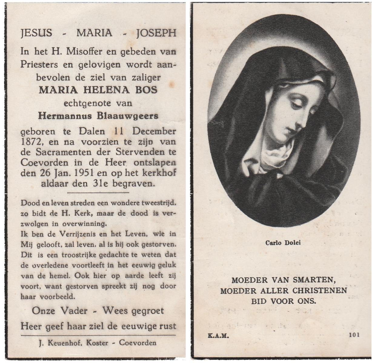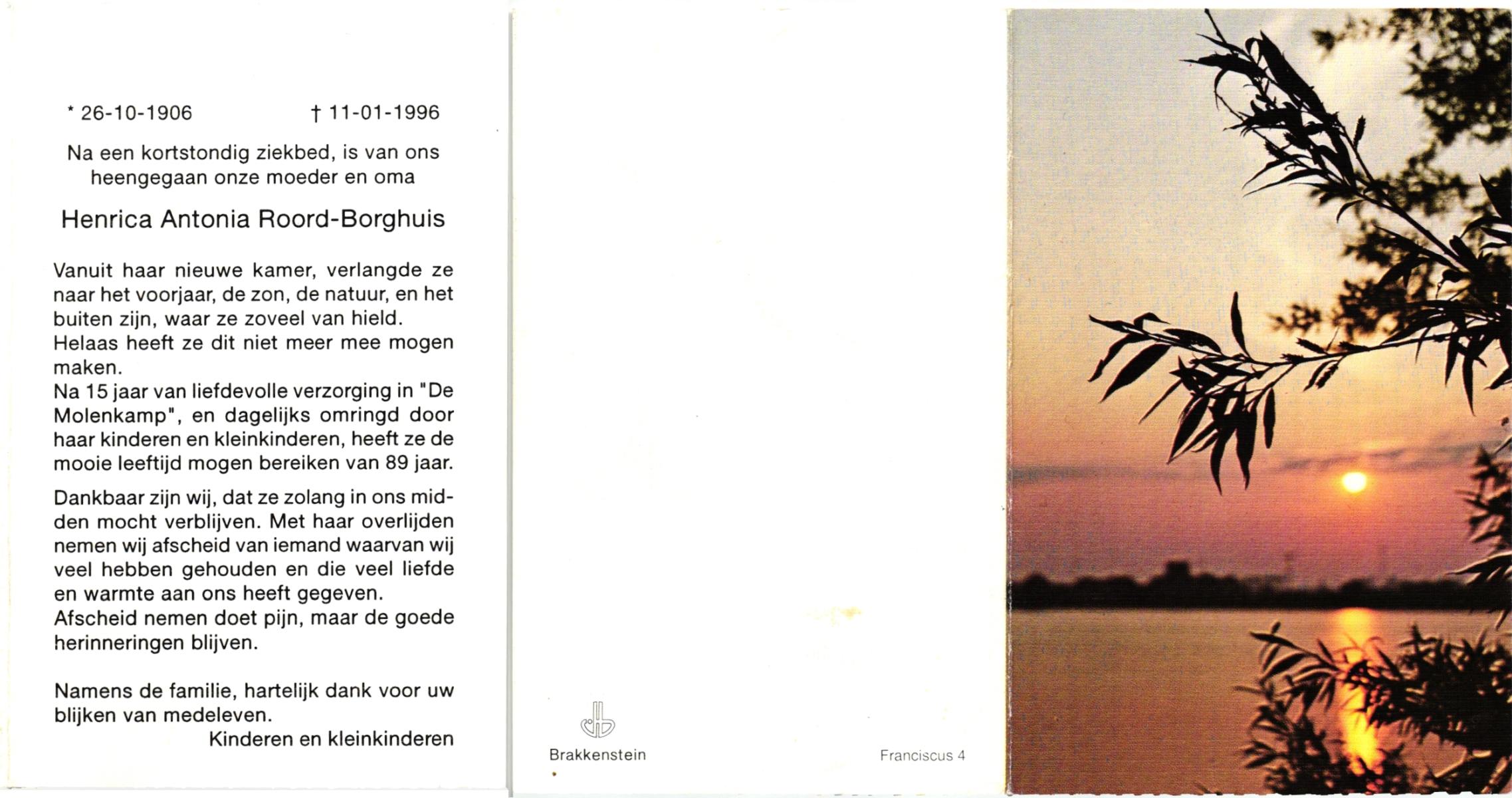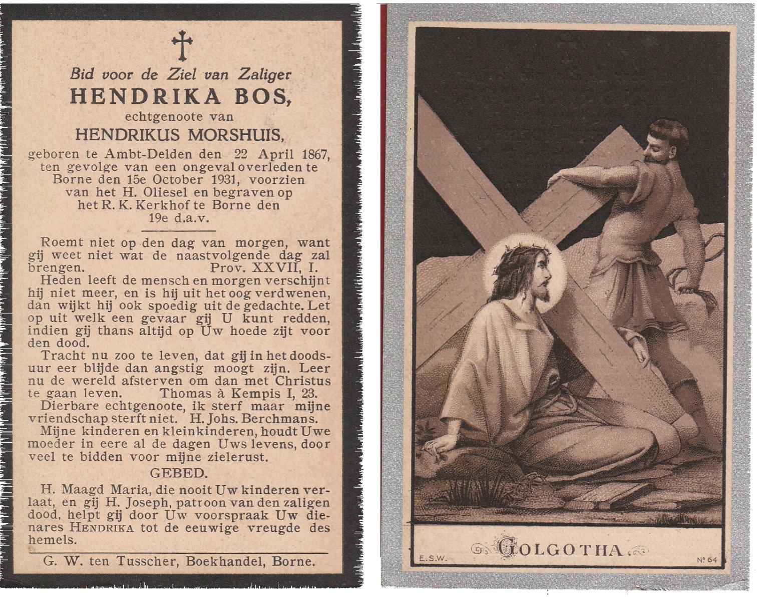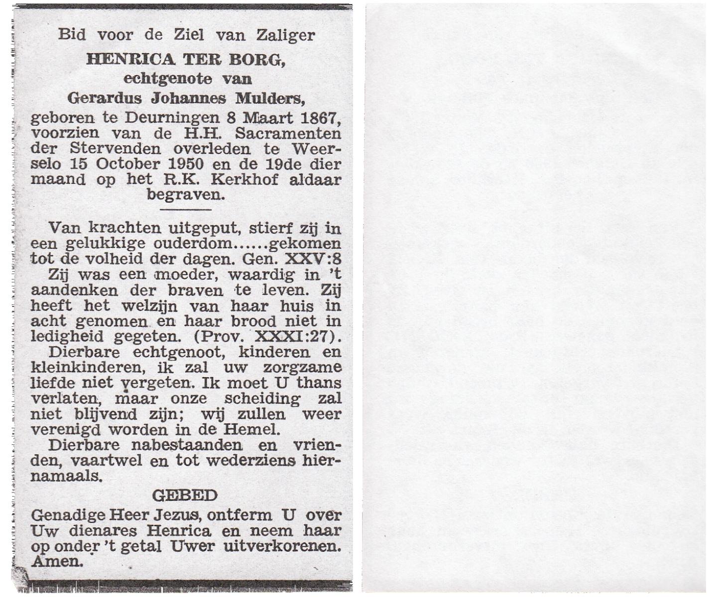 BORG, ter, Henrica, geboren op 08-03-1867 te Deurningen, overleden op 15-10-1950 te Weerselo op 83-jarige leeftijd, begraven op 19-10-1950 te Weerselo.