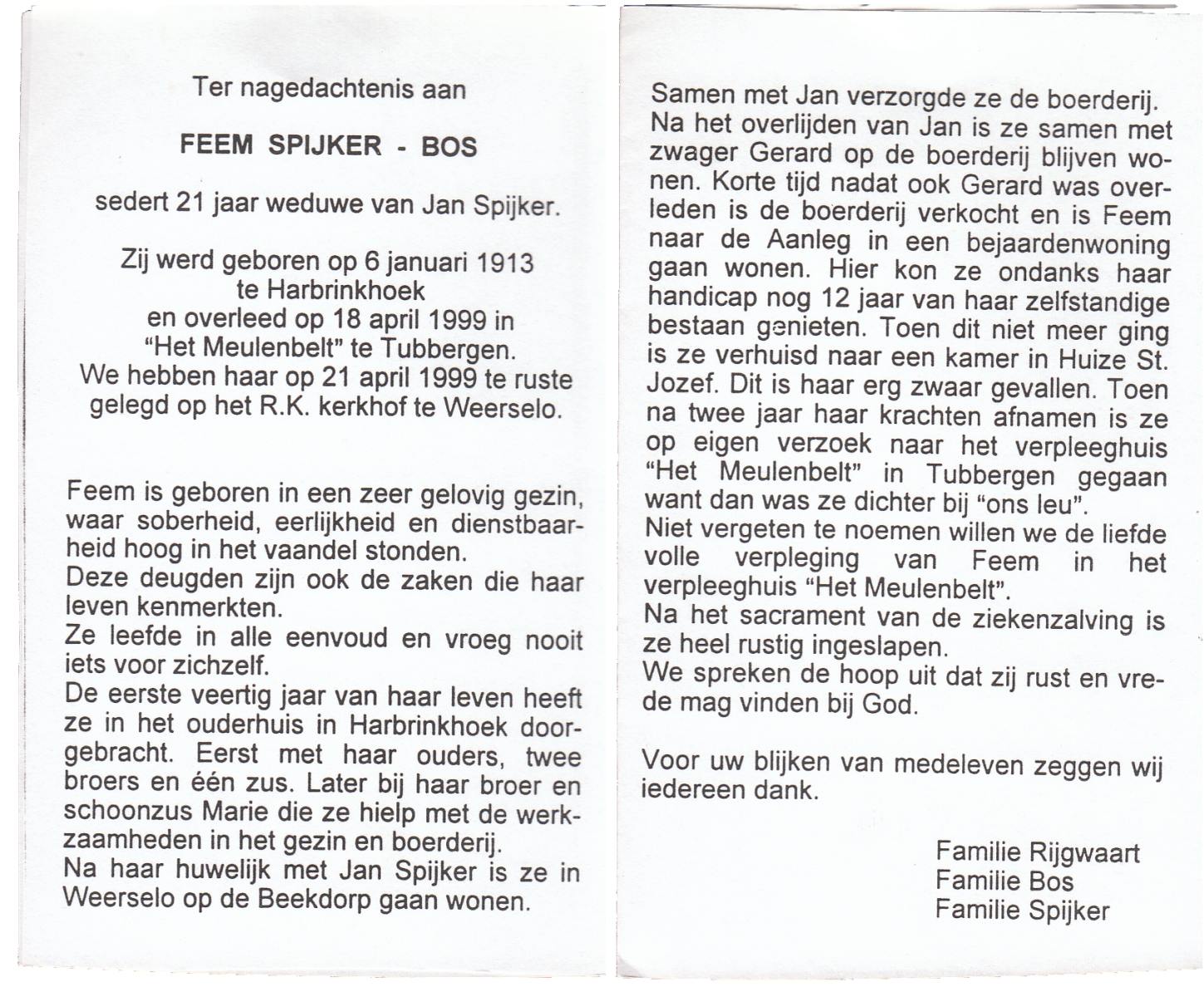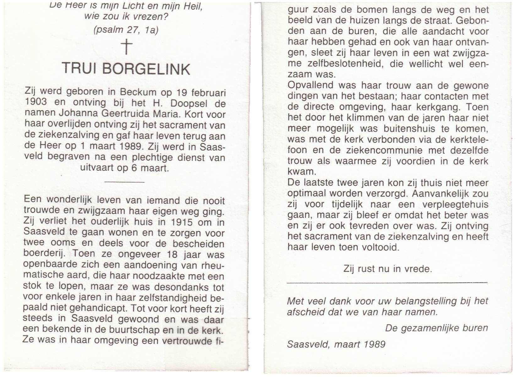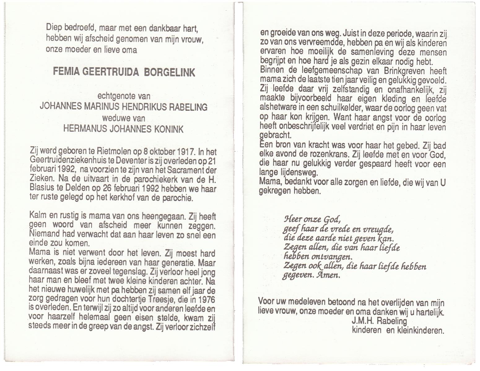 BORGELINK, Femia Geertruida, geboren op 8-10-1917 te Rietmolen, overleden op 21-2-1992 te Deventer op 74-jarige leeftijd, begraven op 26-2-1992 te Delden.
