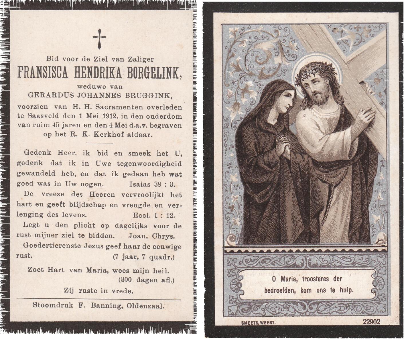 BORGELINK, Francisca Hendrika, overleden op 1-5-1912 te Saasveld op 45-jarige leeftijd, begraven op 4-5-1912 te Saasveld.