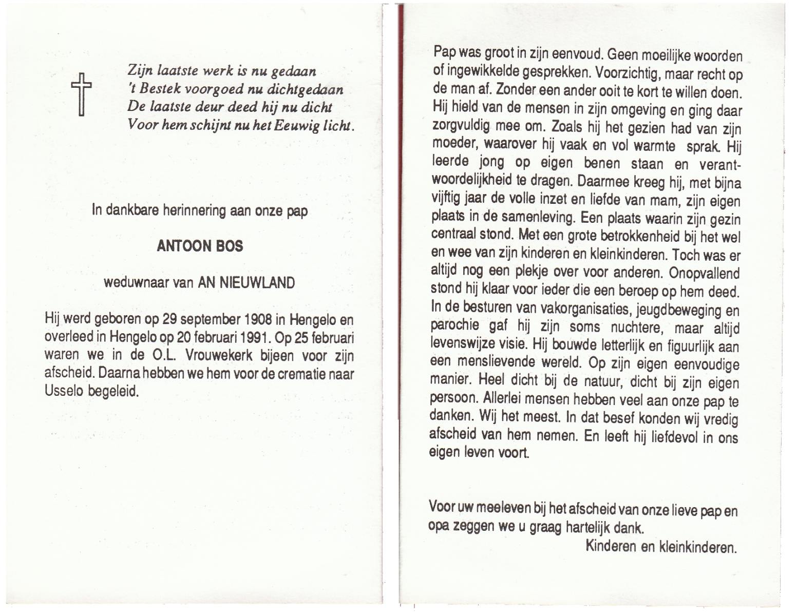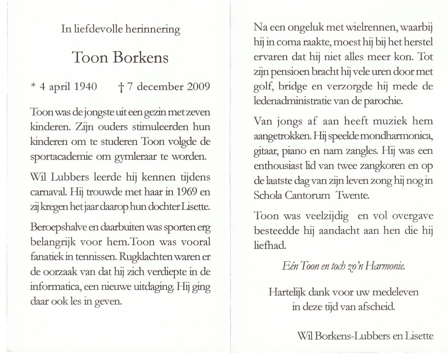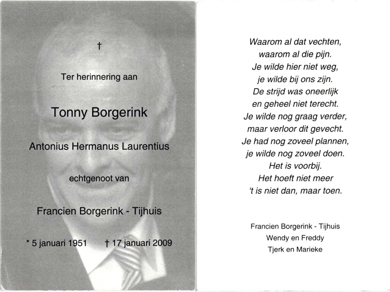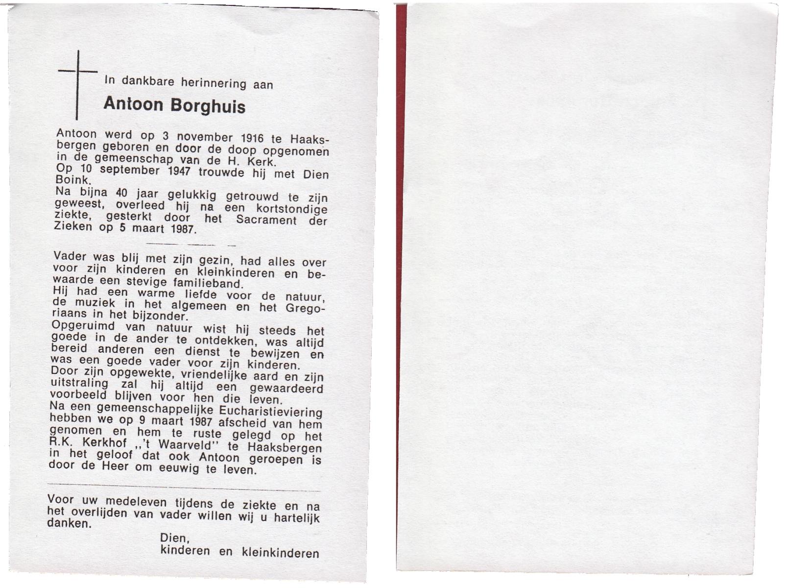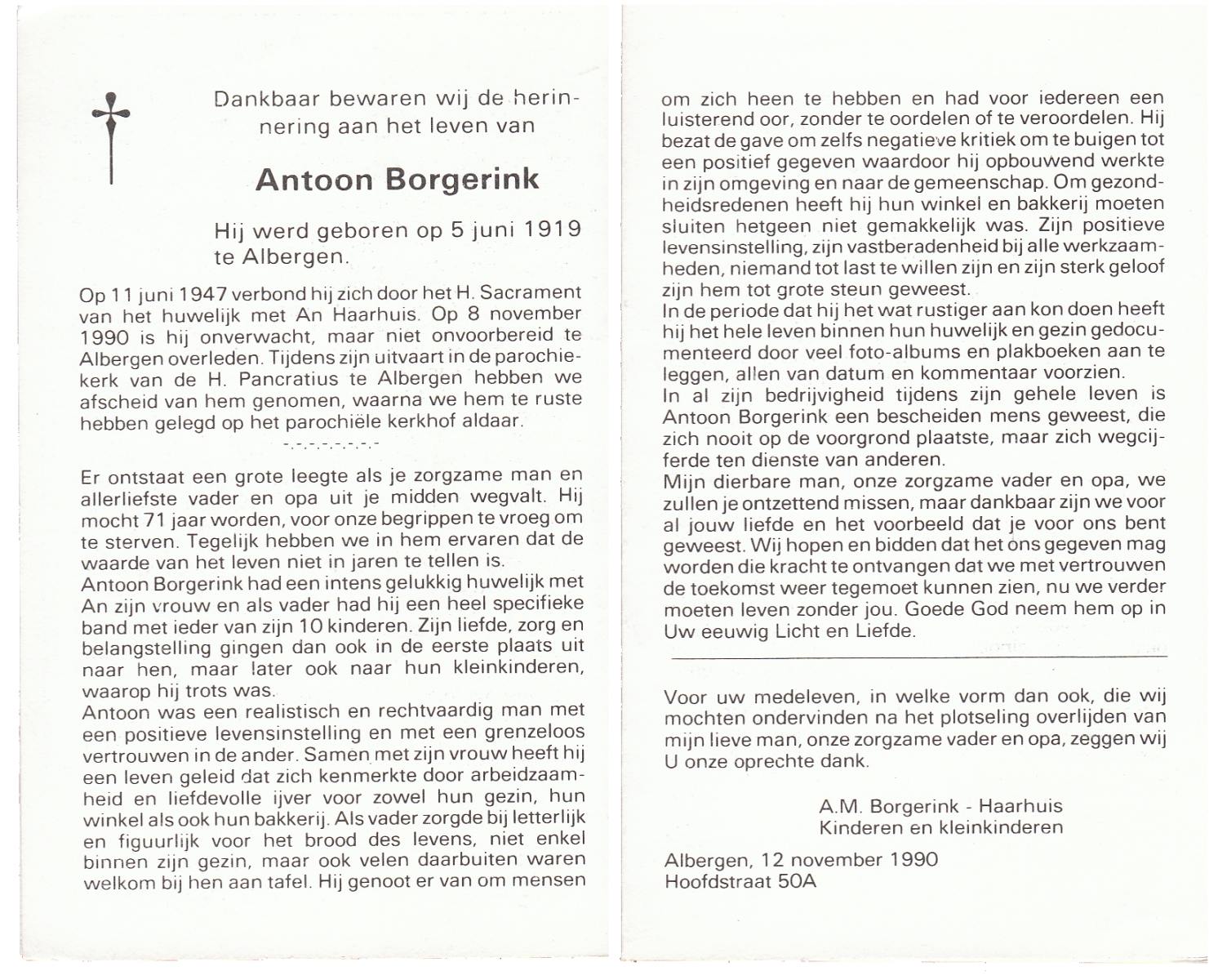 BORGERINK, Antoon, geboren op 5-6-1919 te Albergen, overleden op 8-11-1990 te Albergen op 71-jarige leeftijd, begraven te Albergen.