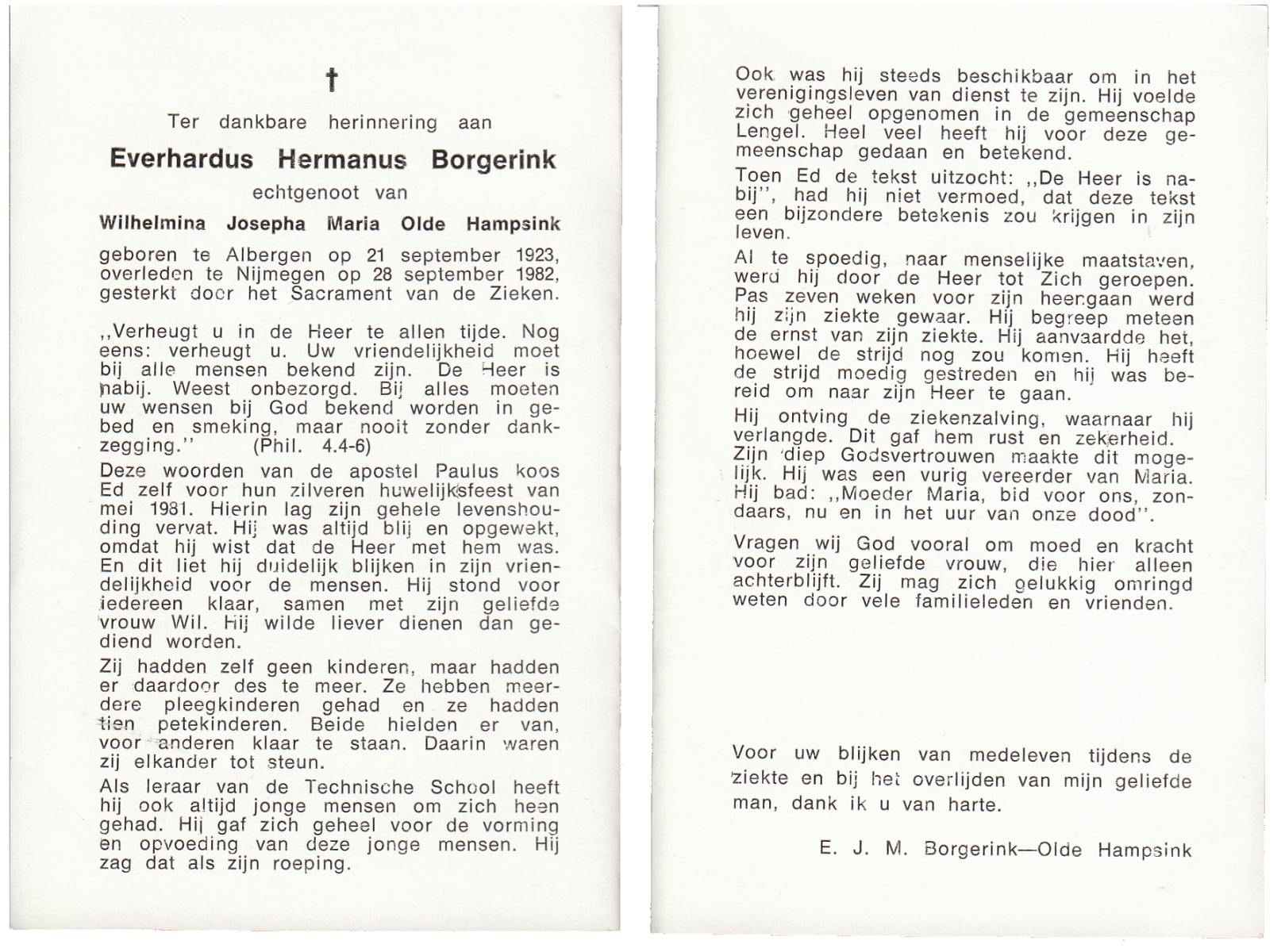 BORGERINK, Everhardus Hermanus, geboren op 21-9-1923 te Albergen, overleden op 28-9-1982 te Nijmegen op 59-jarige leeftijd.