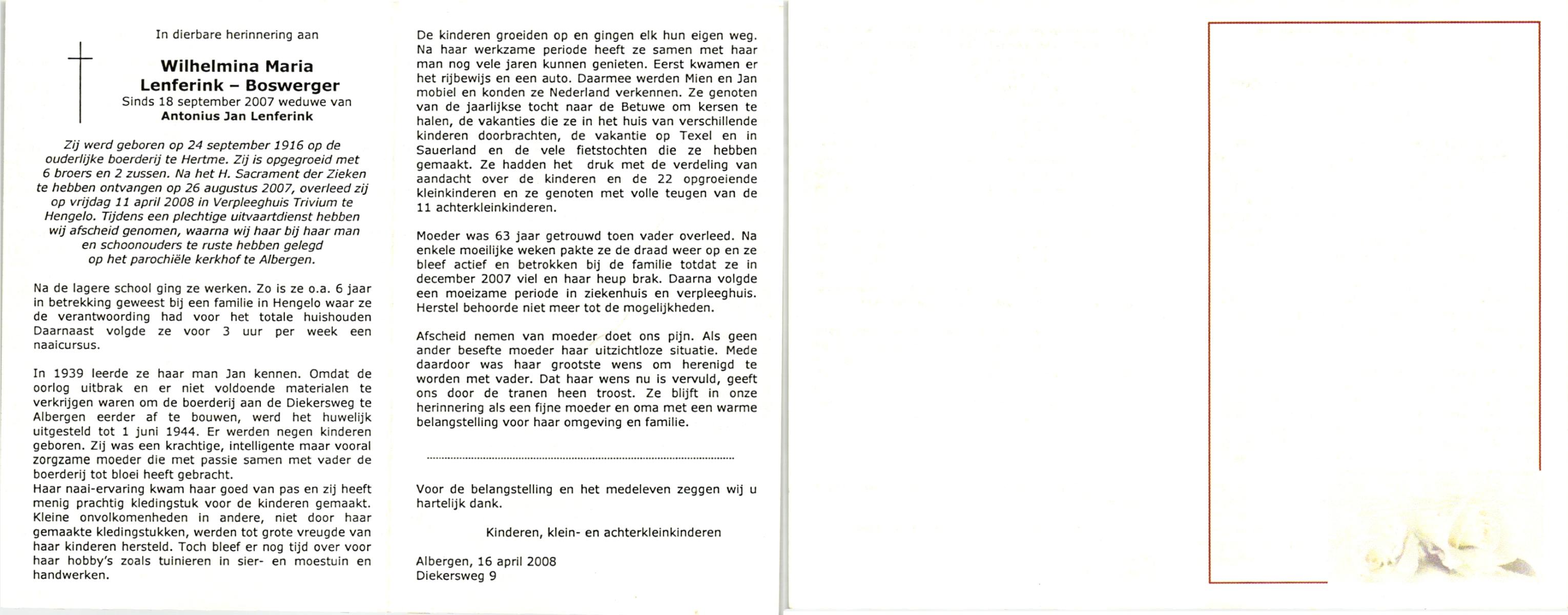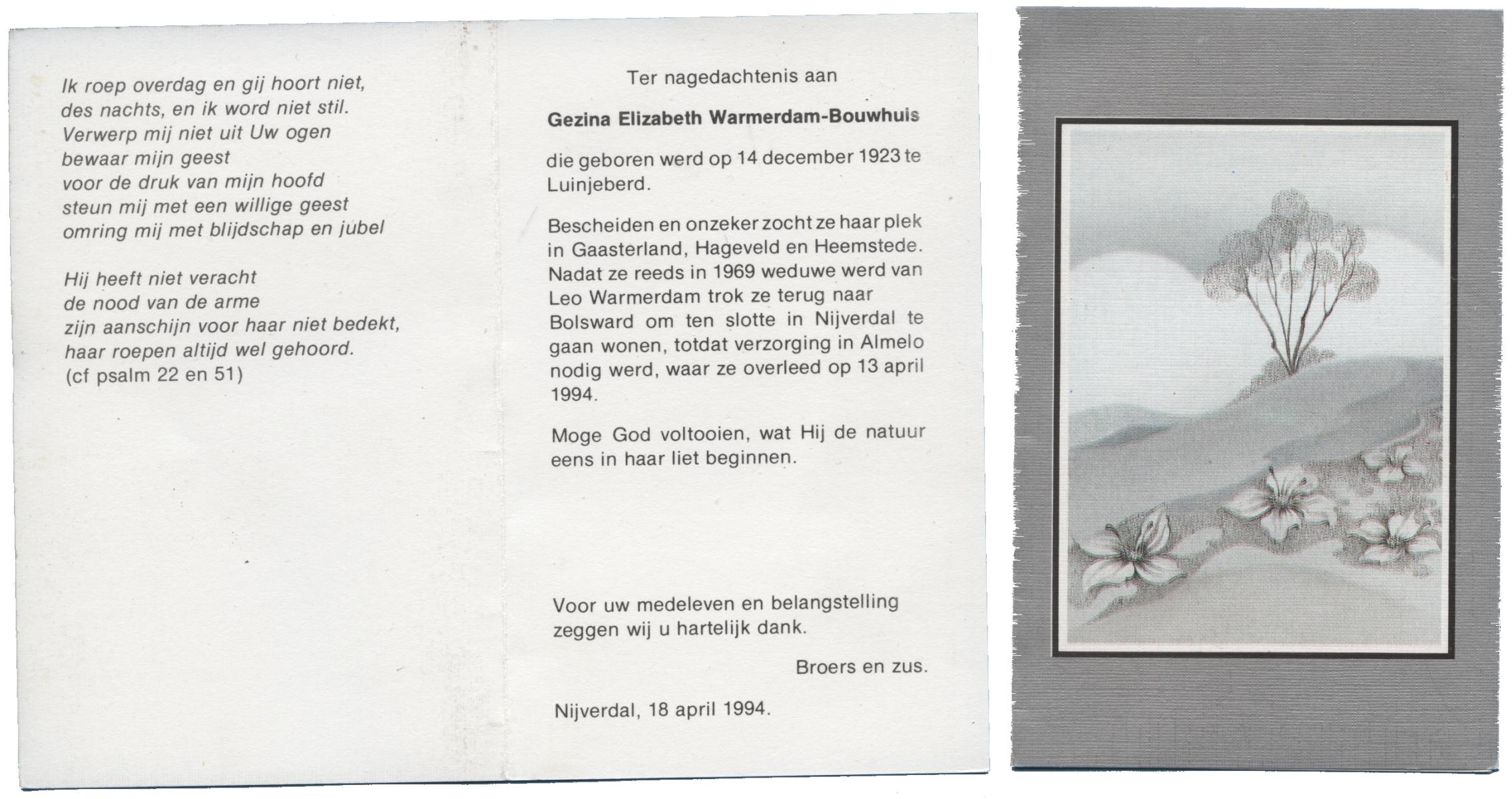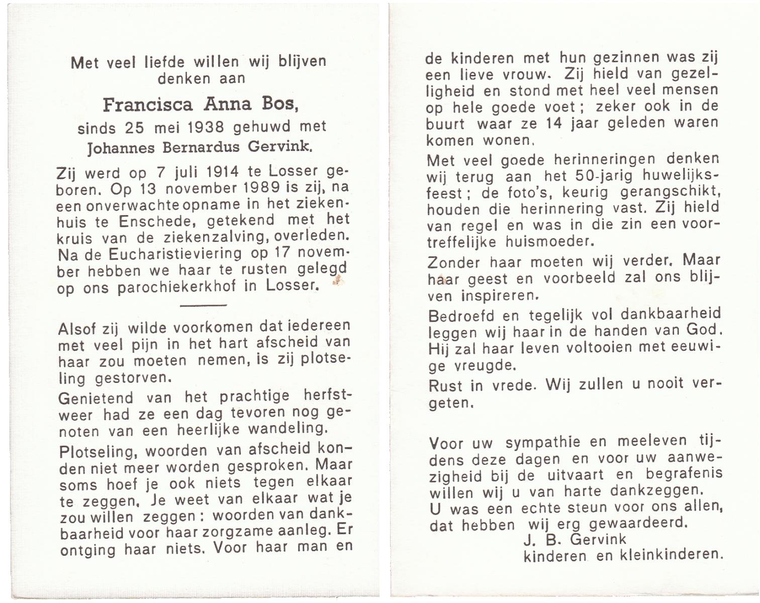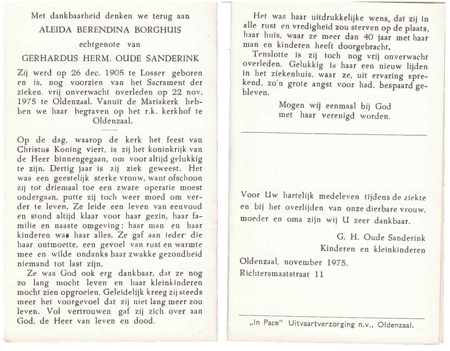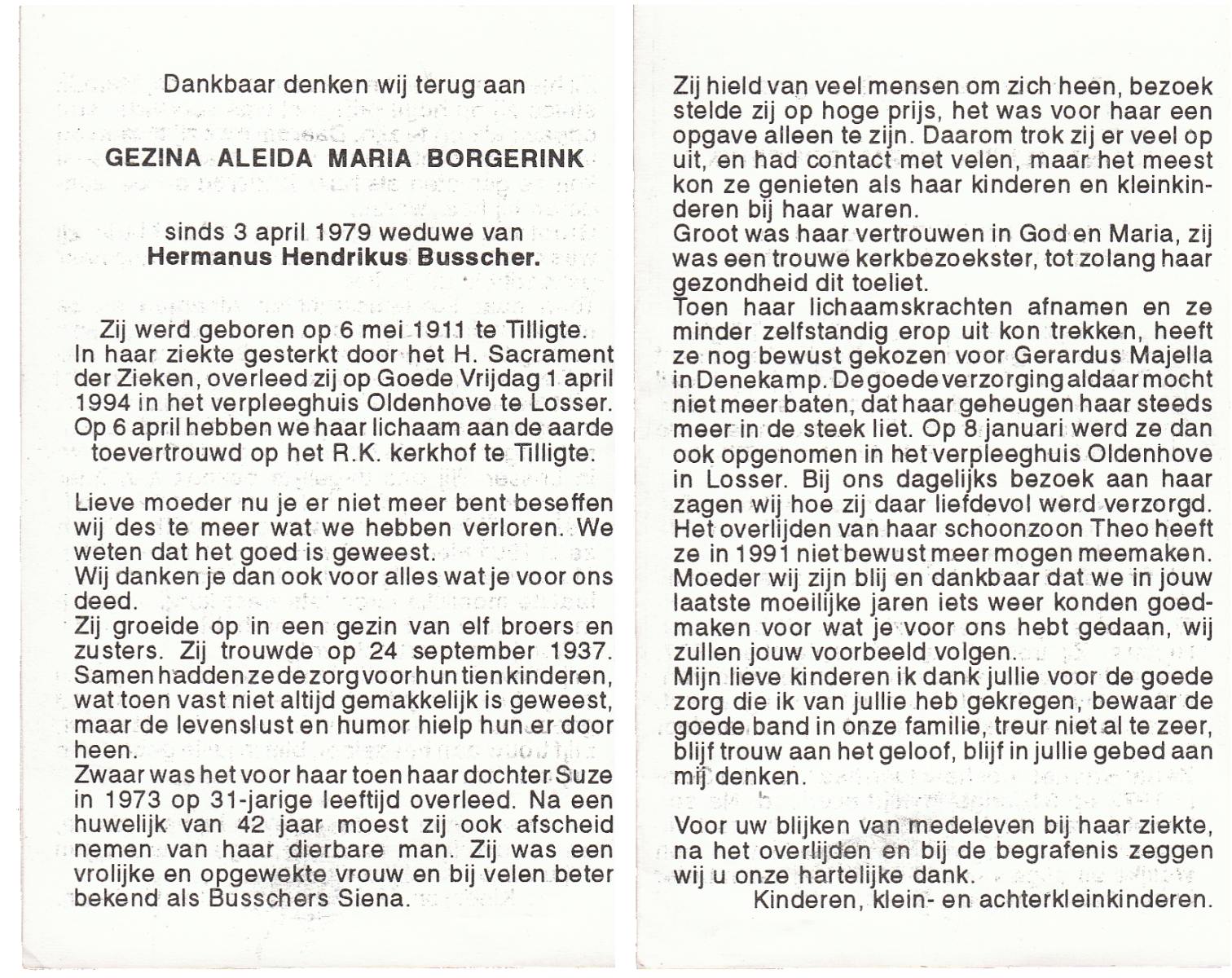 BORGERINK, Gezina Aleida Maria, geboren op 6-5-1911 te Tilligte, overleden op 1-4-1994 te Losser op 83-jarige leeftijd, begraven op 6-4-1994 te Tilligte.