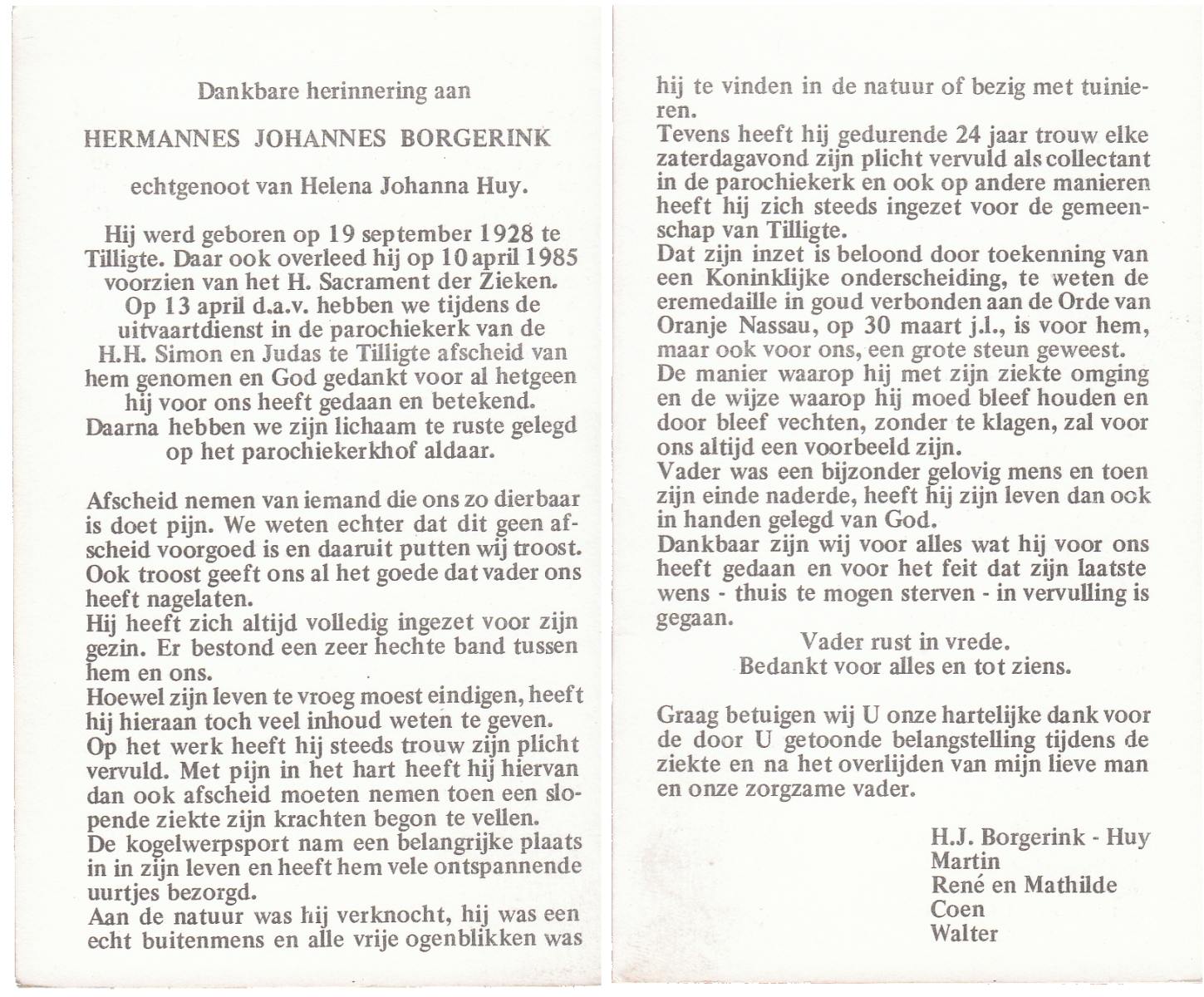 BORGERINK, Hermannes Johannes, geboren op 19-9-1928 te Tilligte, overleden op 10-4-1985 te Tilligte op 57-jarige leeftijd, begraven op 13-4-1985 te Tilligte.