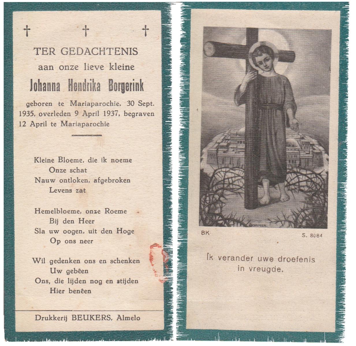 BORGERINK, Johanna Hendrika, geboren op 30-9-1935 te Mariaparochie, overleden op 9-4-1937 te Mariaparochie op 1-jarige leeftijd, begraven op 12-4-1937 te Mariaparochie.