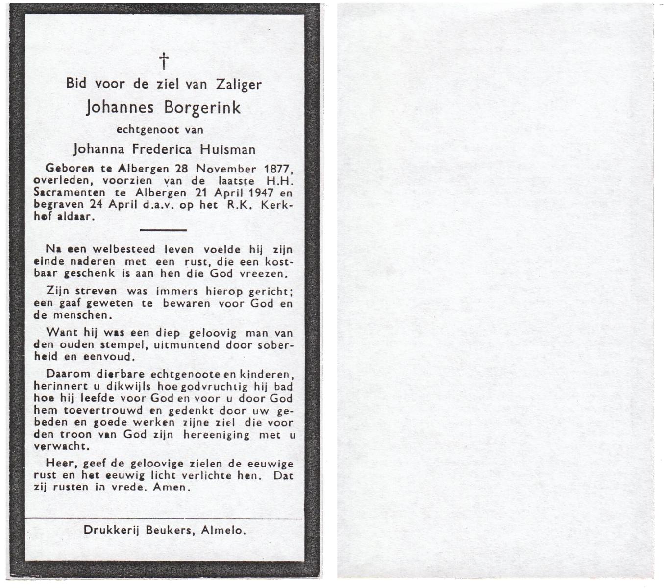 BORGERINK, Johannes, geboren op 28-11-1877 te Albergen, overleden op 21-4-1947 te Albergen op 69-jarige leeftijd, begraven op 24-4-1947 te Albergen.