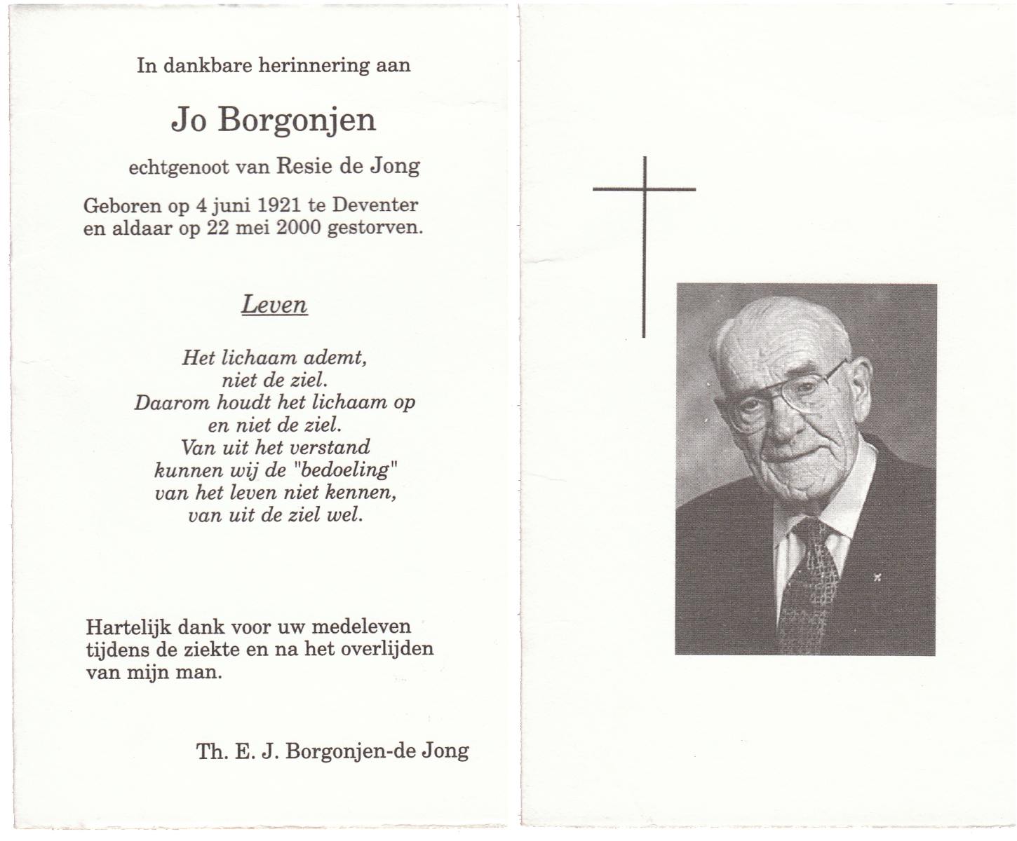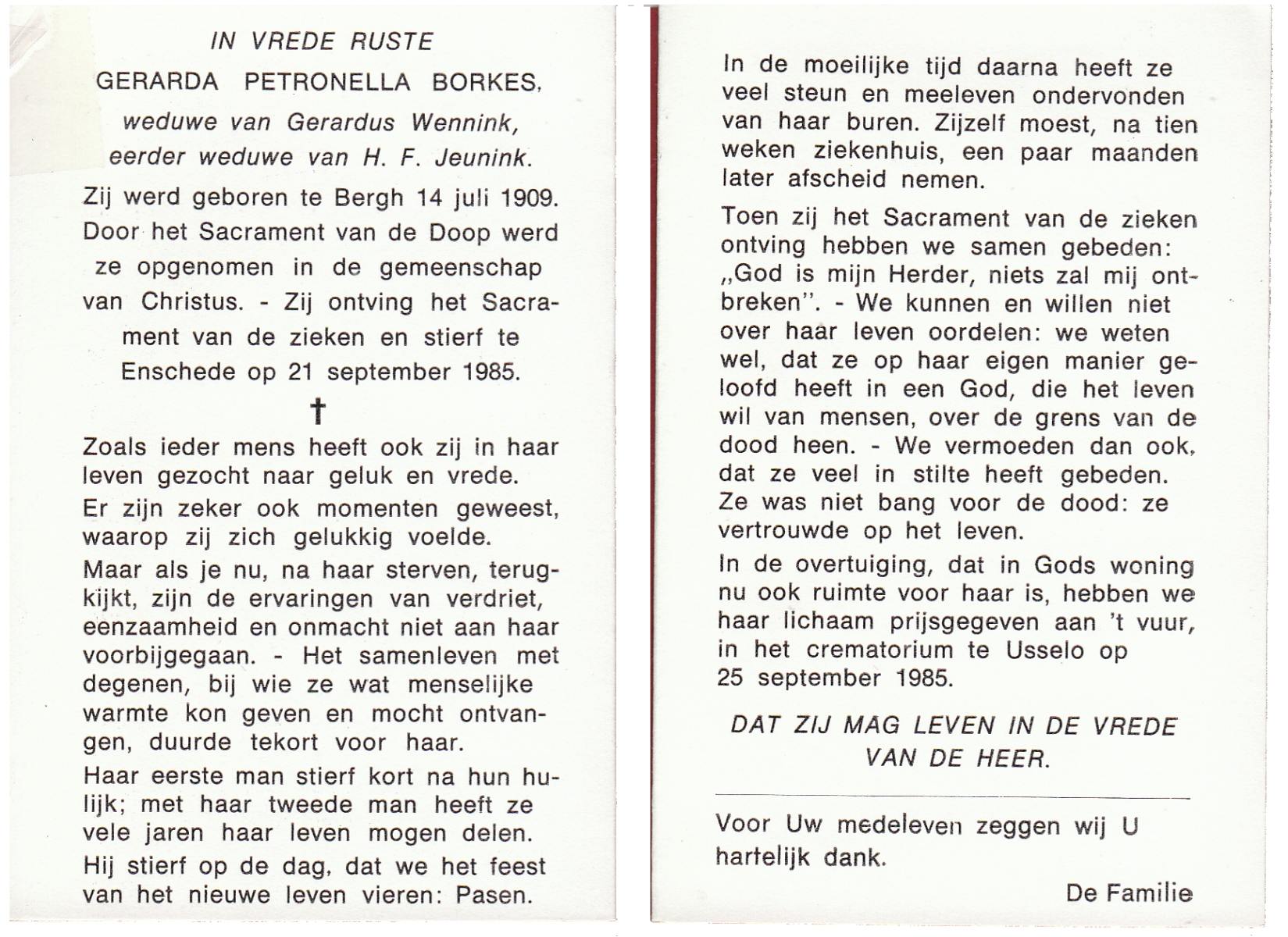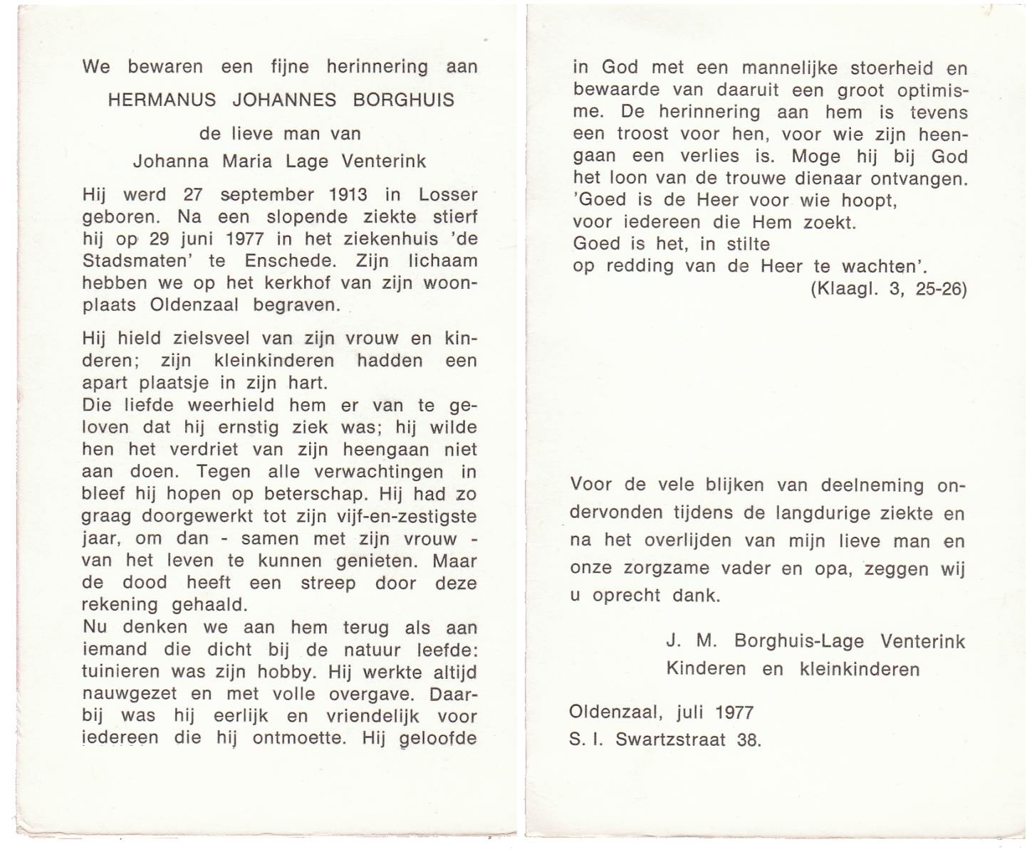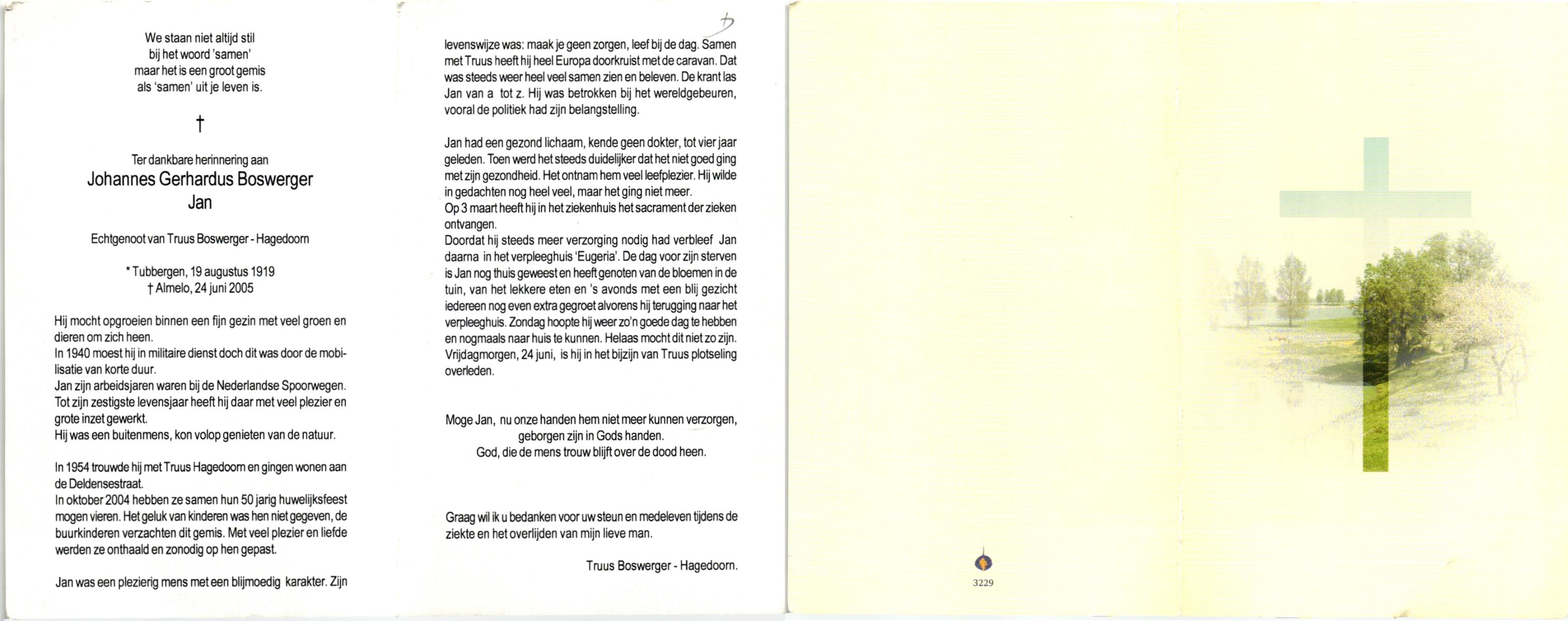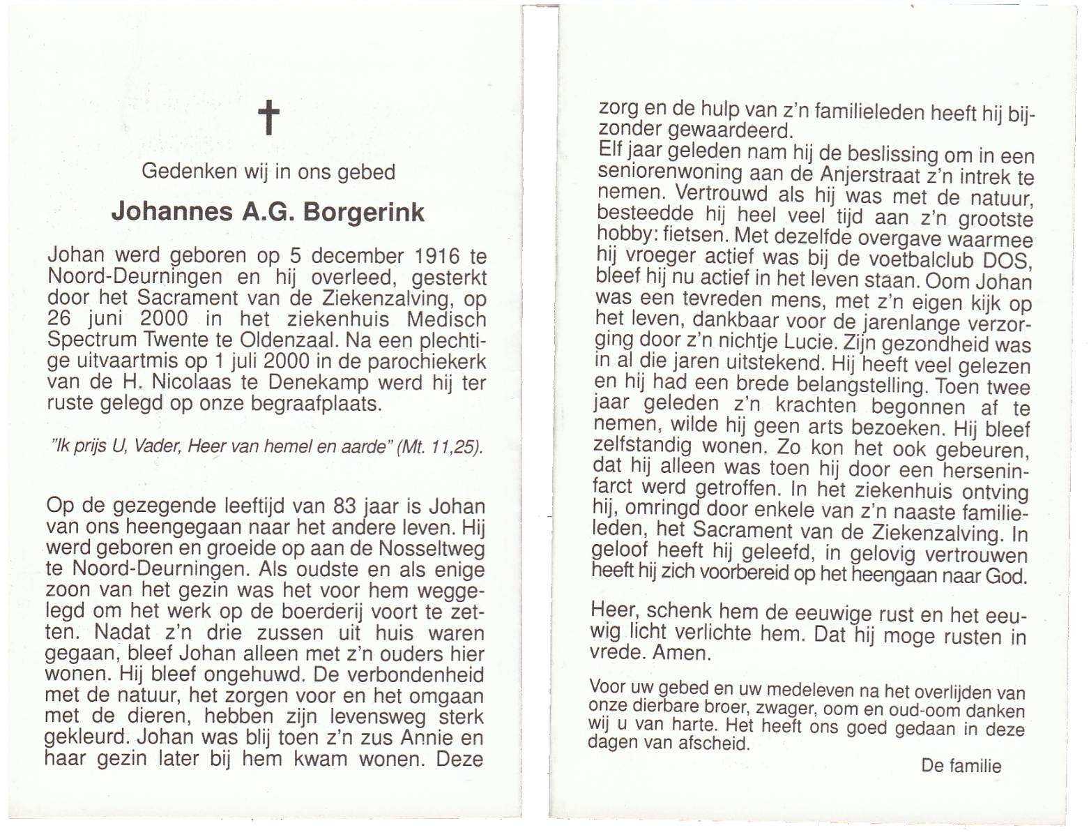 BORGERINK, Johannes A.G., geboren op 5-12-1916 te Noord Deurningen, overleden op 26-6-2000 te Oldenzaal op 83-jarige leeftijd, begraven op 1-7-2000 te Denekamp.