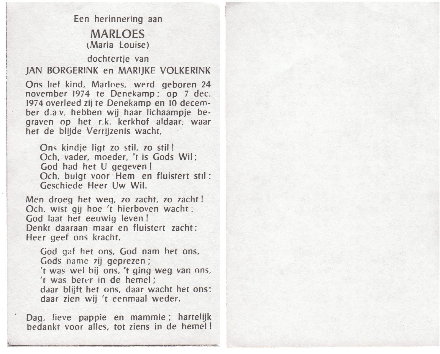 BORGERINK, Maria Louise (Marloes), geboren op 24-11-1974 te Denekamp, overleden op 7-12-1974 te Denekamp op 0-jarige leeftijd, begraven op 10-12-1974 te Denekamp.