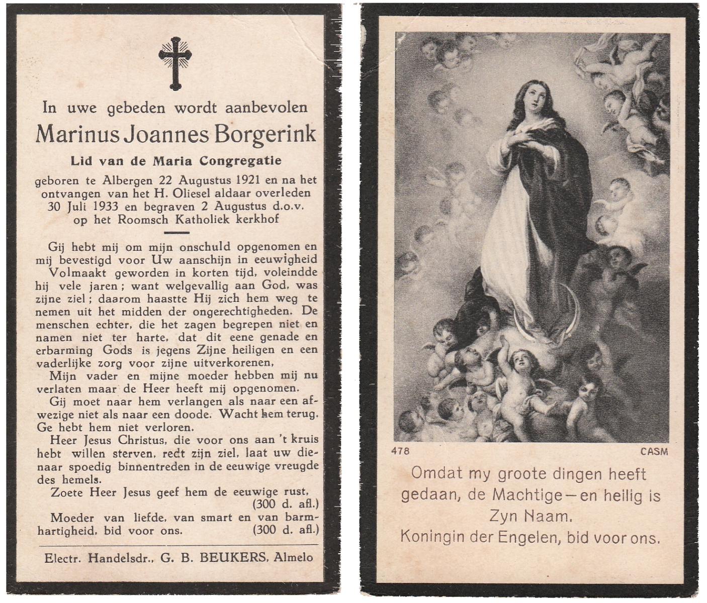 BORGERINK, Marinus Joannes, geboren op 22-8-1921 te Albergen, overleden op 30-7-1933 te Albergen op 12-jarige leeftijd, begraven op 2-8-1933 te Albergen.
