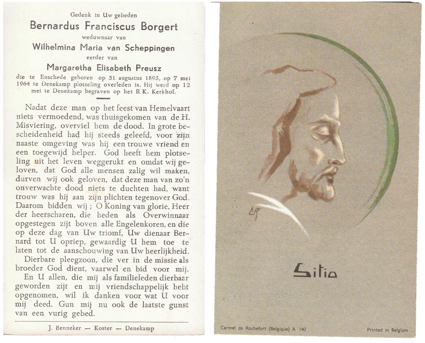 BORGERT, Bernardus Franciscus, geboren op 31-08-1893 te Enschede, overleden op 7-5-1964 te Denekamp op 71-jarige leeftijd, begraven op 12-5-1964 te Denekamp.