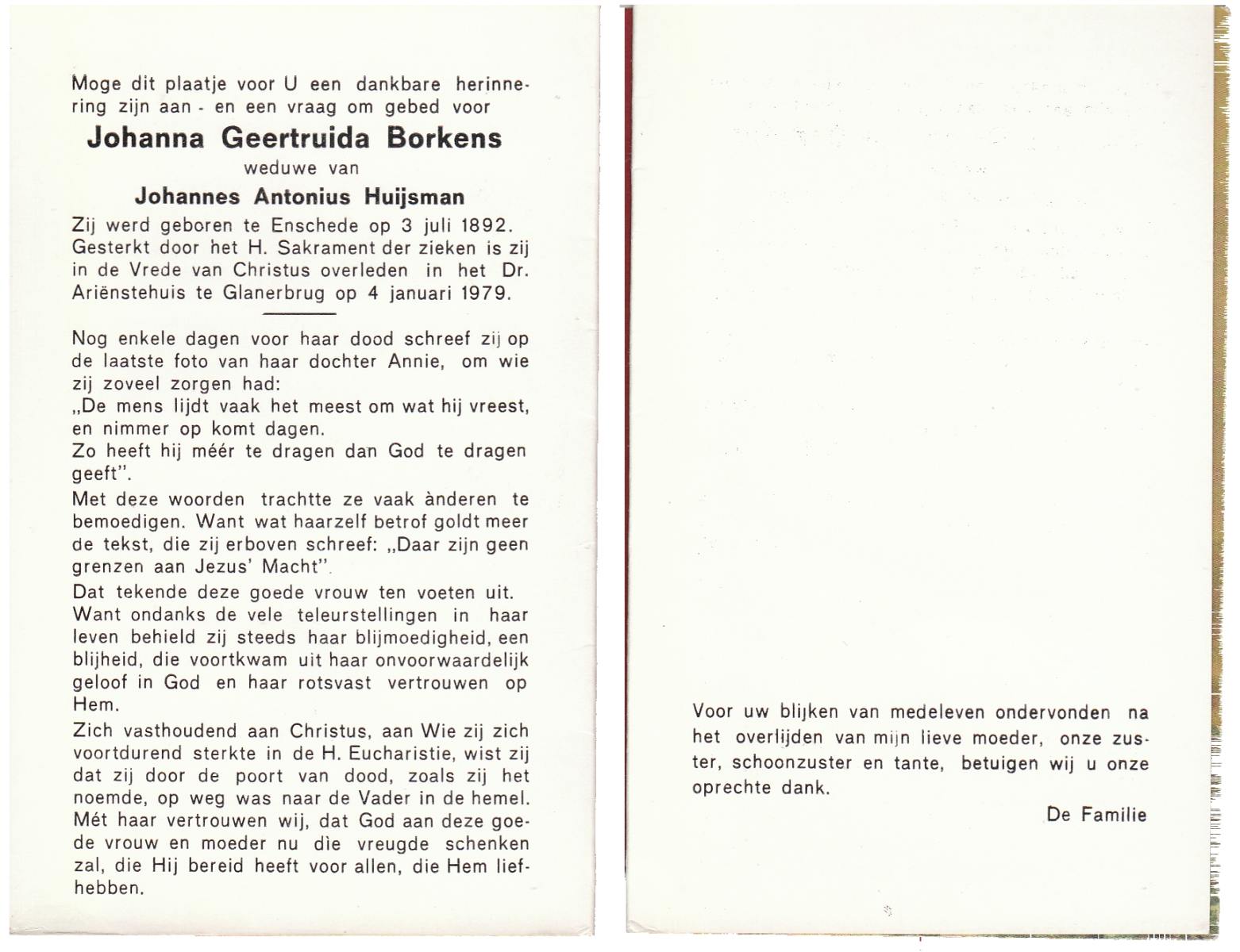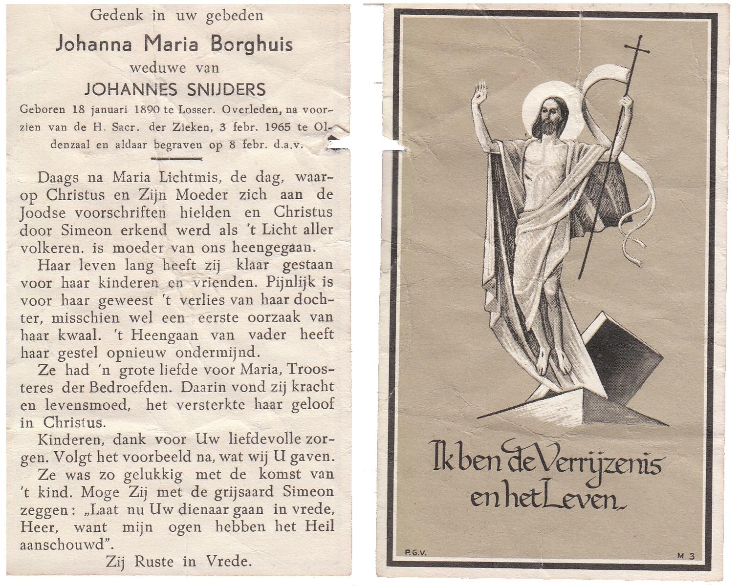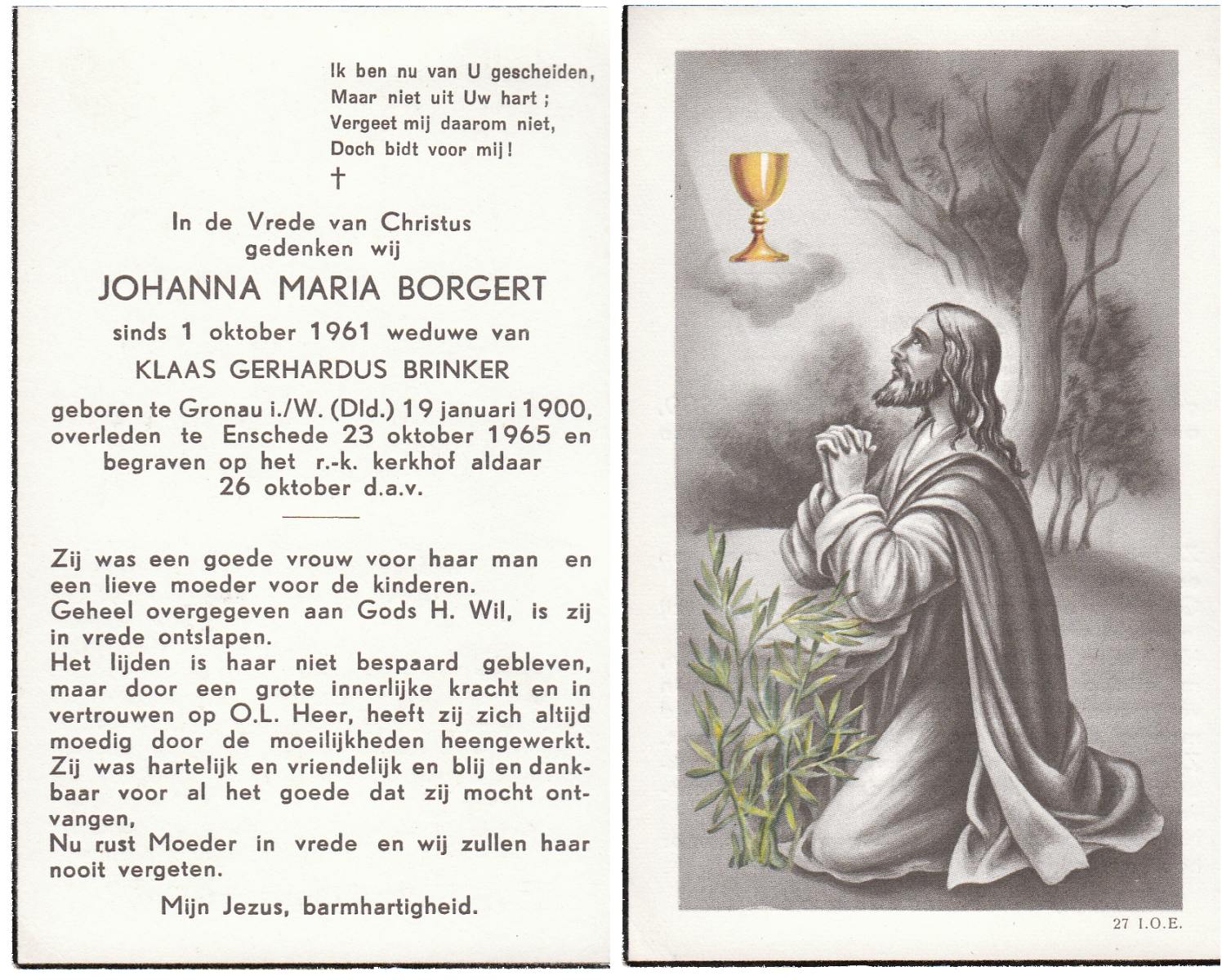 BORGERT, Johanna Maria, geboren op 19-1-1900 te Gronau (Dld.), overleden op 23-10-1965 te Enschede op 65-jarige leeftijd, begraven op 26-10-1965 te Enschede.