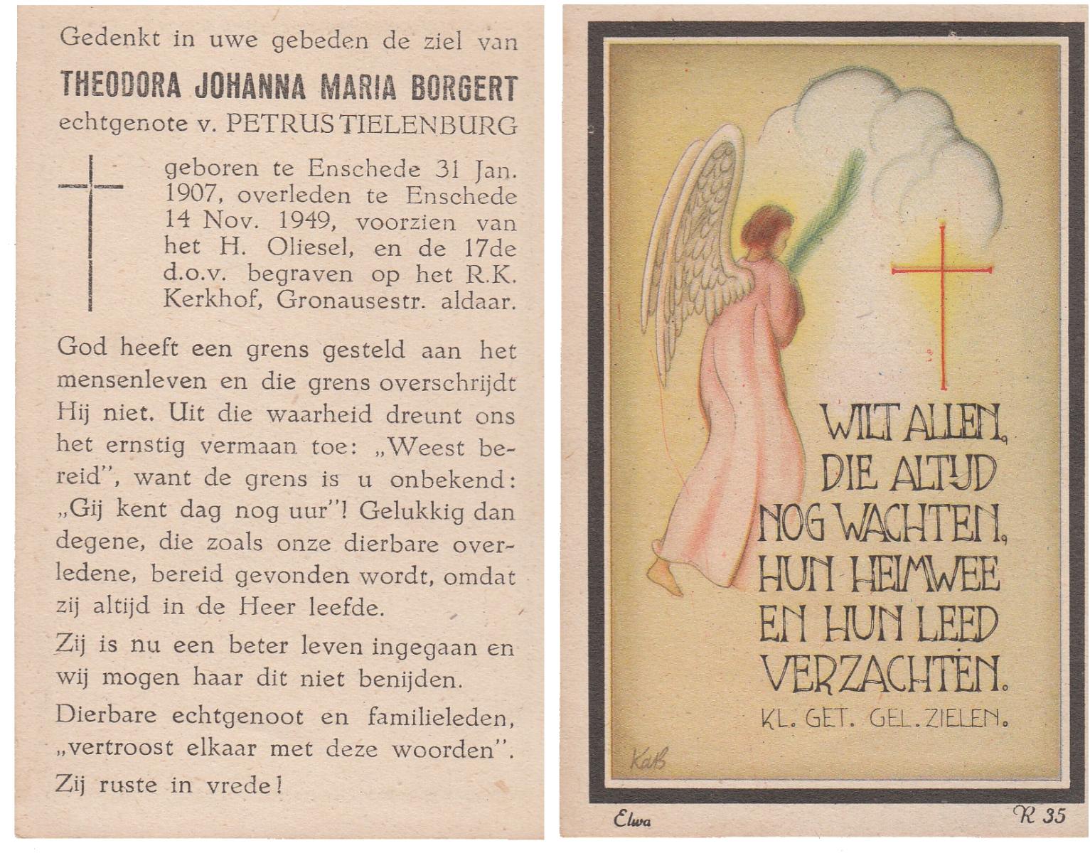 BORGERT, Theodoria Johanna Maria, geboren op 31-1-1907 te Enschede, overleden op 14-11-1949 te Enschede op 42-jarige leeftijd, begraven op 17-11-1949 te Enschede.