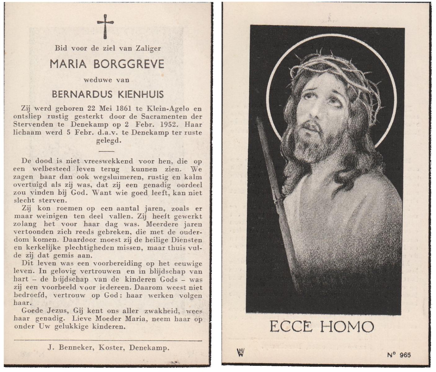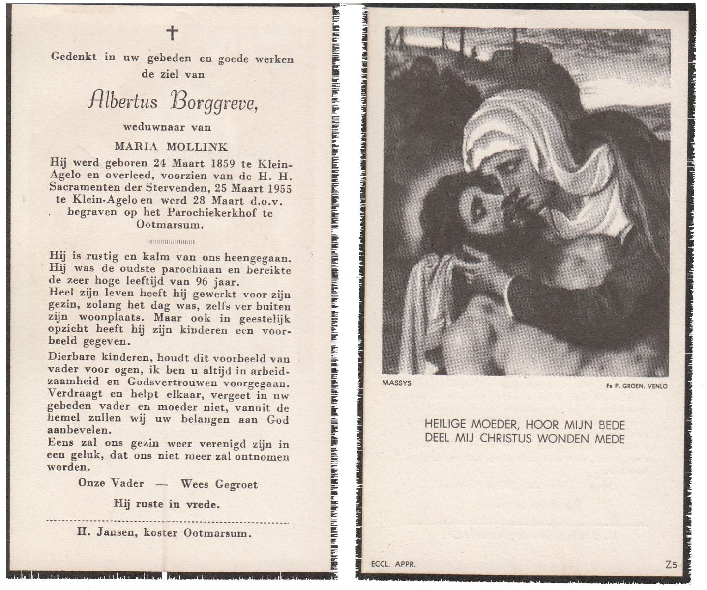 BORGGREVE, Albertus, geboren op 24-03-1859 te Klein Agelo, overleden op 25-3-1955 te Klein Agelo op 96-jarige leeftijd, begraven op 28-3-1955 te Ootmarsum.