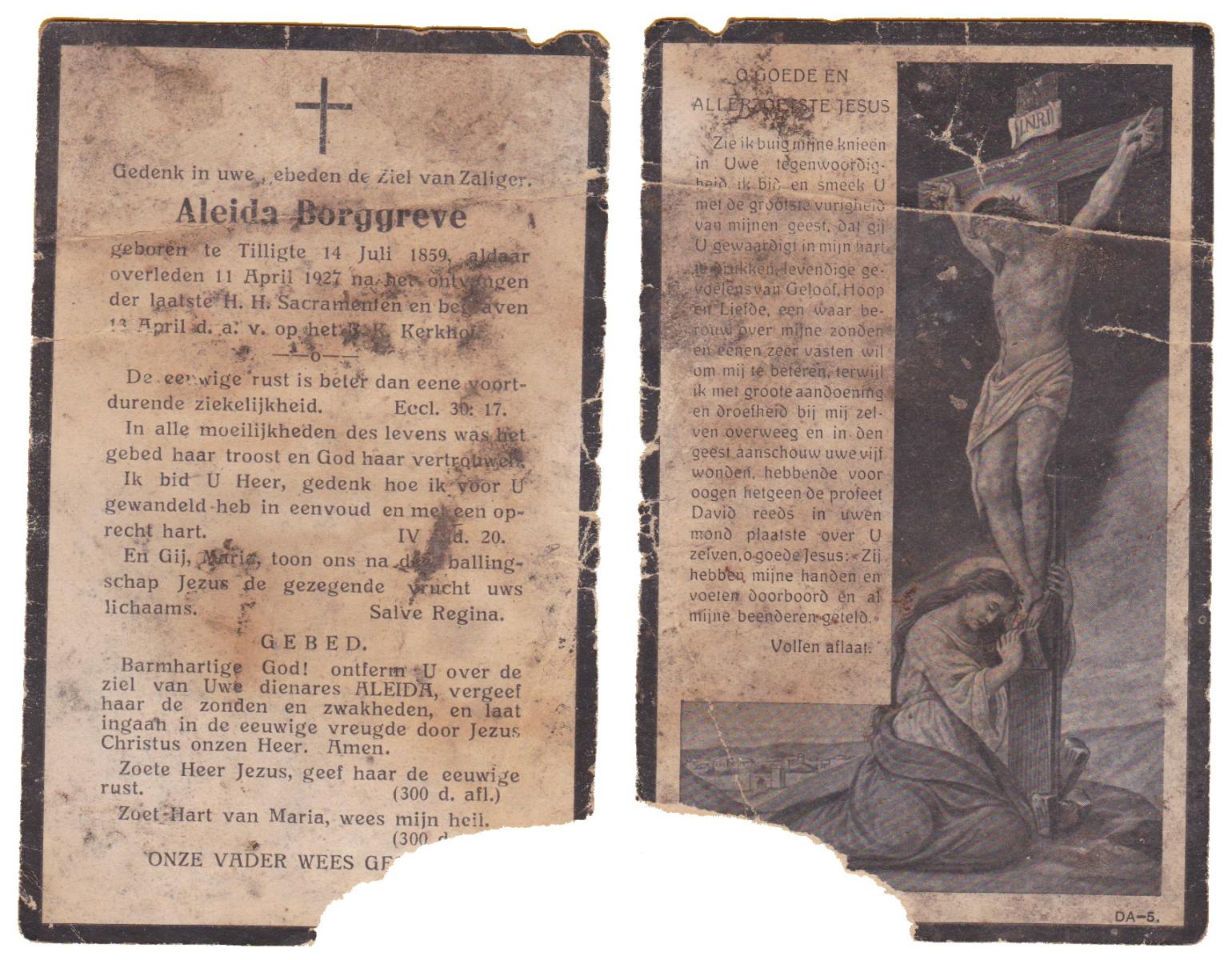BORGGREVE, Aleida, geboren op 14-07-1859 te Tilligte, overleden op 11-4-1927 te Tilligte op 67-jarige leeftijd, begraven op 13-4-1927 te Tilligte.