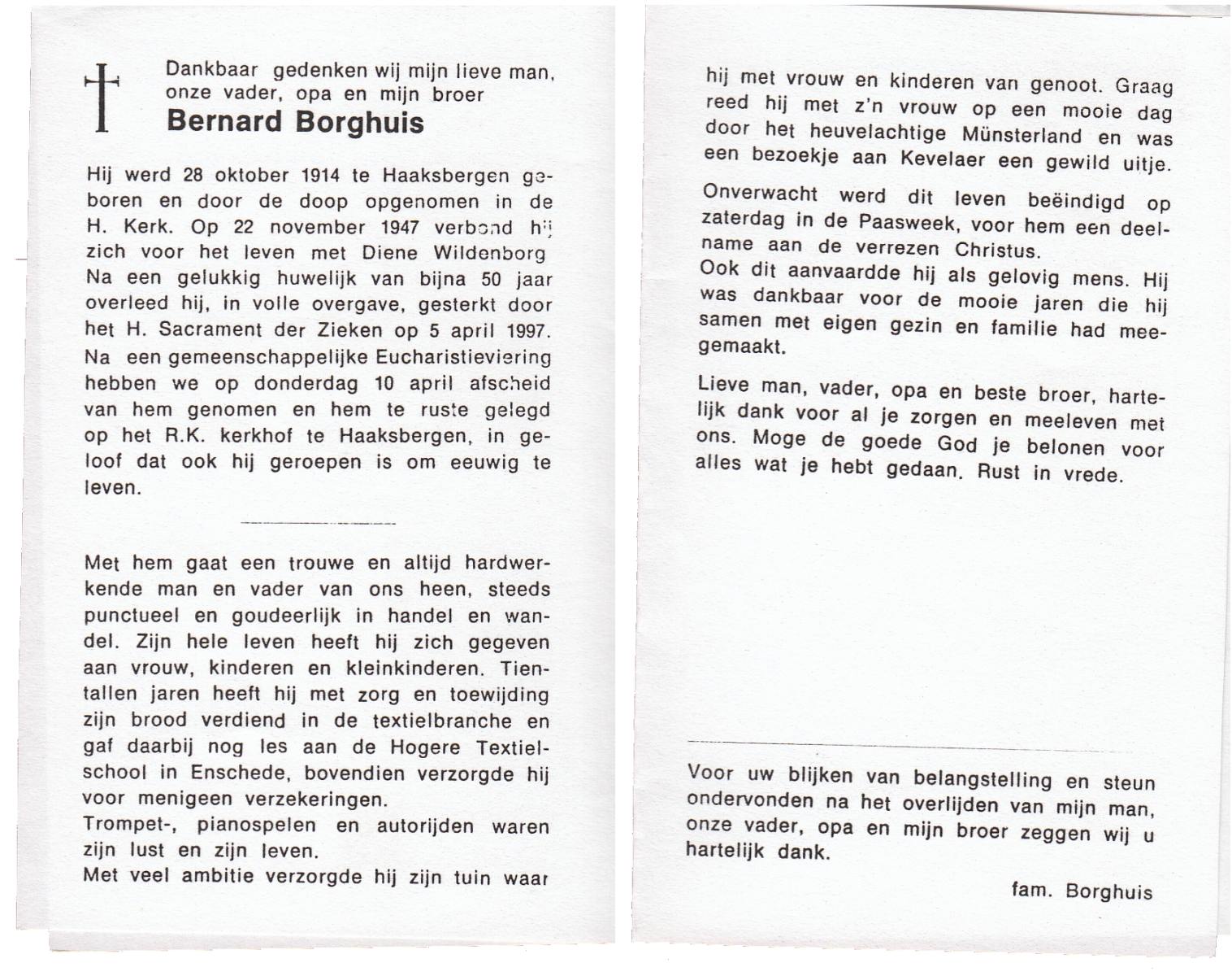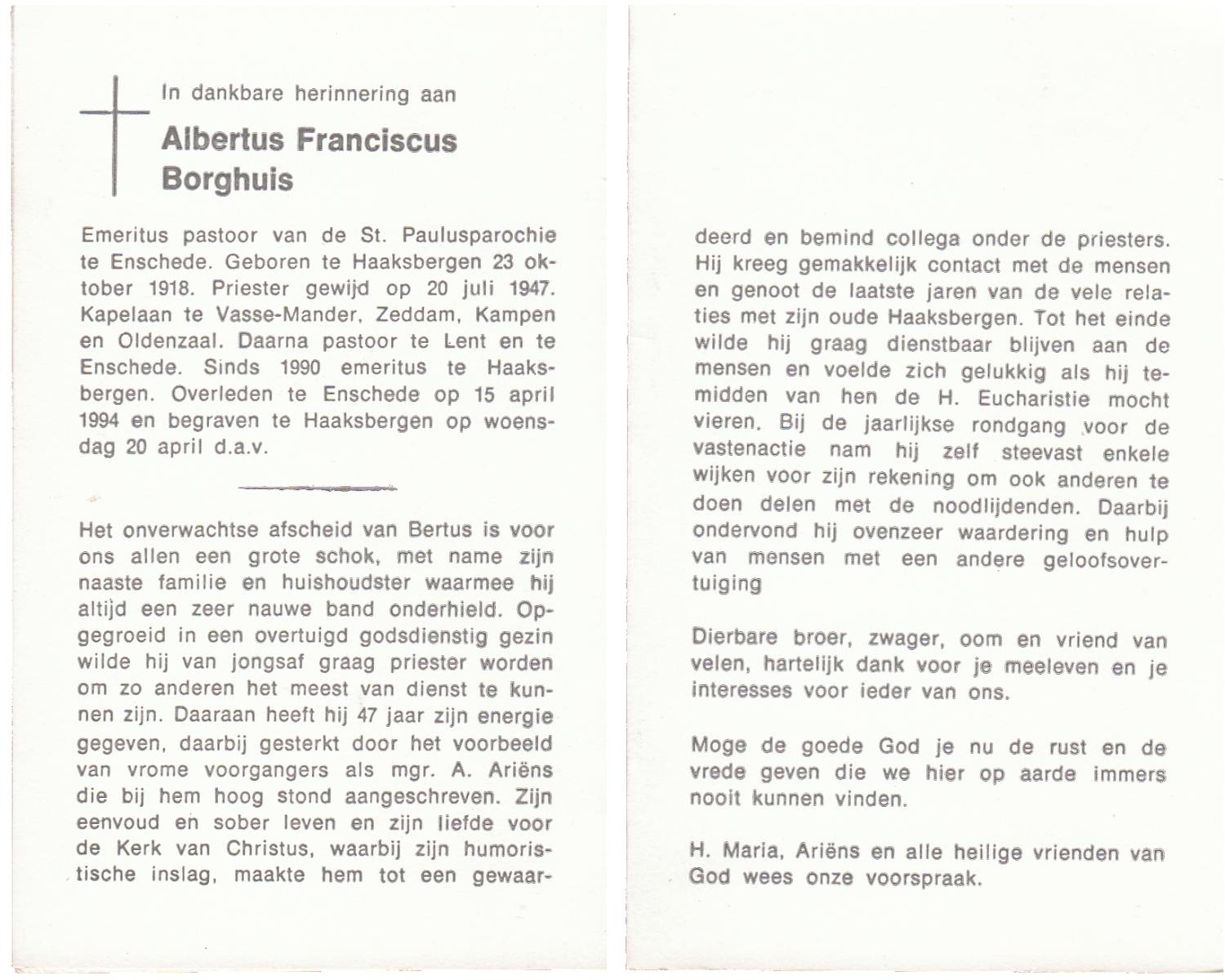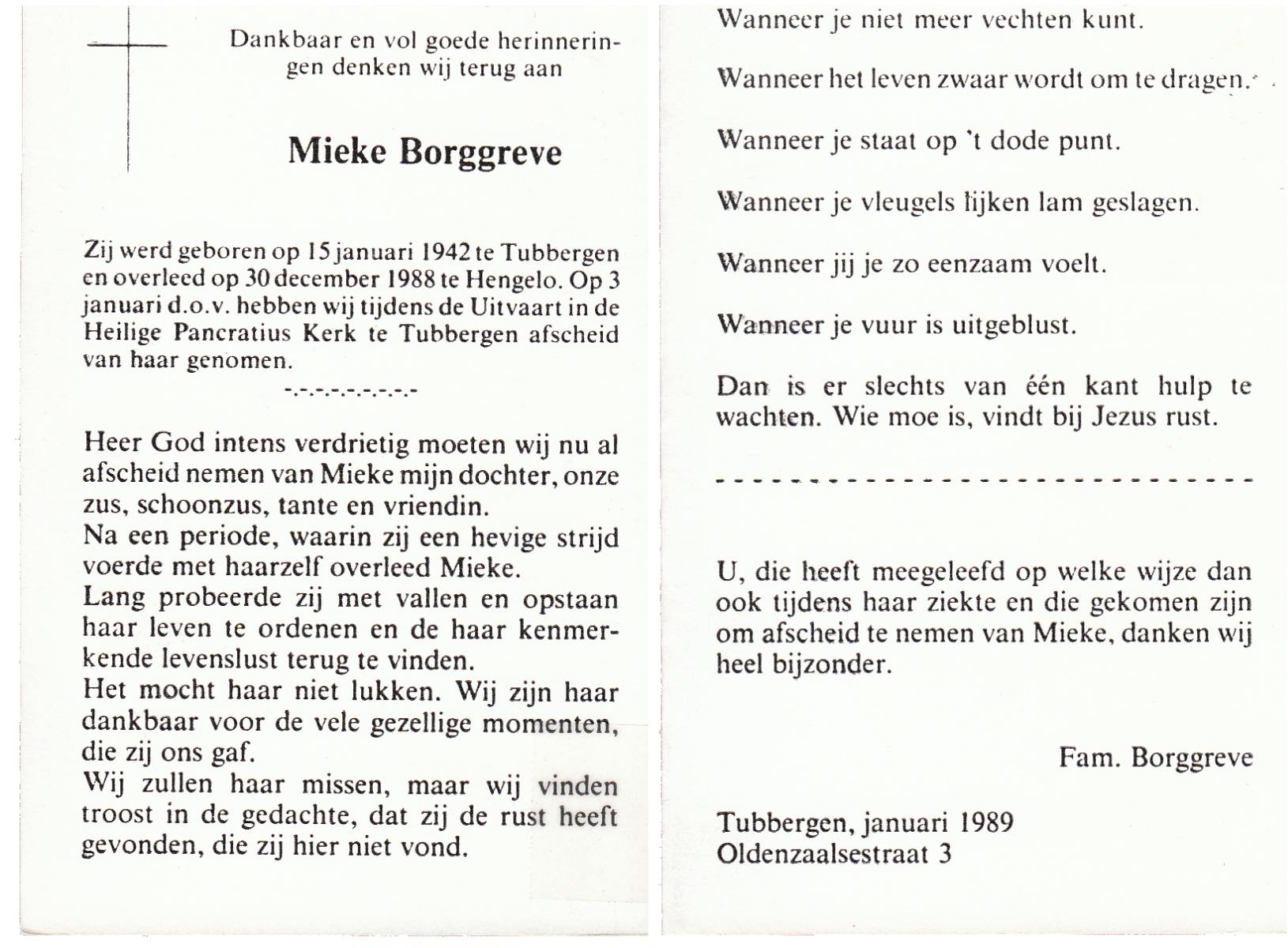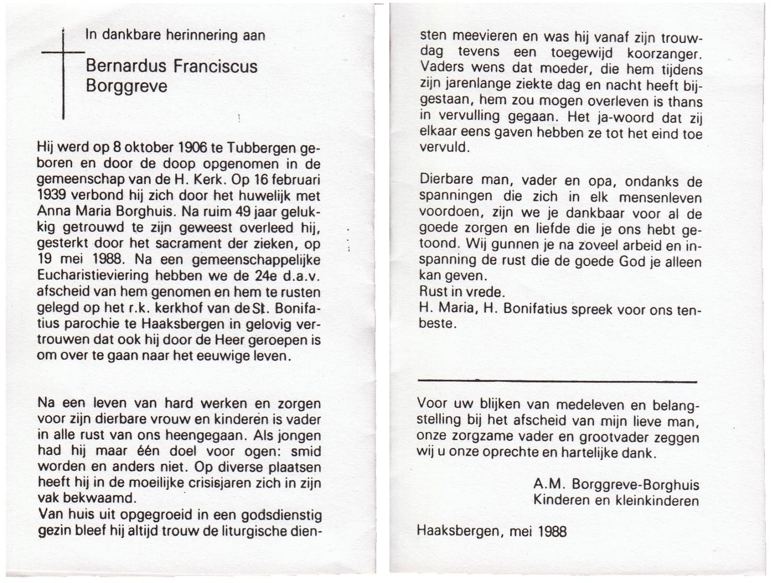BORGGREVE, Bernardus Franciscus, geboren op 8-10-1906 te Tubbergen, overleden op 19-5-1988 op 81-jarige leeftijd, begraven op 24-5-1988 te Haaksbergen.