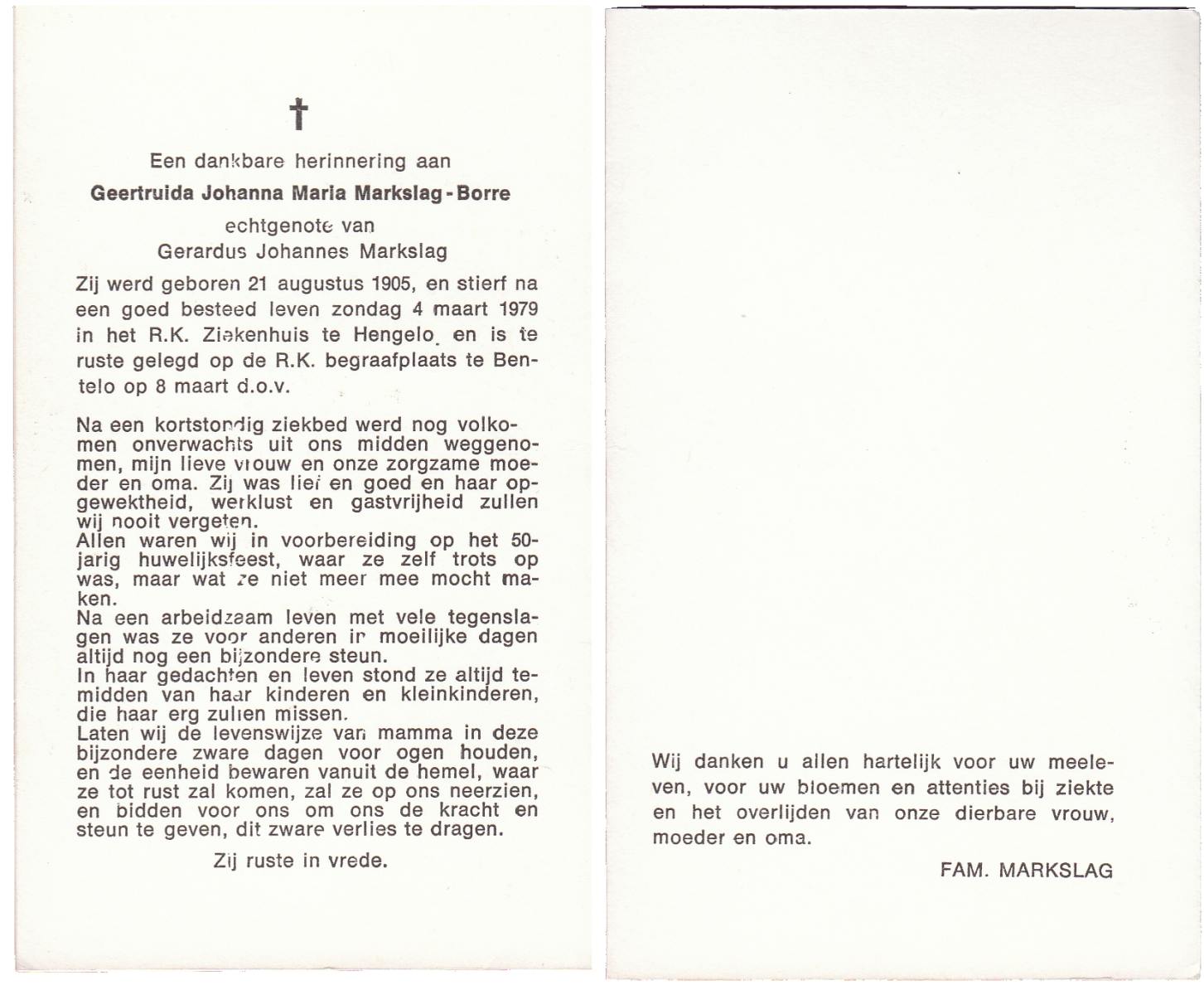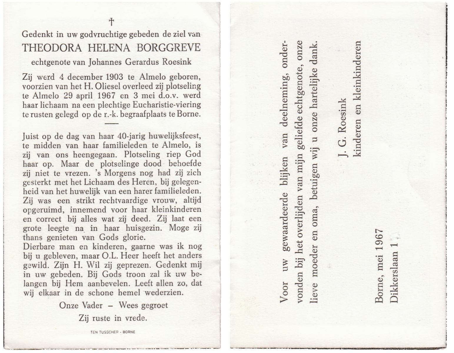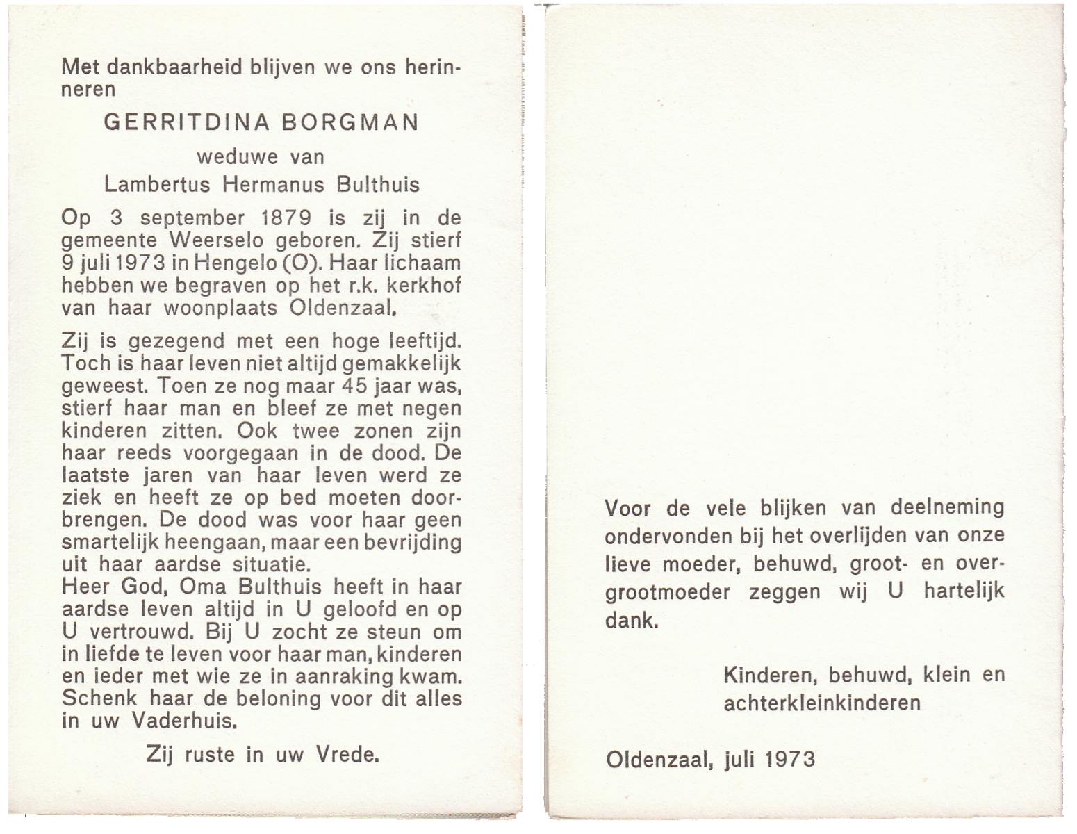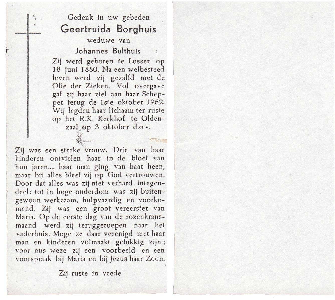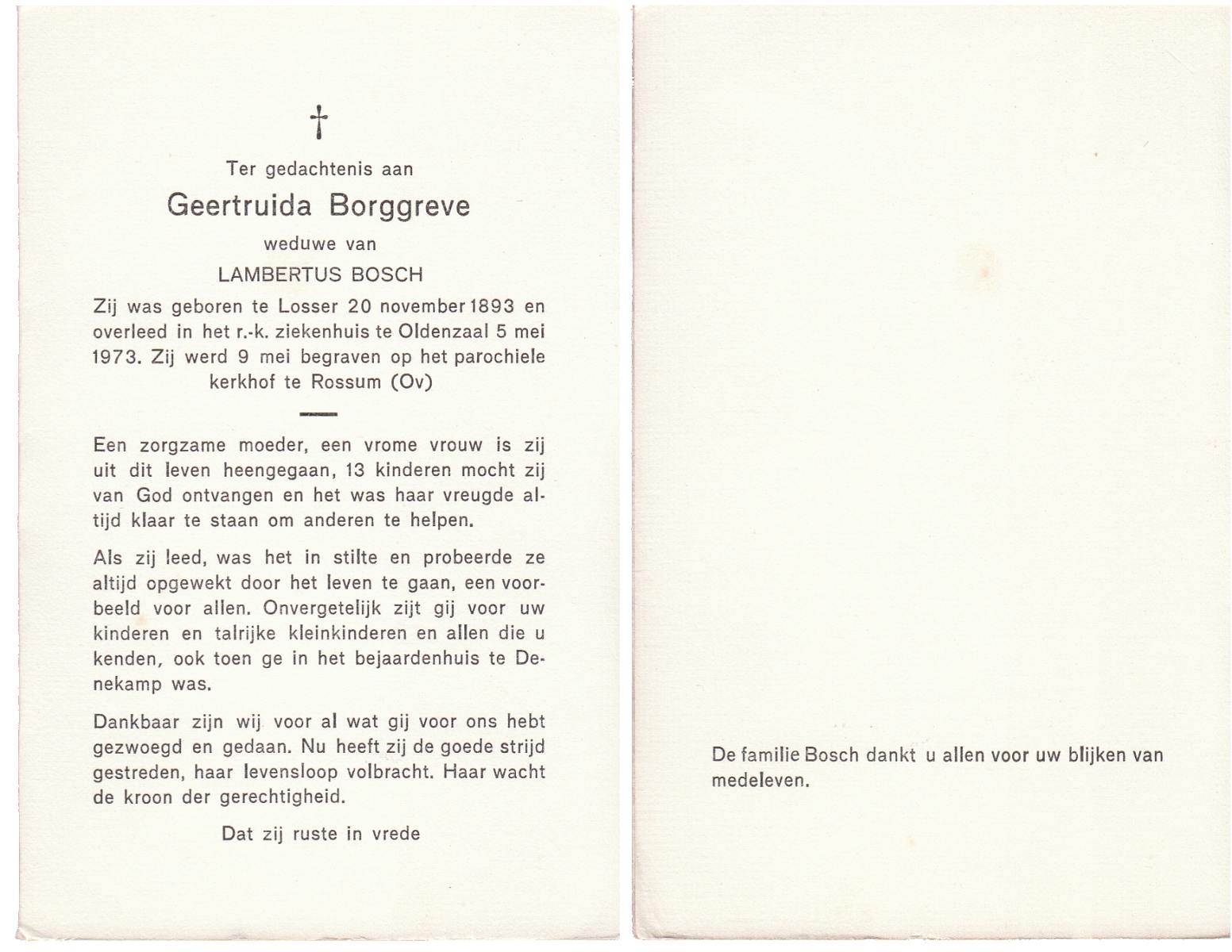 BORGGREVE, Geertruida, geboren op 20-11-1893 te Losser, overleden op 5-5-1973 te Oldenzaal op 80-jarige leeftijd, begraven op 9-5-1973 te Rossum.
