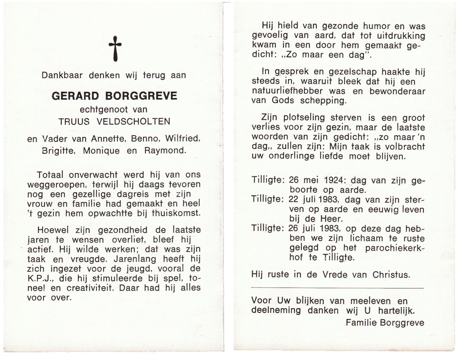 BORGGREVE, Gerard, geboren op 26-5-1924 te Tilligte, overleden op 22-7-1983 te Tilligte op 59-jarige leeftijd, begraven op 26-7-1983 te Tilligte.