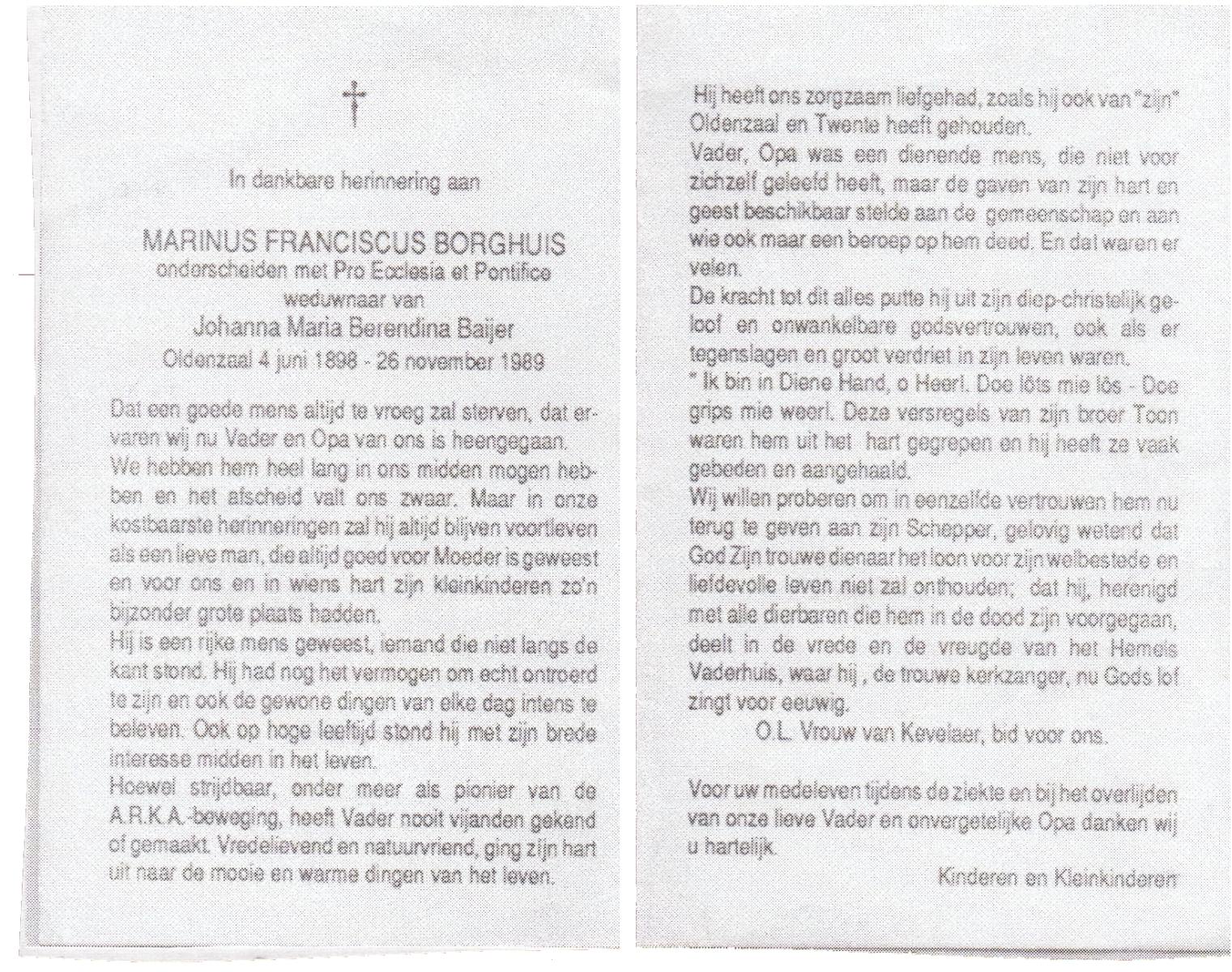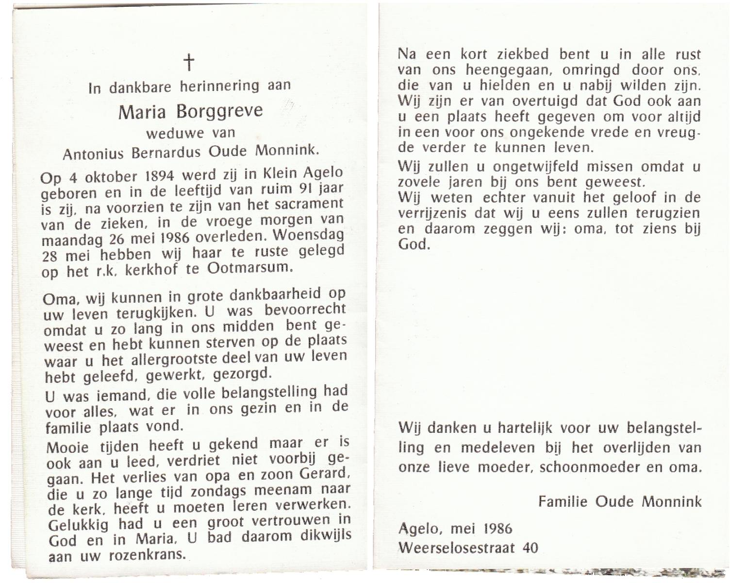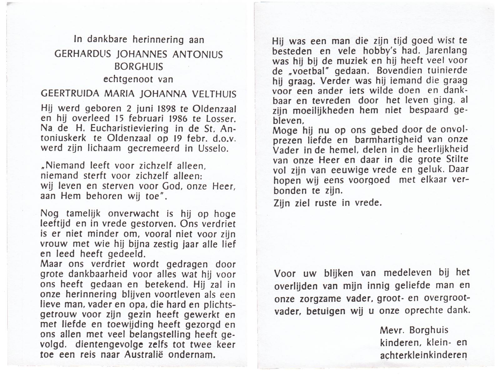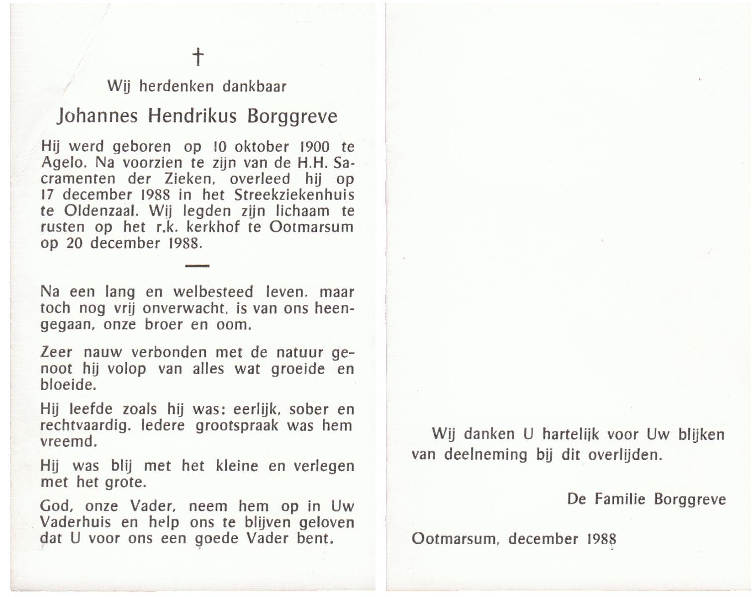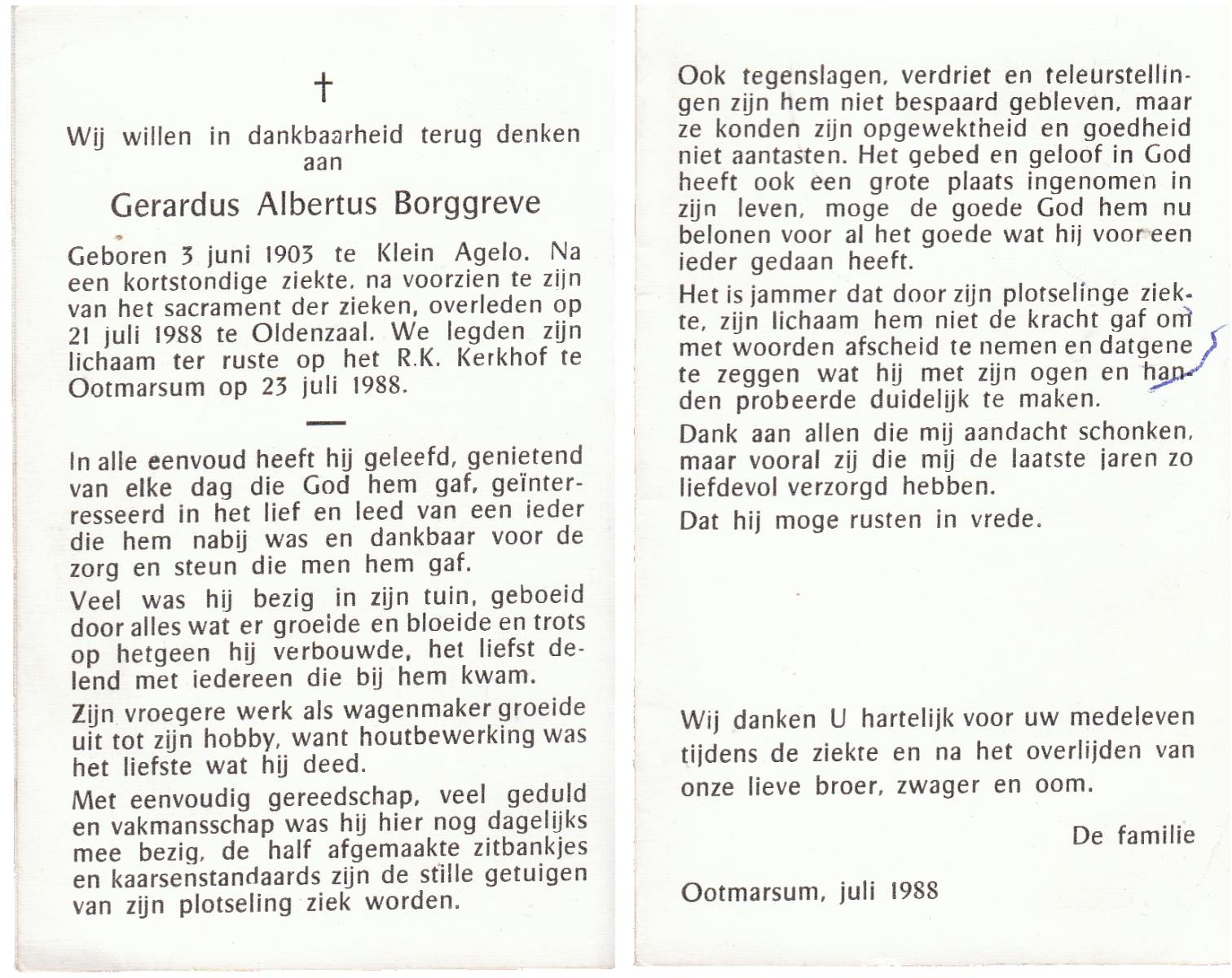 BORGGREVE, Gerardus Albertus, geboren op 3-6-1903 te Klein Agelo, overleden op 21-7-1988 te Oldenzaal op 85-jarige leeftijd, begraven op 23-7-1988 te Ootmarsum.