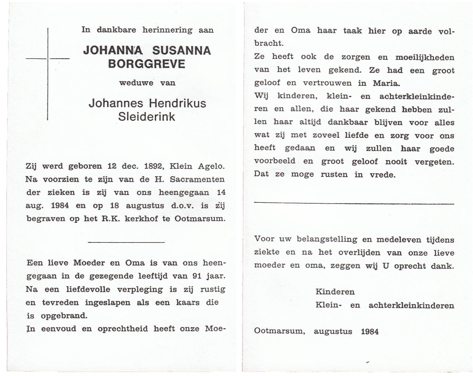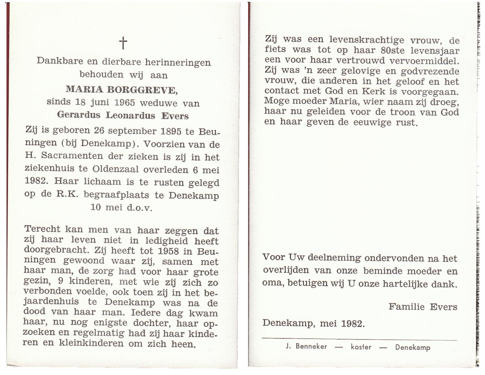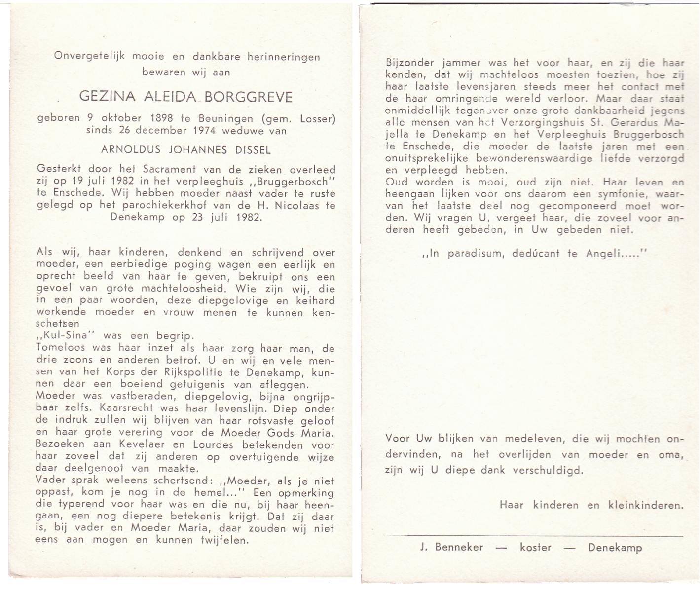 BORGGREVE, Gezina Aleida, geboren op 09-10-1898 te Beuningen (Ov.), overleden op 19-7-1982 te Enschede op 84-jarige leeftijd, begraven op 23-7-1982 te Denekamp.