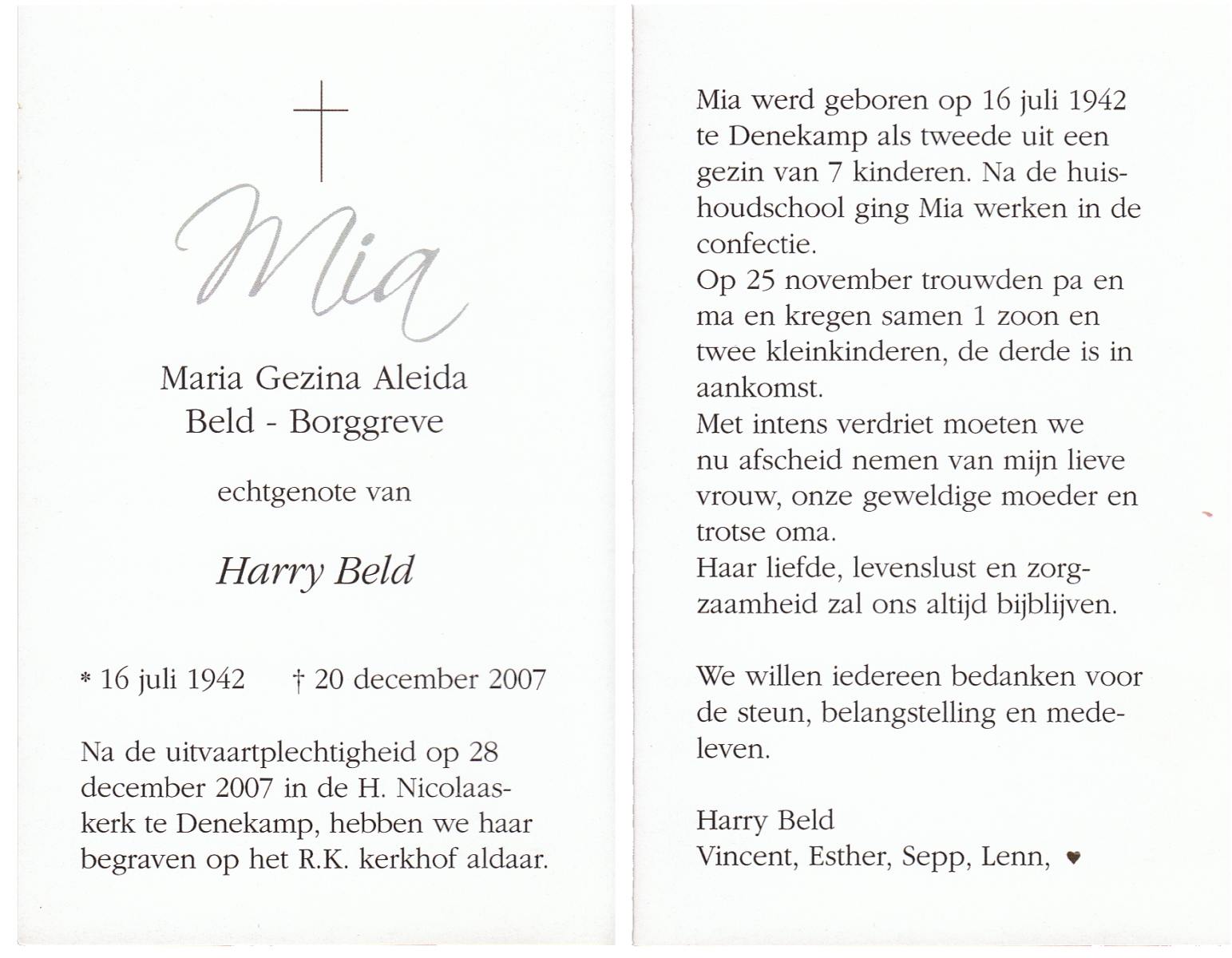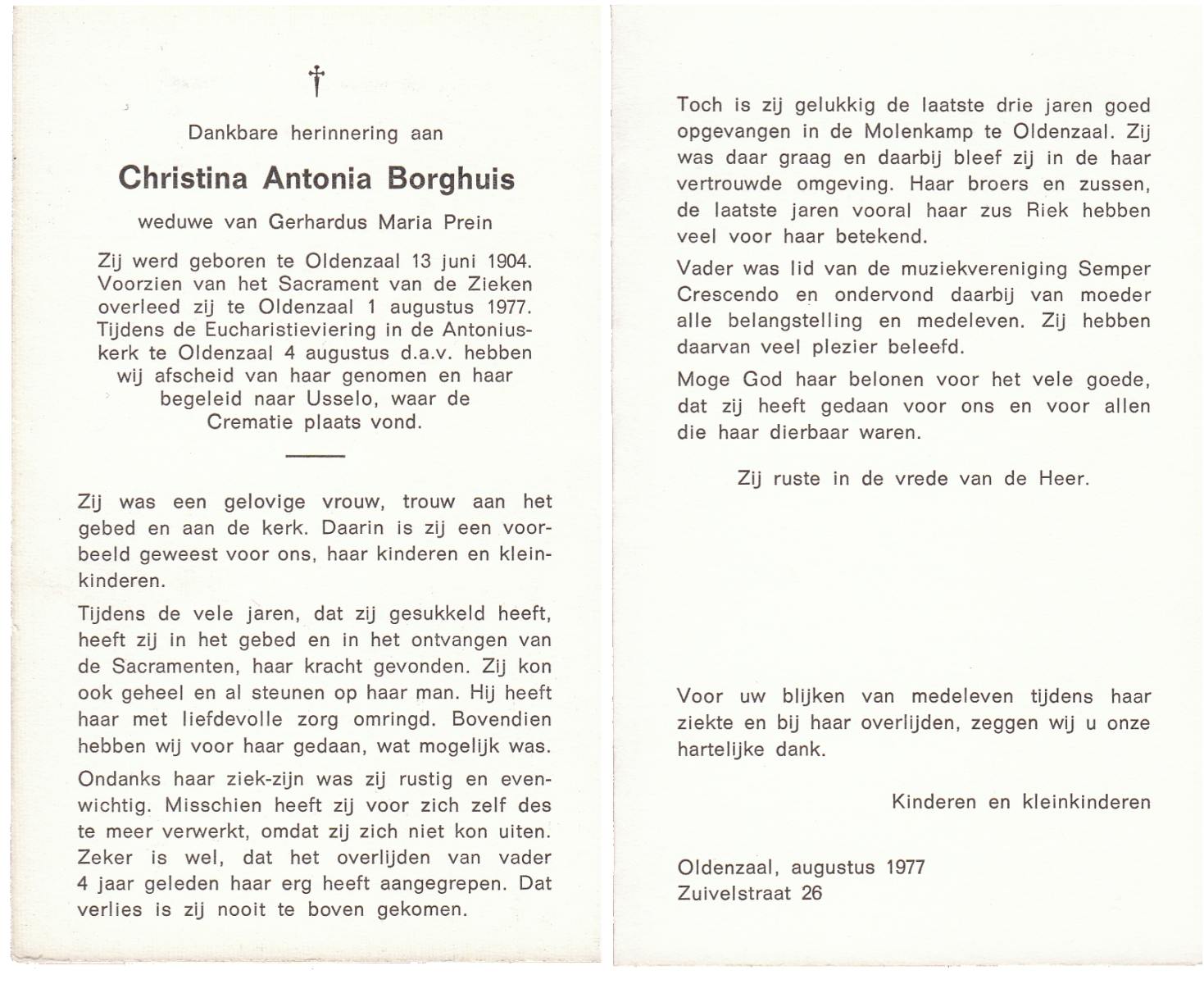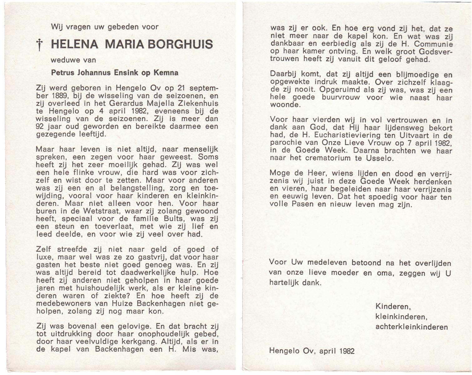 BORGGREVE, Gezina Aleida, geboren op 09-10-1898 te Beuningen (Ov.), overleden op 19-7-1982 te Enschede op 84-jarige leeftijd, begraven op 23-7-1982 te Denekamp.