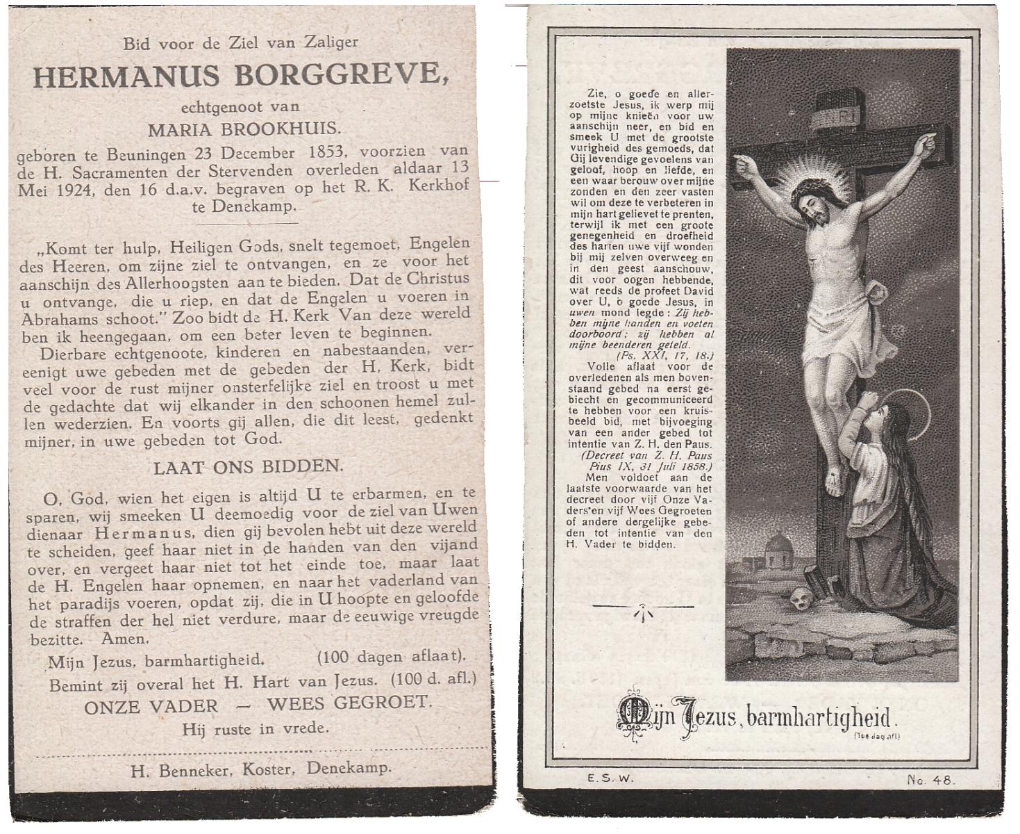 BORGGREVE, Hermanus, geboren op 23-12-1853 te Beuningen (Ov.), overleden op 13-5-1924 te Beuningen op 71-jarige leeftijd, begraven op 16-5-1924 te Denekamp.