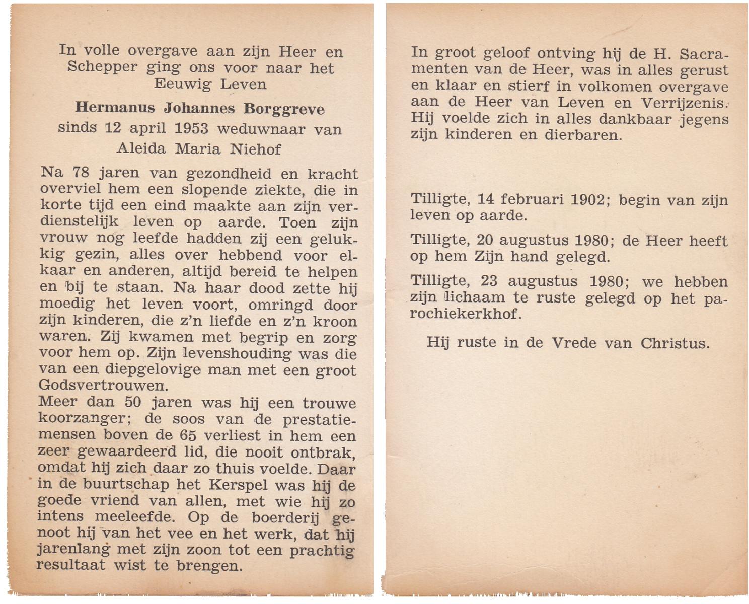 BORGGREVE, Hermanus Johannes, geboren op 14-2-1902 te Tilligte, overleden op 20-8-1980 te Tilligte op 78-jarige leeftijd, begraven op 23-8-1980 te Tilligte.