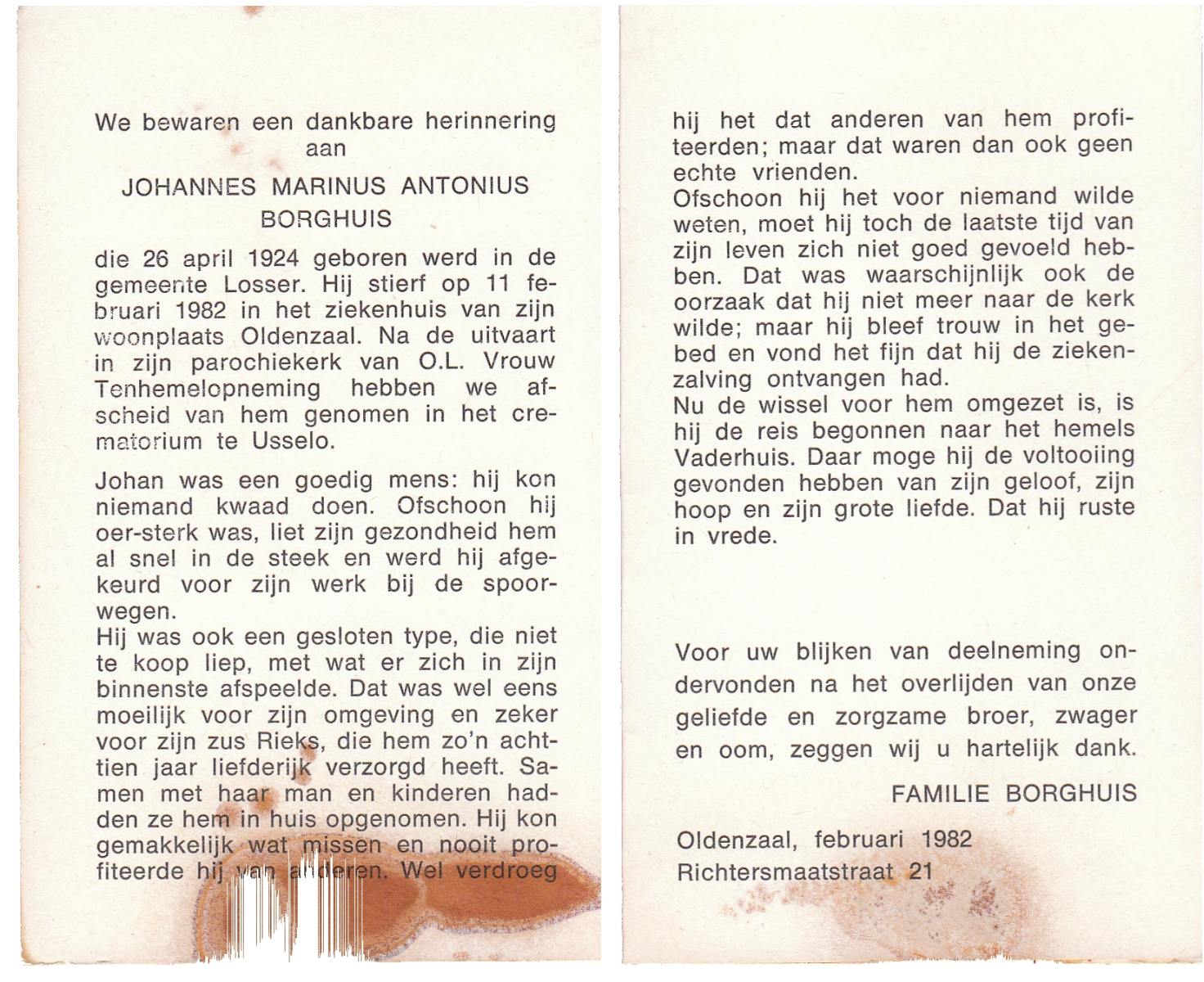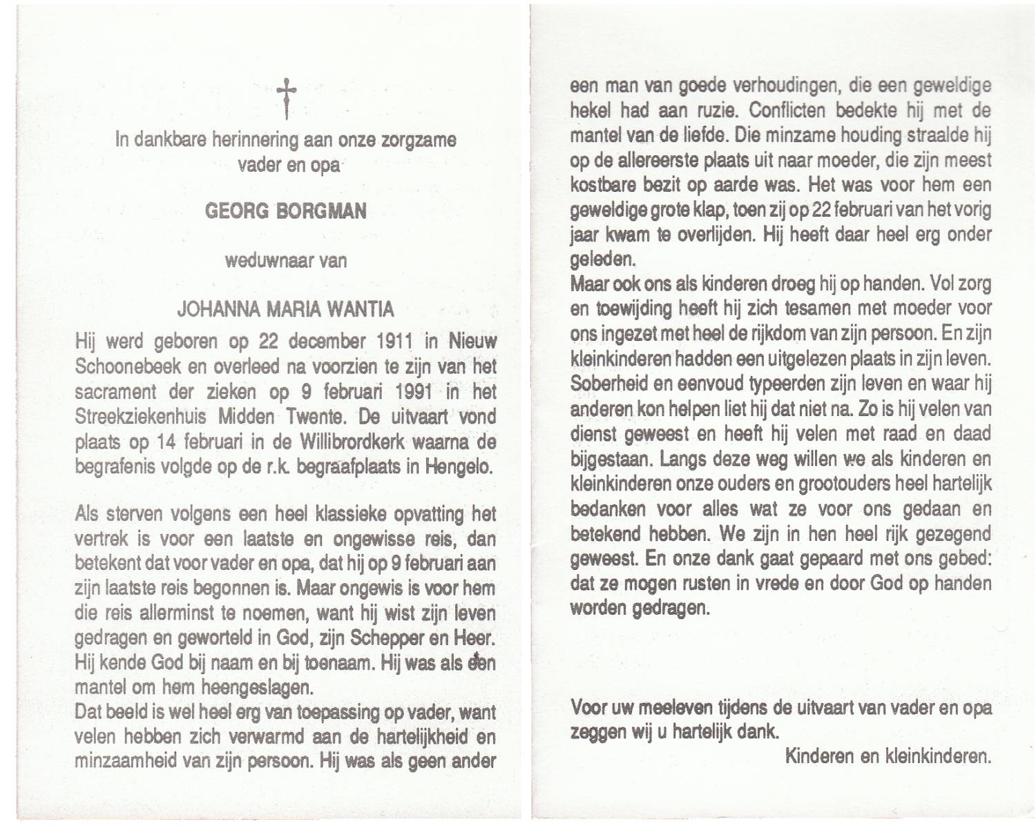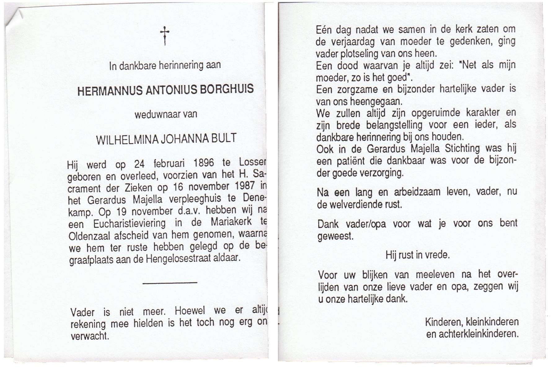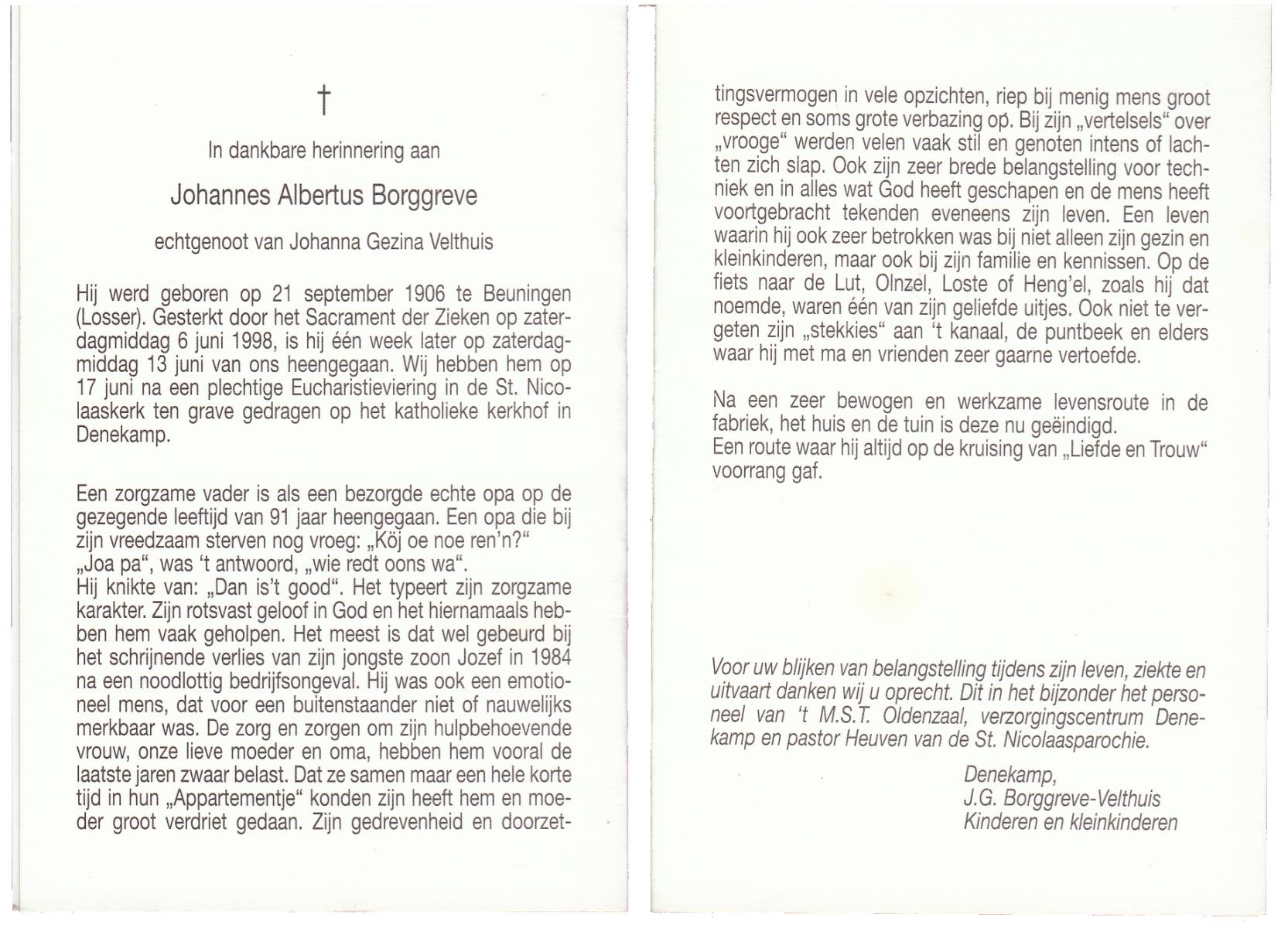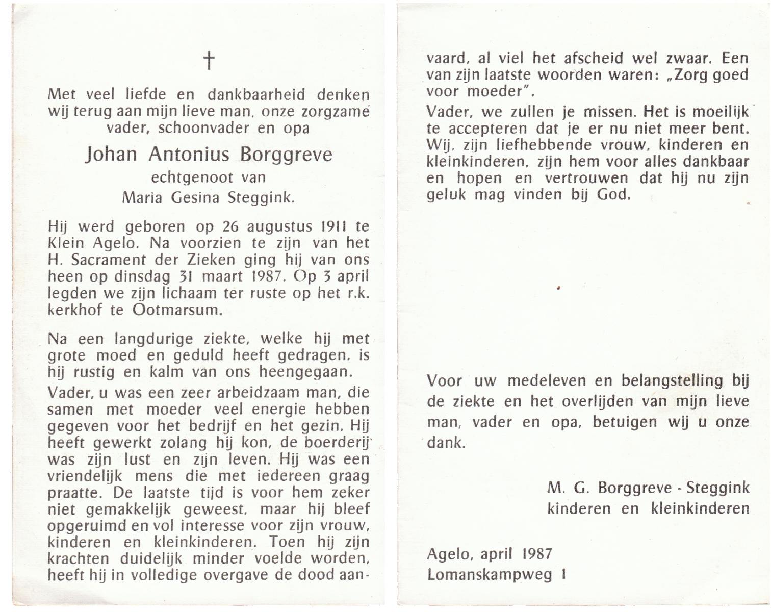 BORGGREVE, Johan Antonius, geboren op 26-8-1911 te Klein Agelo, overleden op 31-3-1987 op 75-jarige leeftijd, begraven op 3-4-1987 te Ootmarsum.