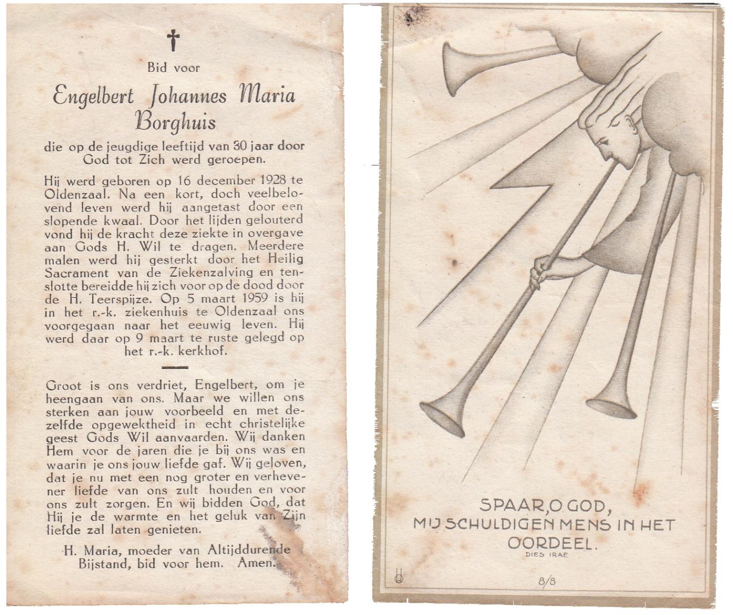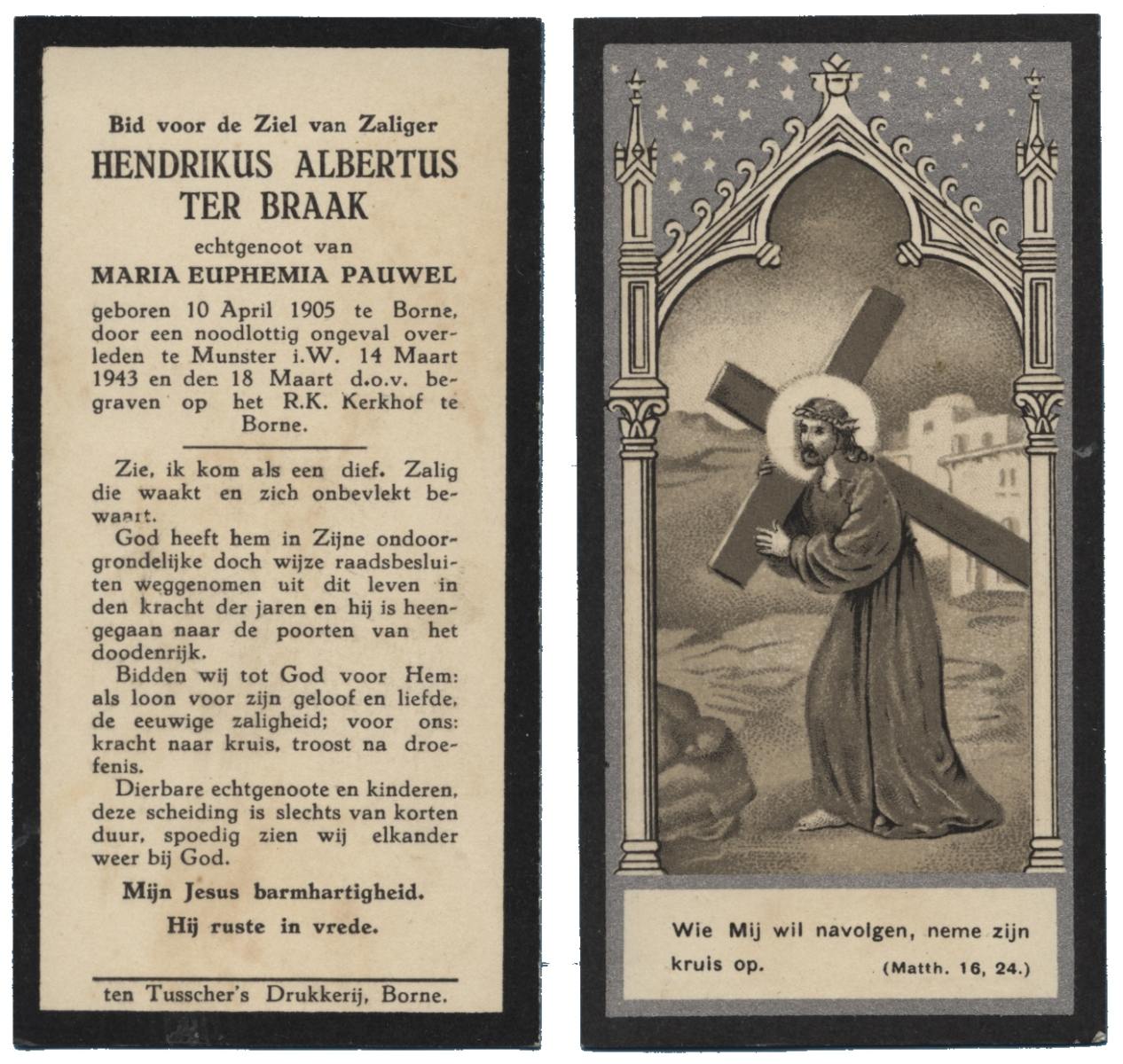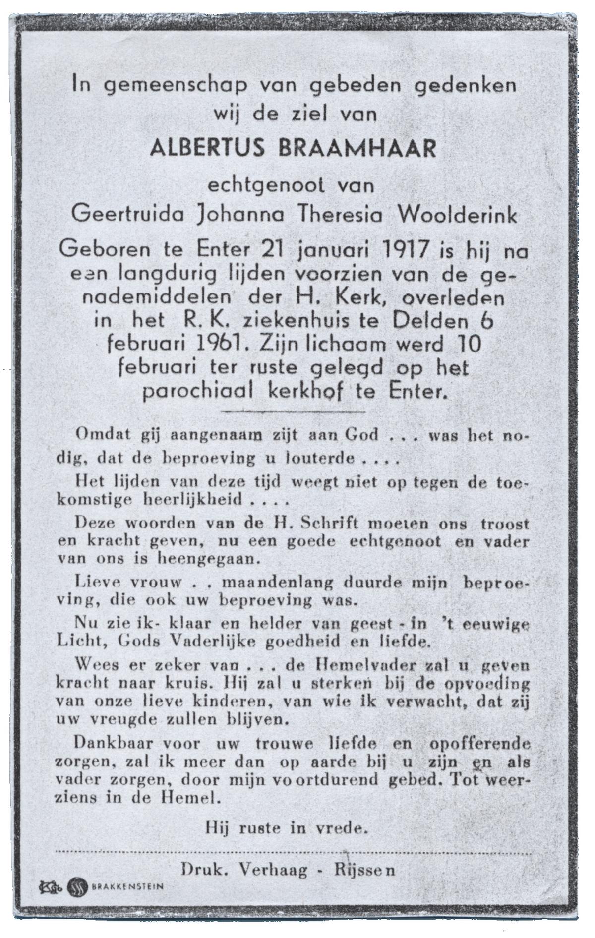 BRAAMHAAR, Albertus, geboren op 21-1-1917 te Enter, overleden op 6-2-1961 te Delden op 44-jarige leeftijd, begraven op 10-2-1961 te Enter.