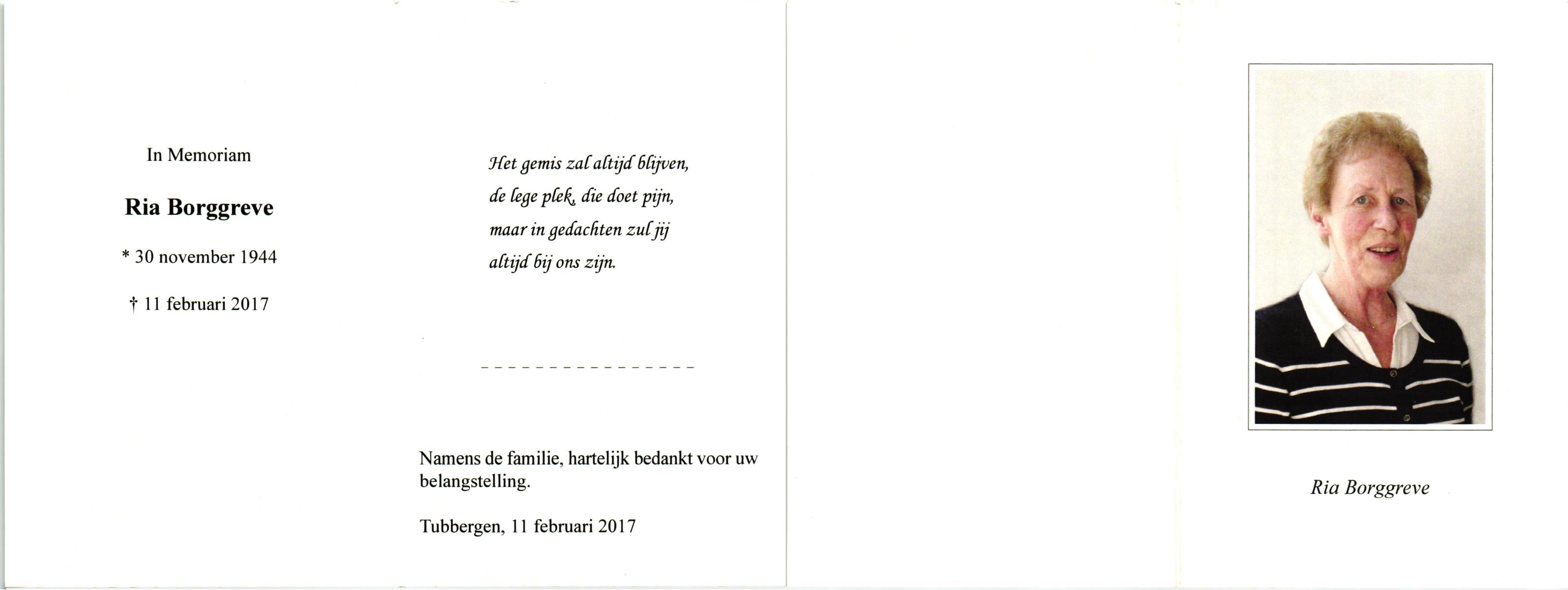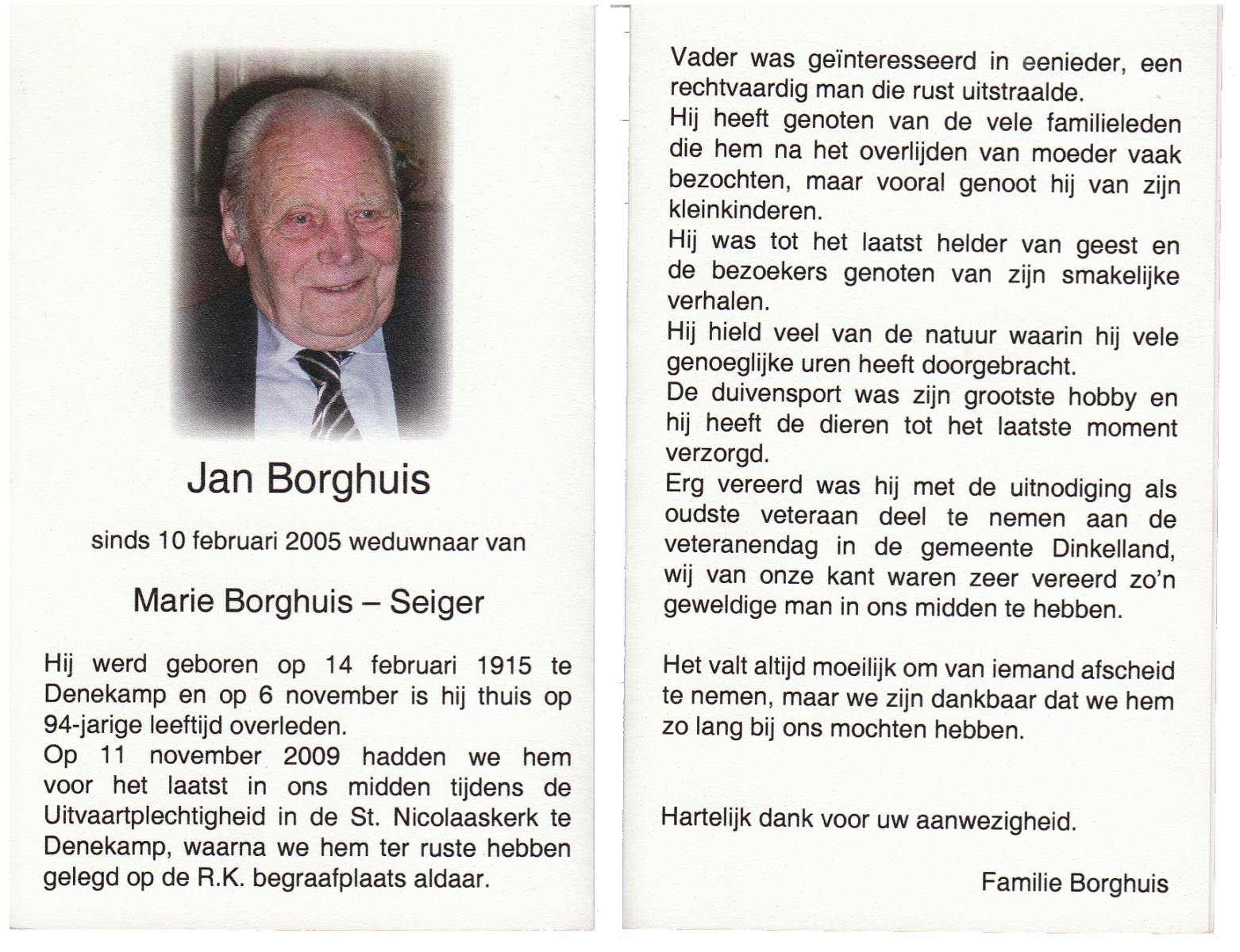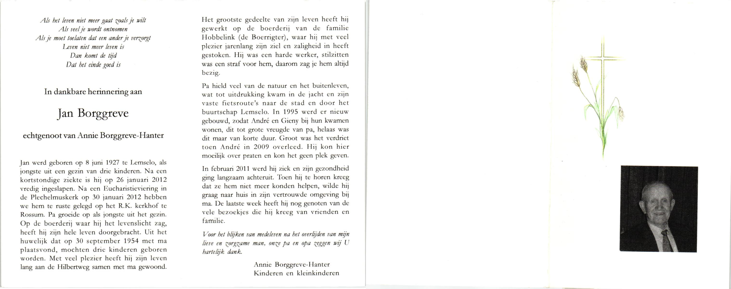 BORGGREVE, Jan, geboren op 8-6-1927 te Lemselo, overleden op 26-1-2012 op 84-jarige leeftijd, begraven op 30-1-2012 te Rossum.
