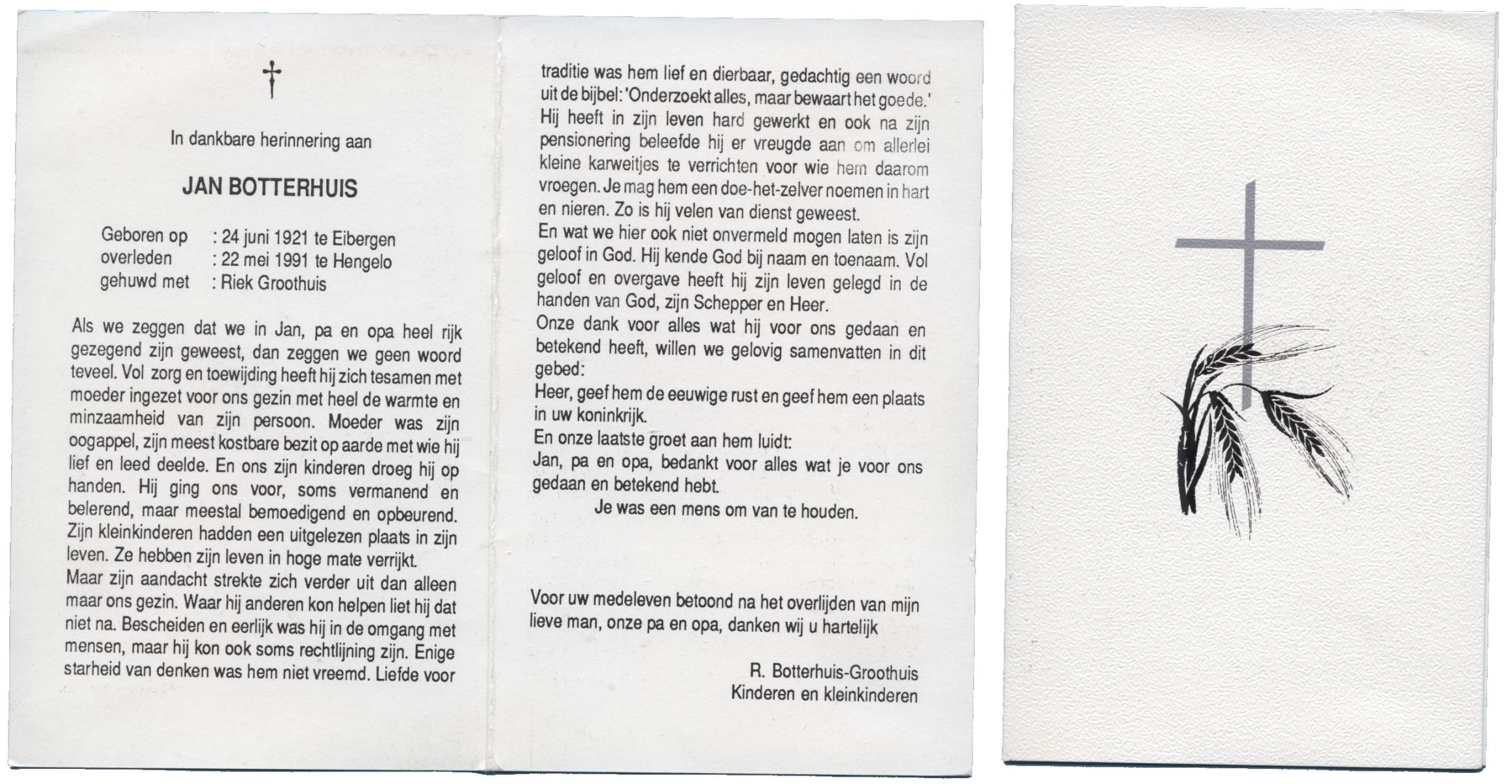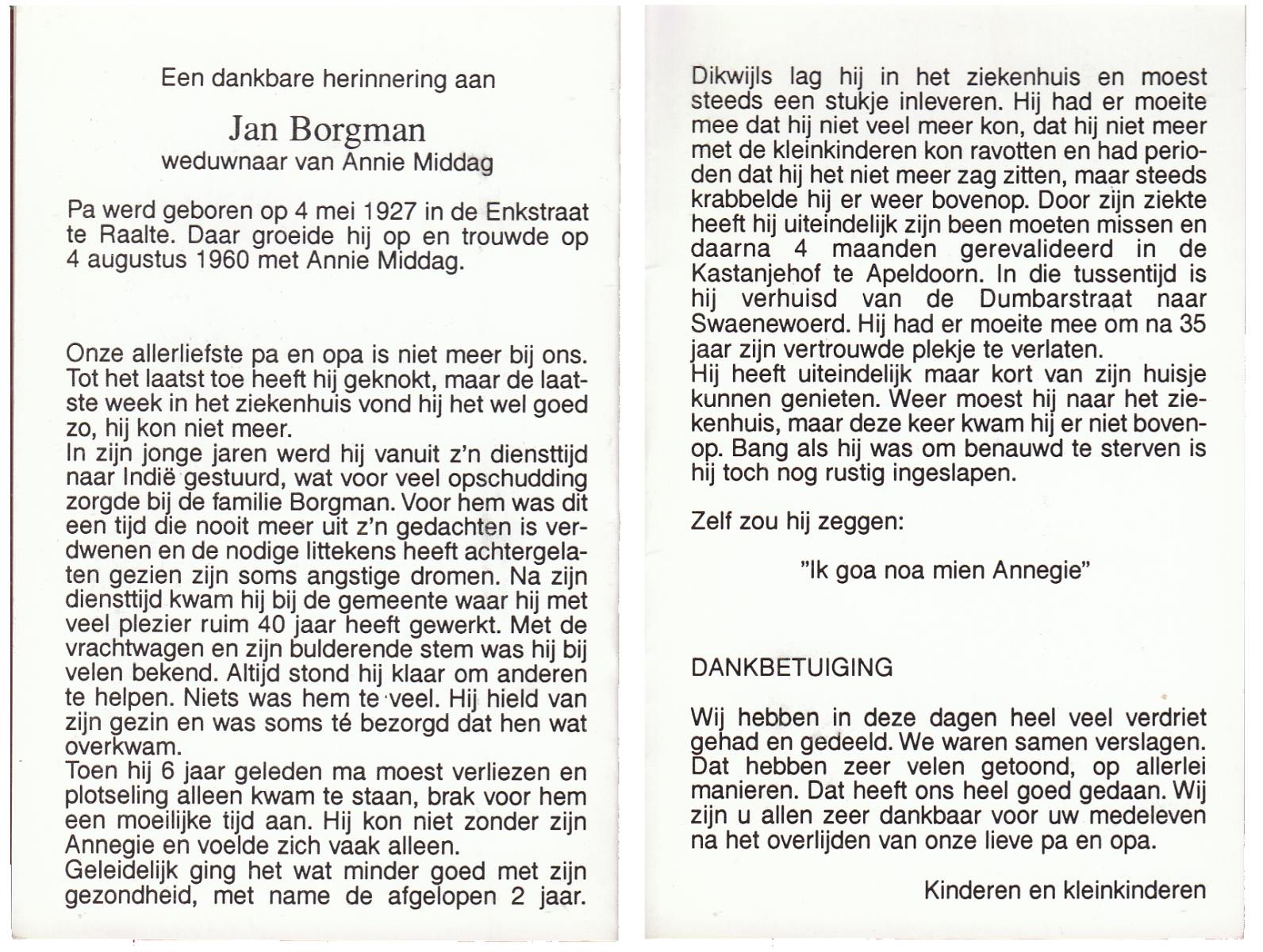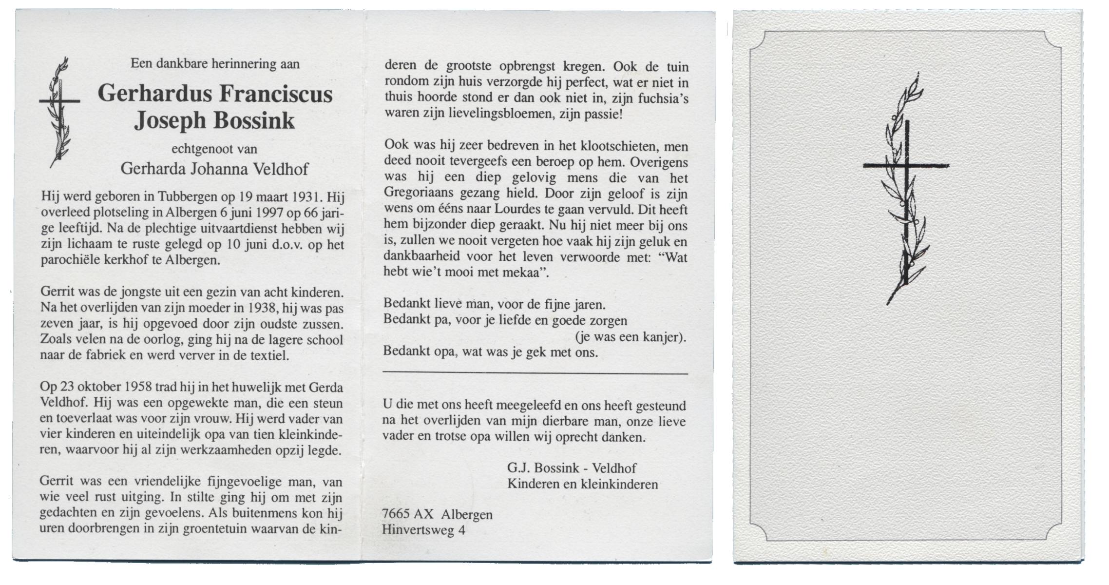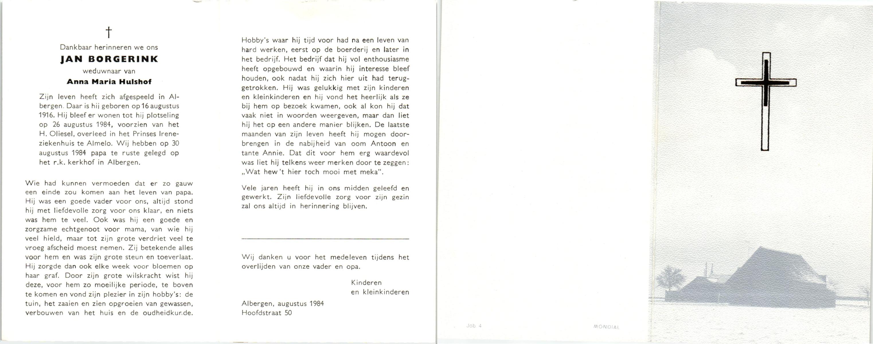 BORGERINK, Jan, geboren op 16-8-1916 te Albergen, overleden op 26-8-1984 te Almelo, ziekenhuis op 68-jarige leeftijd, begraven op 30-8-1984 te Albergen.