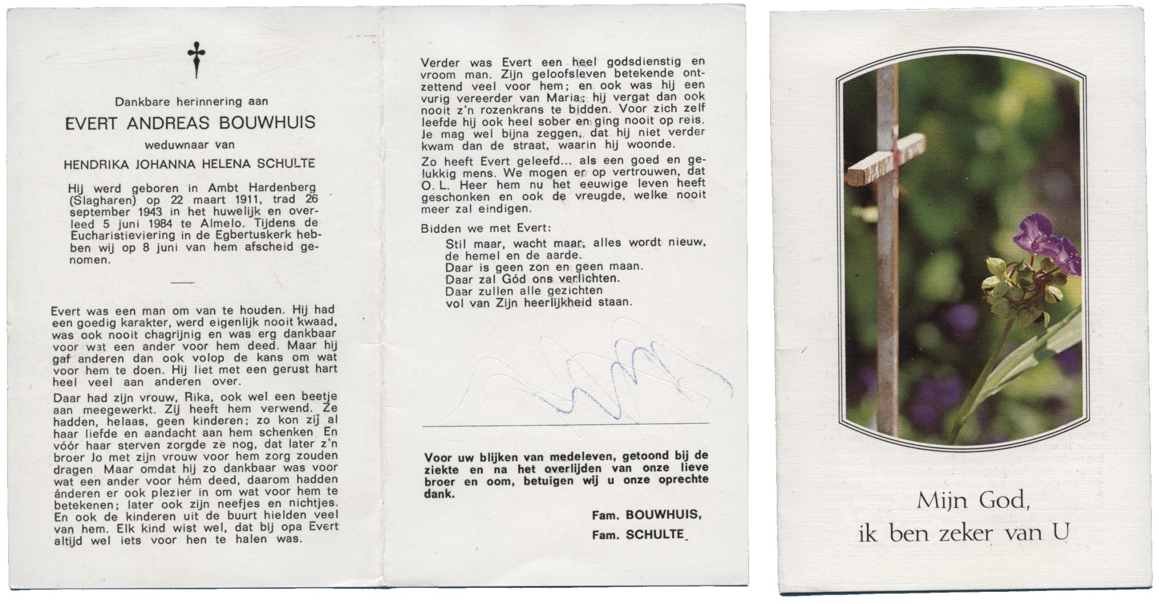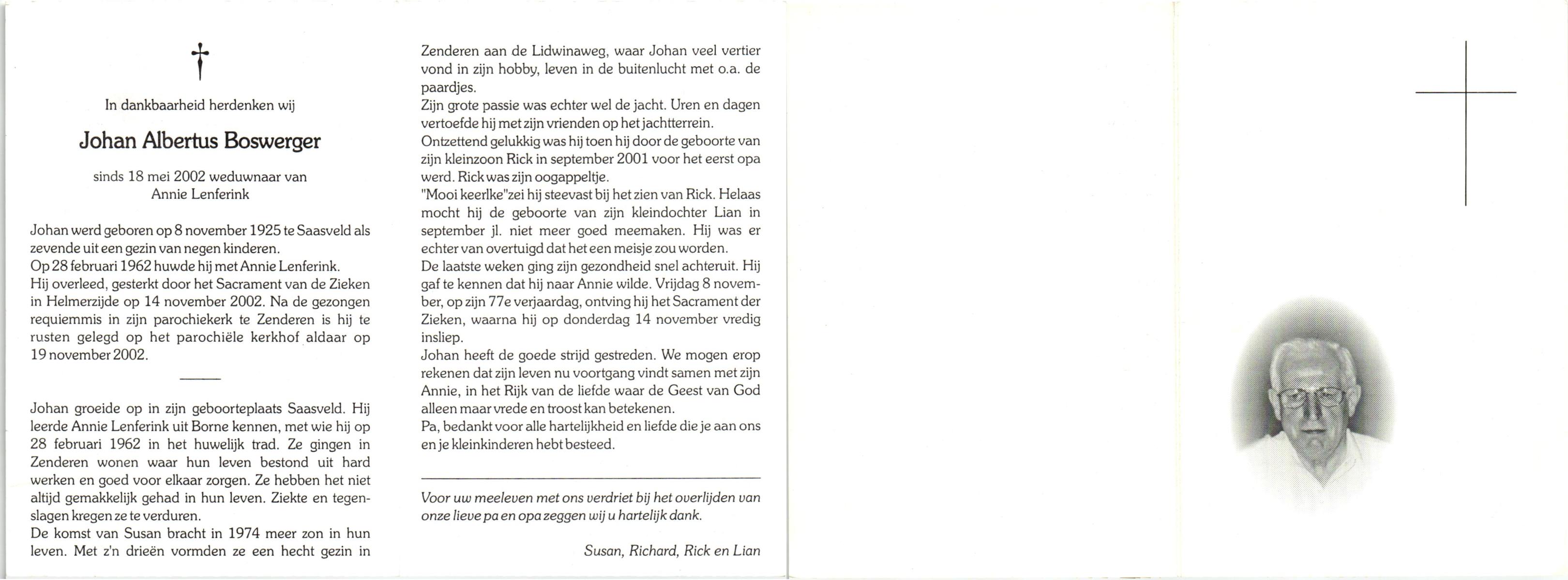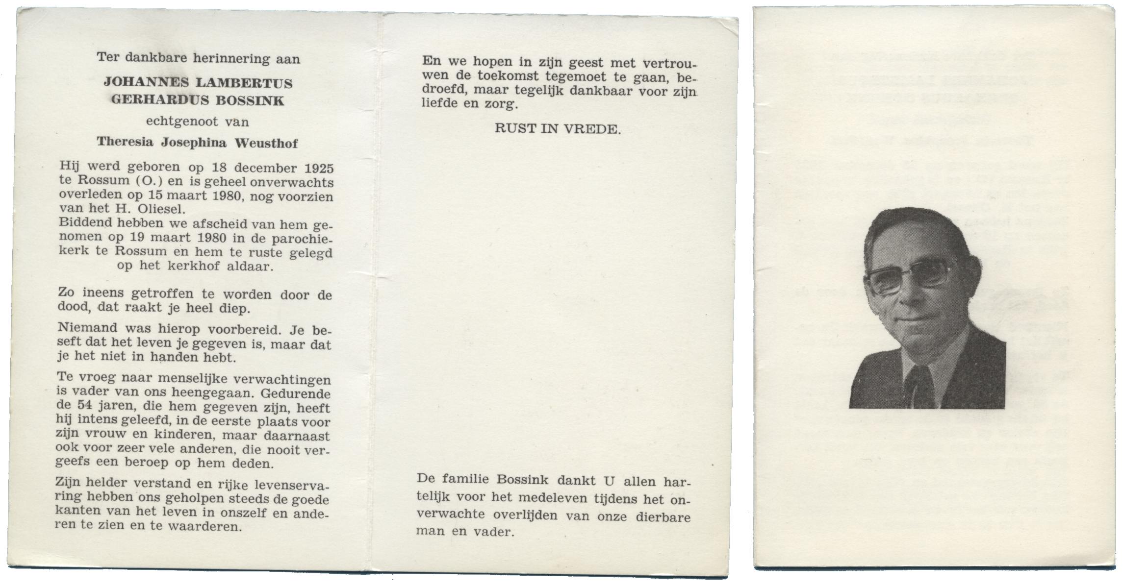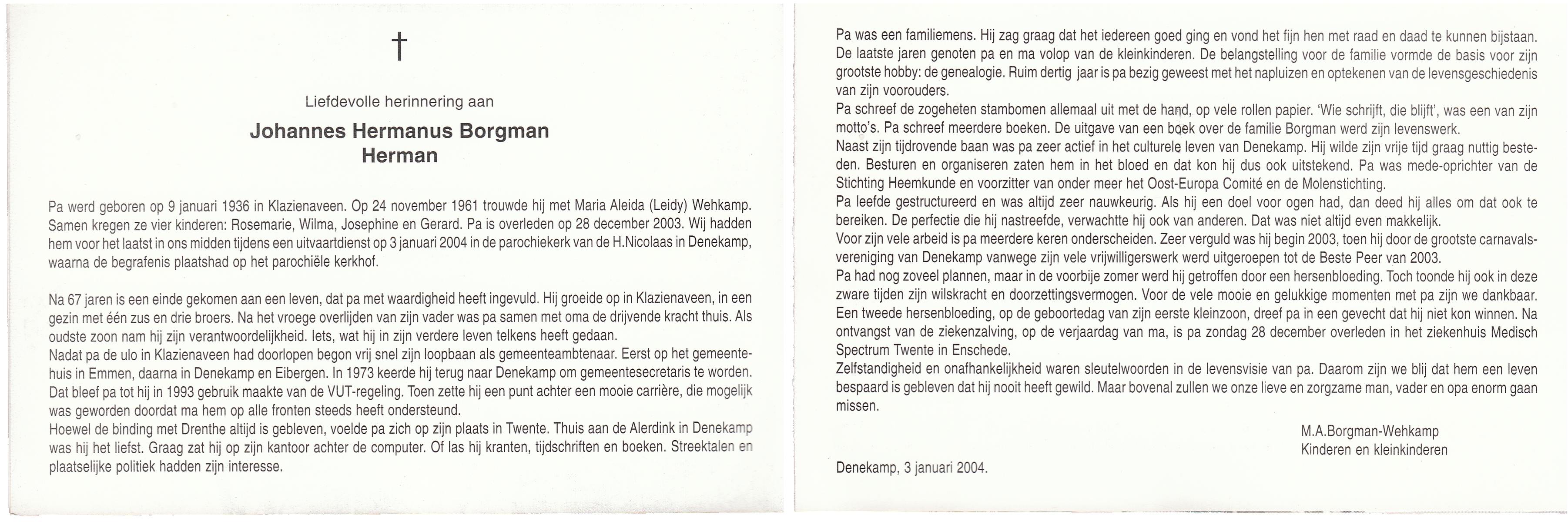 BORGERINK, Jan, geboren op 16-8-1916 te Albergen, overleden op 26-8-1984 te Almelo, ziekenhuis op 68-jarige leeftijd, begraven op 30-8-1984 te Albergen.