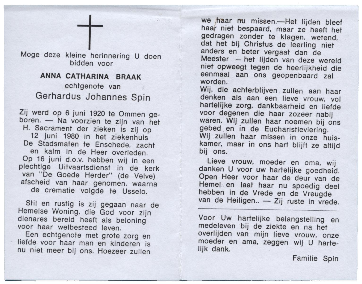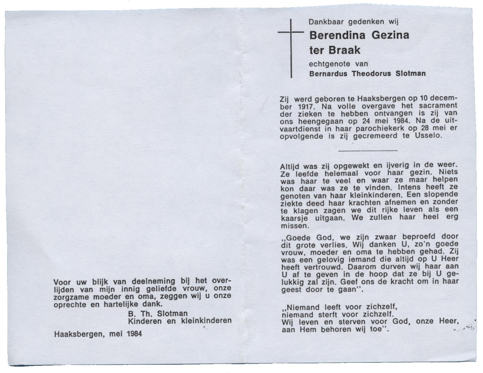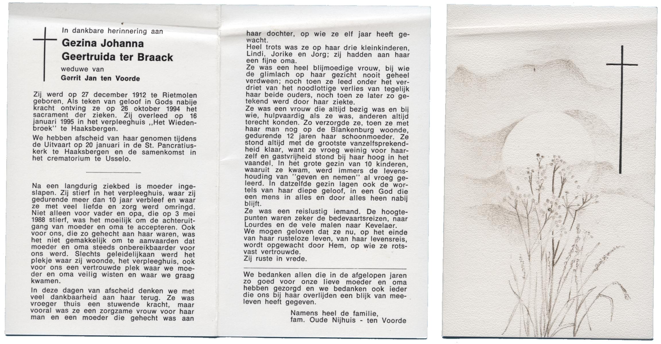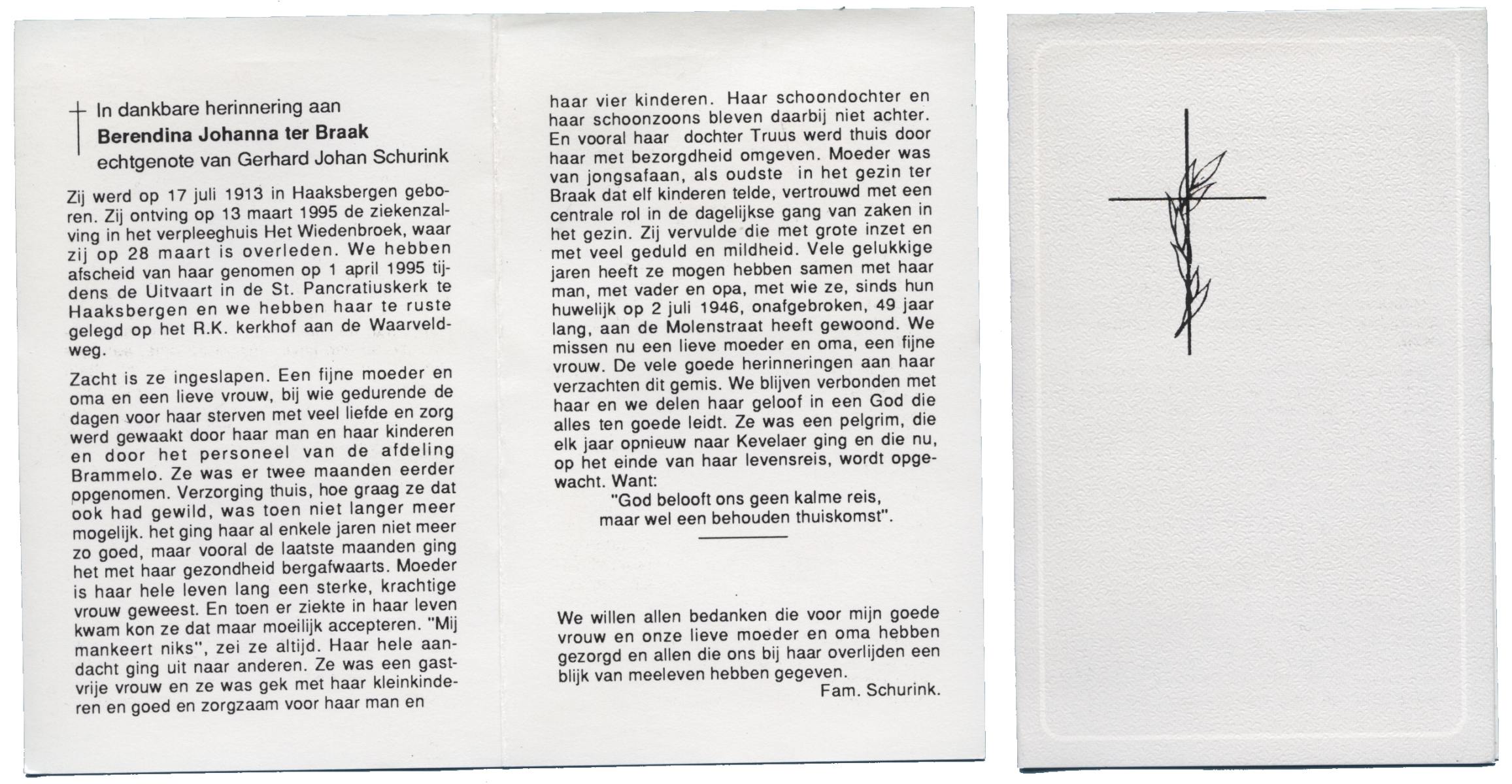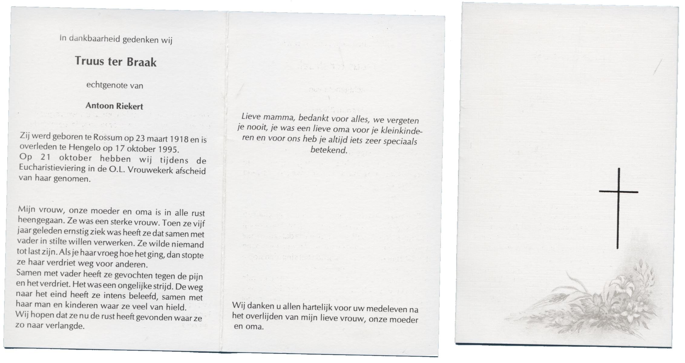 BRAAK, ter, Truus, geboren op 23-3-1918 te Rossum, overleden op 17-10-1995 te Hengelo (Ov.) op 77-jarige leeftijd, begraven op 21-10-1995.