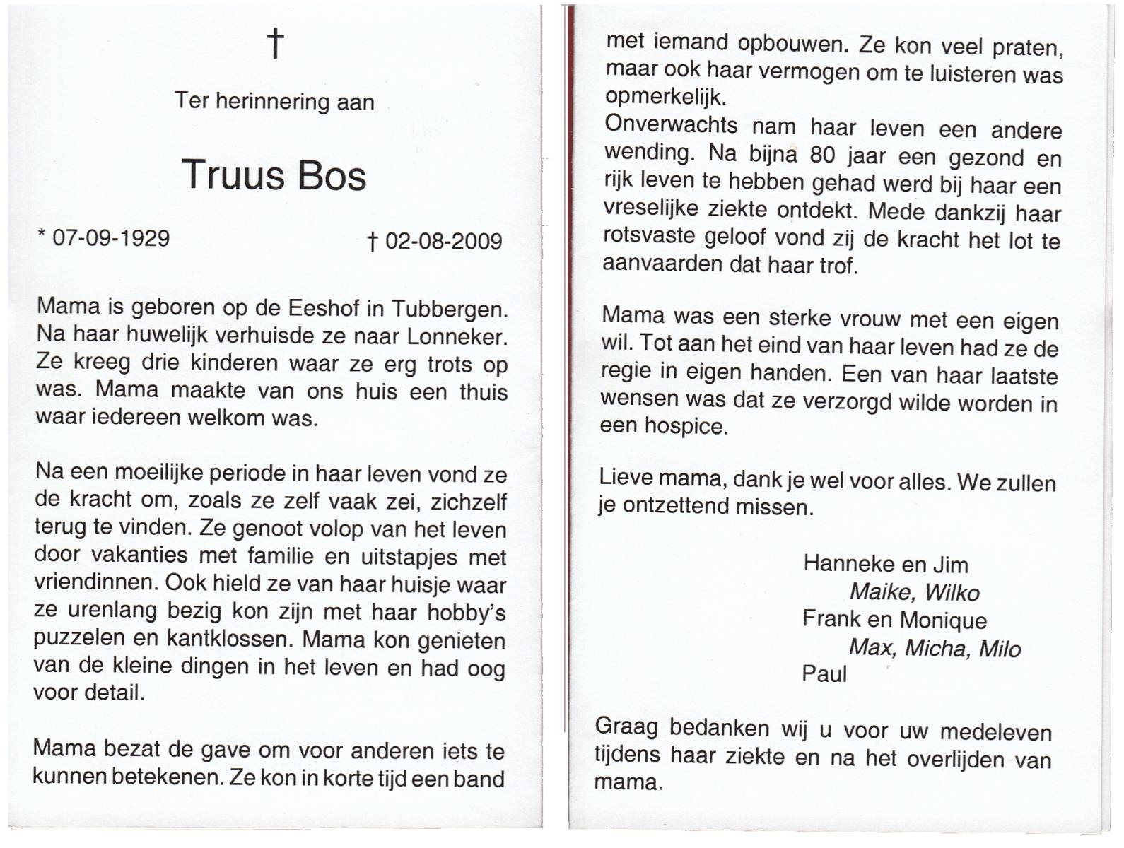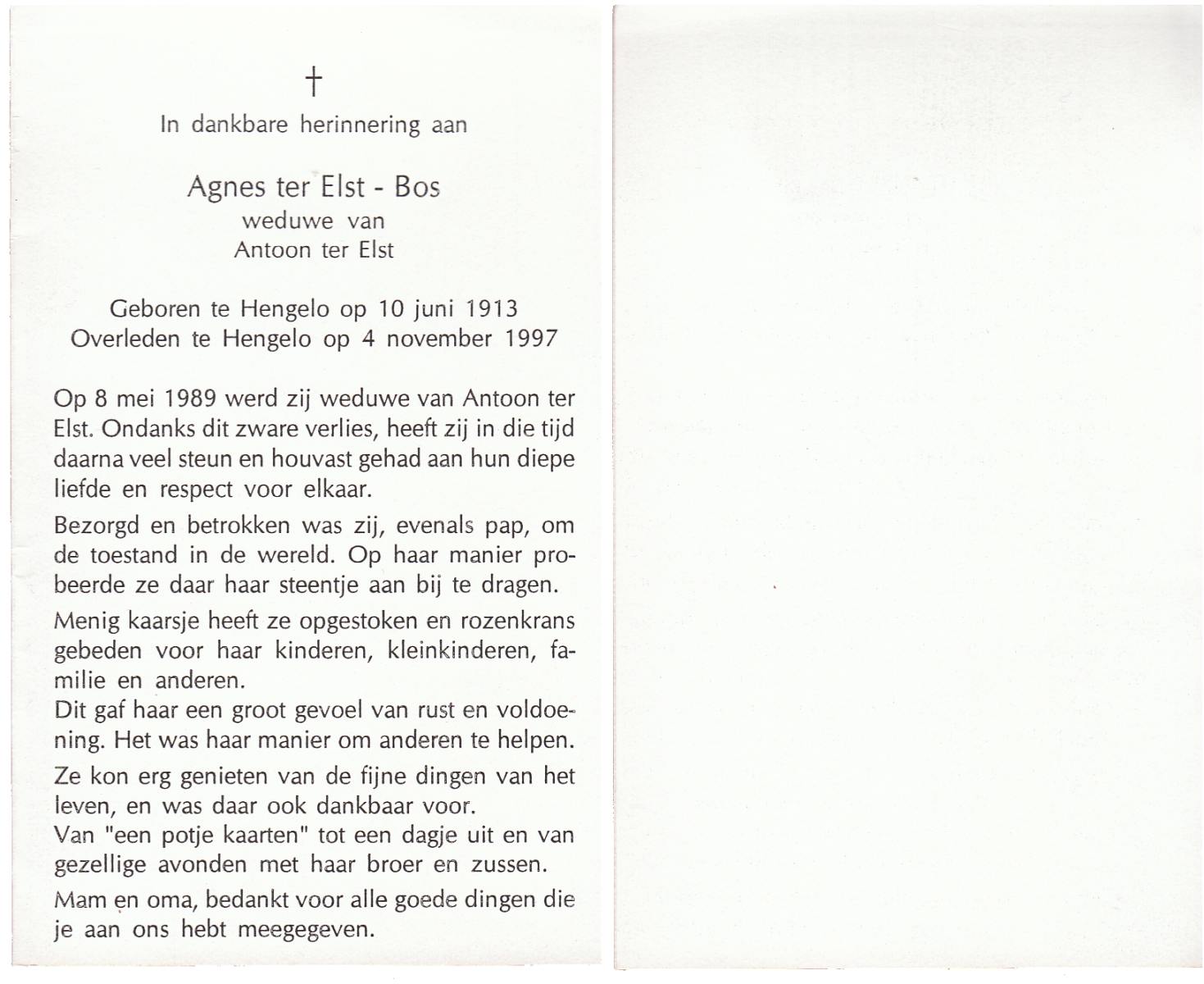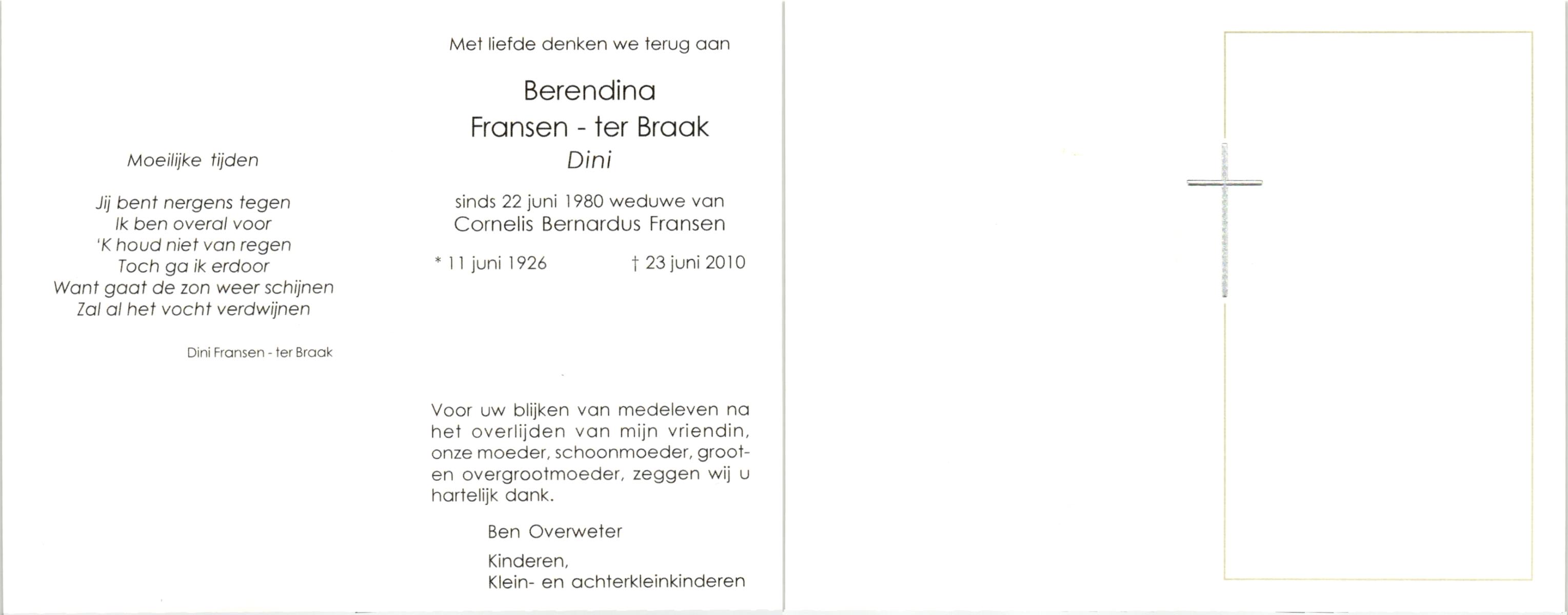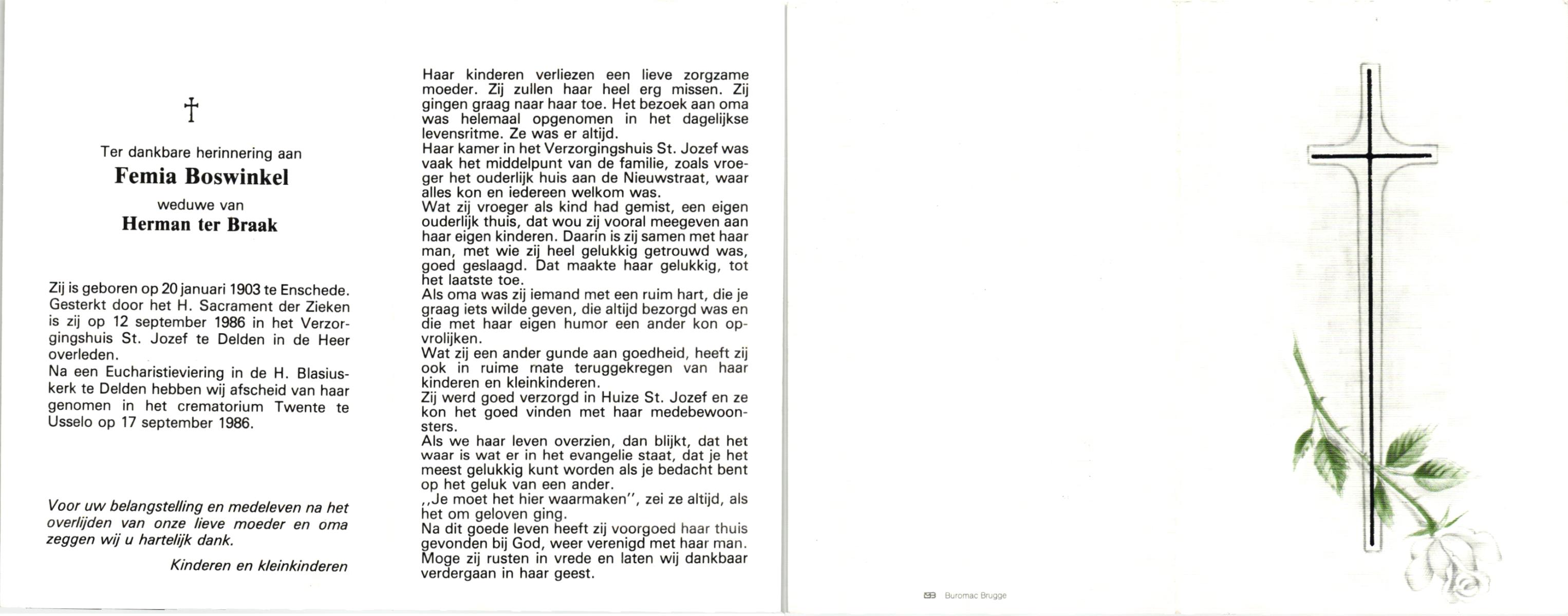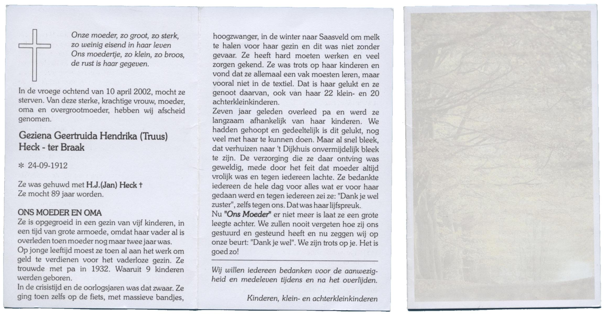 BRAAK, ter, Truus, geboren op 23-3-1918 te Rossum, overleden op 17-10-1995 te Hengelo (Ov.) op 77-jarige leeftijd, begraven op 21-10-1995.