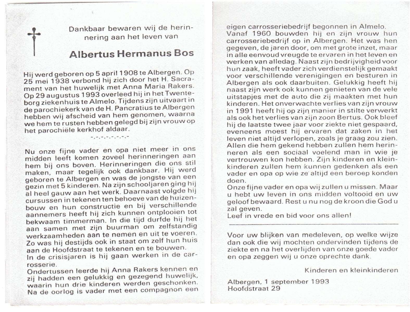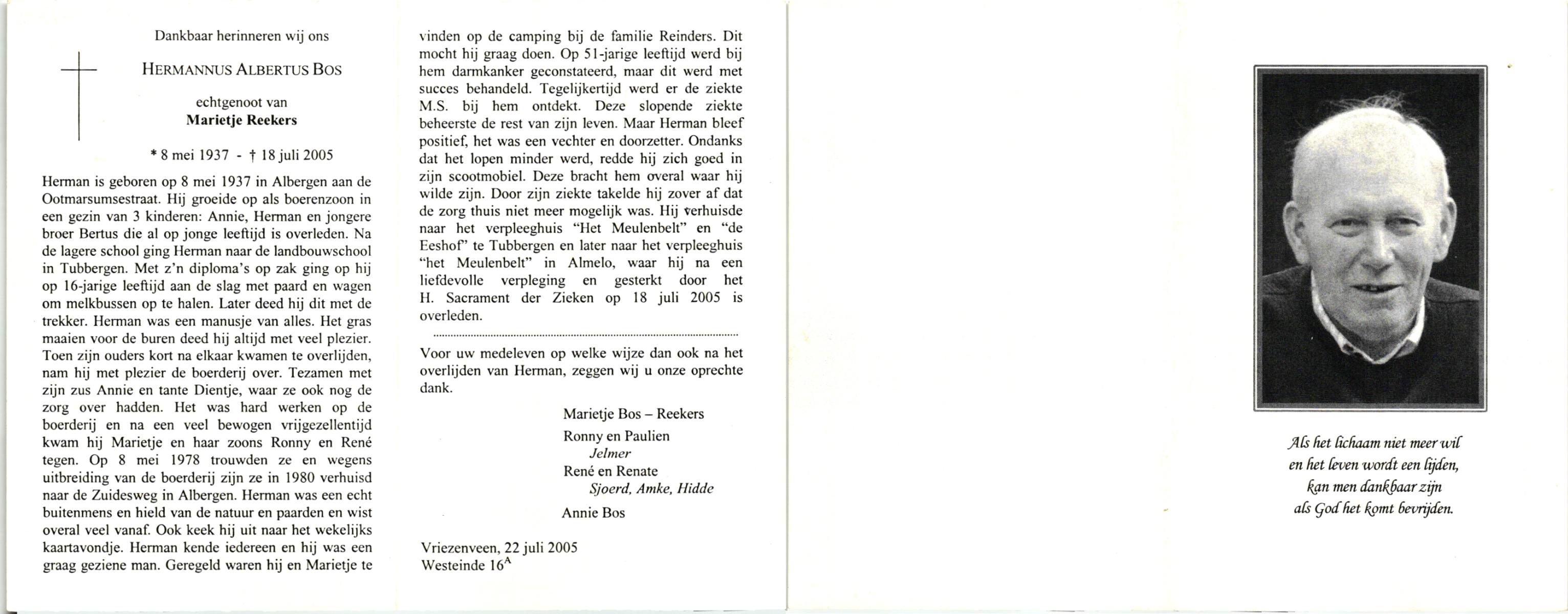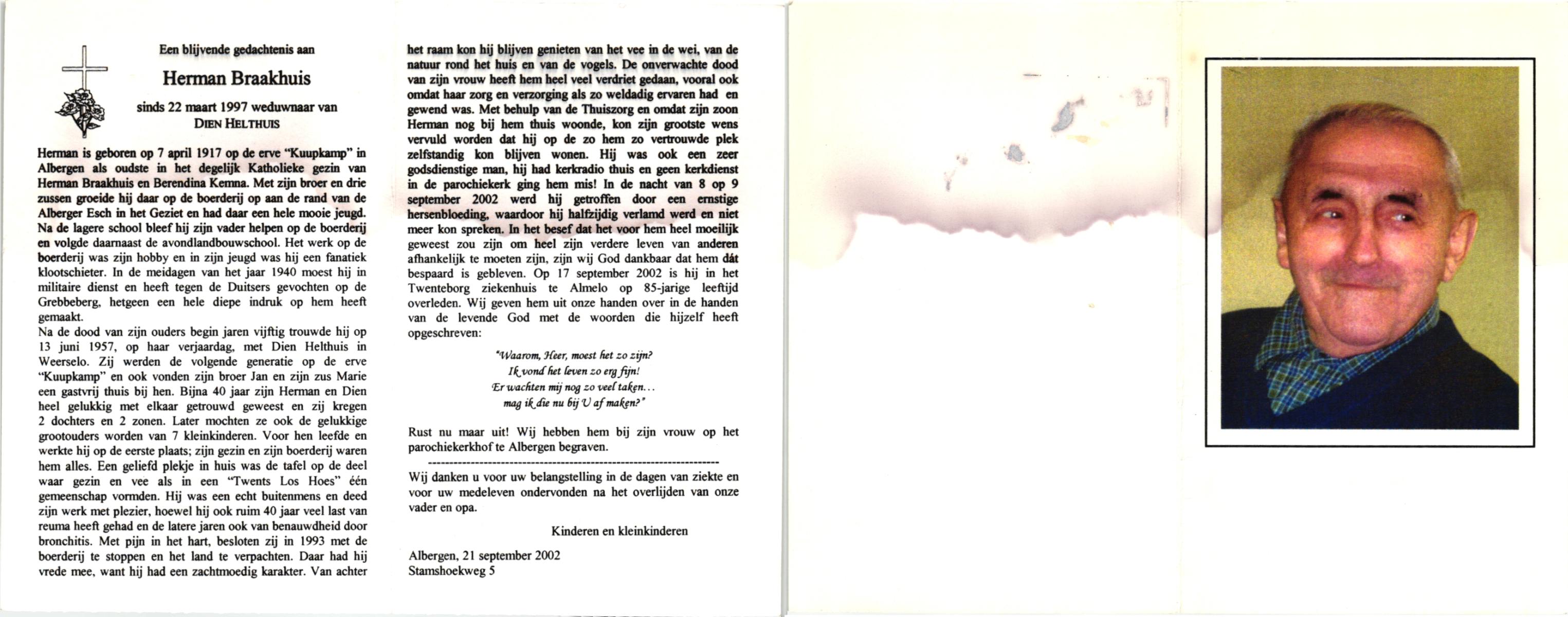 BRAAKHUIS, , Herman, geboren op 7-4-1917 te Albergen, overleden op 17-9-2002 te Almelo op 85-jarige leeftijd, begraven te Albergen.