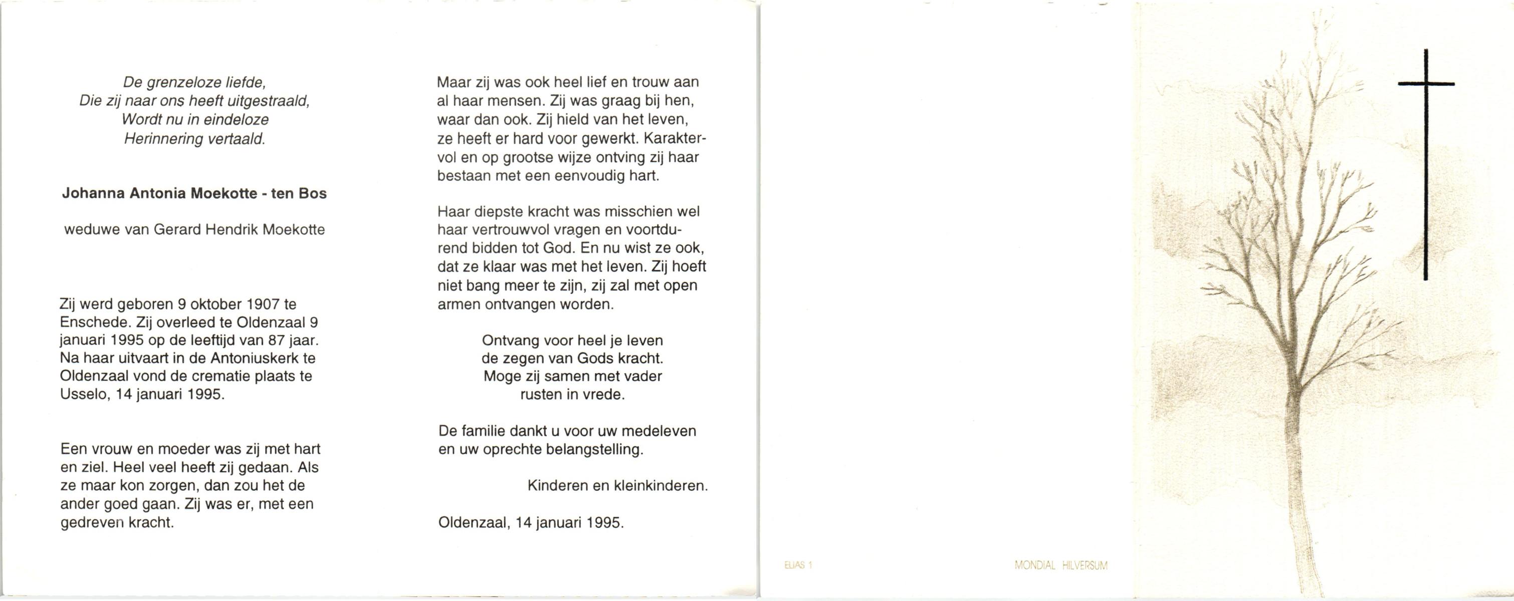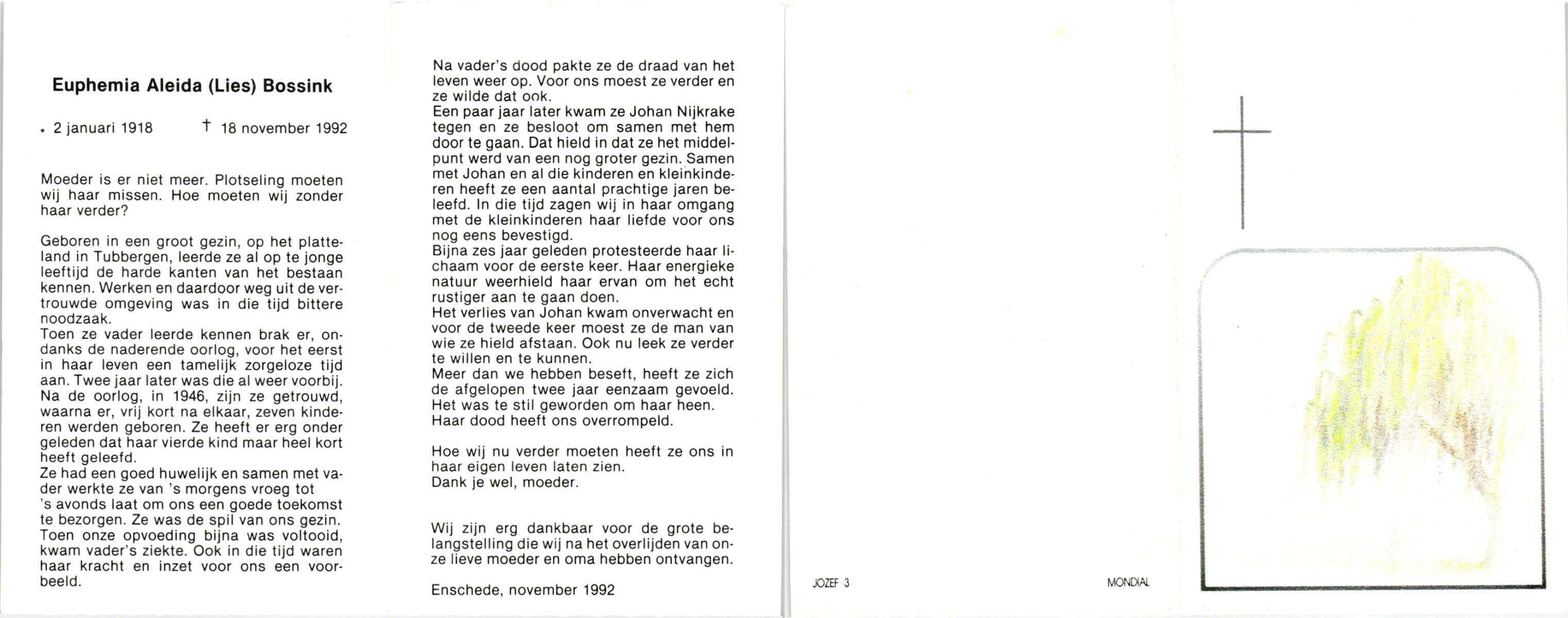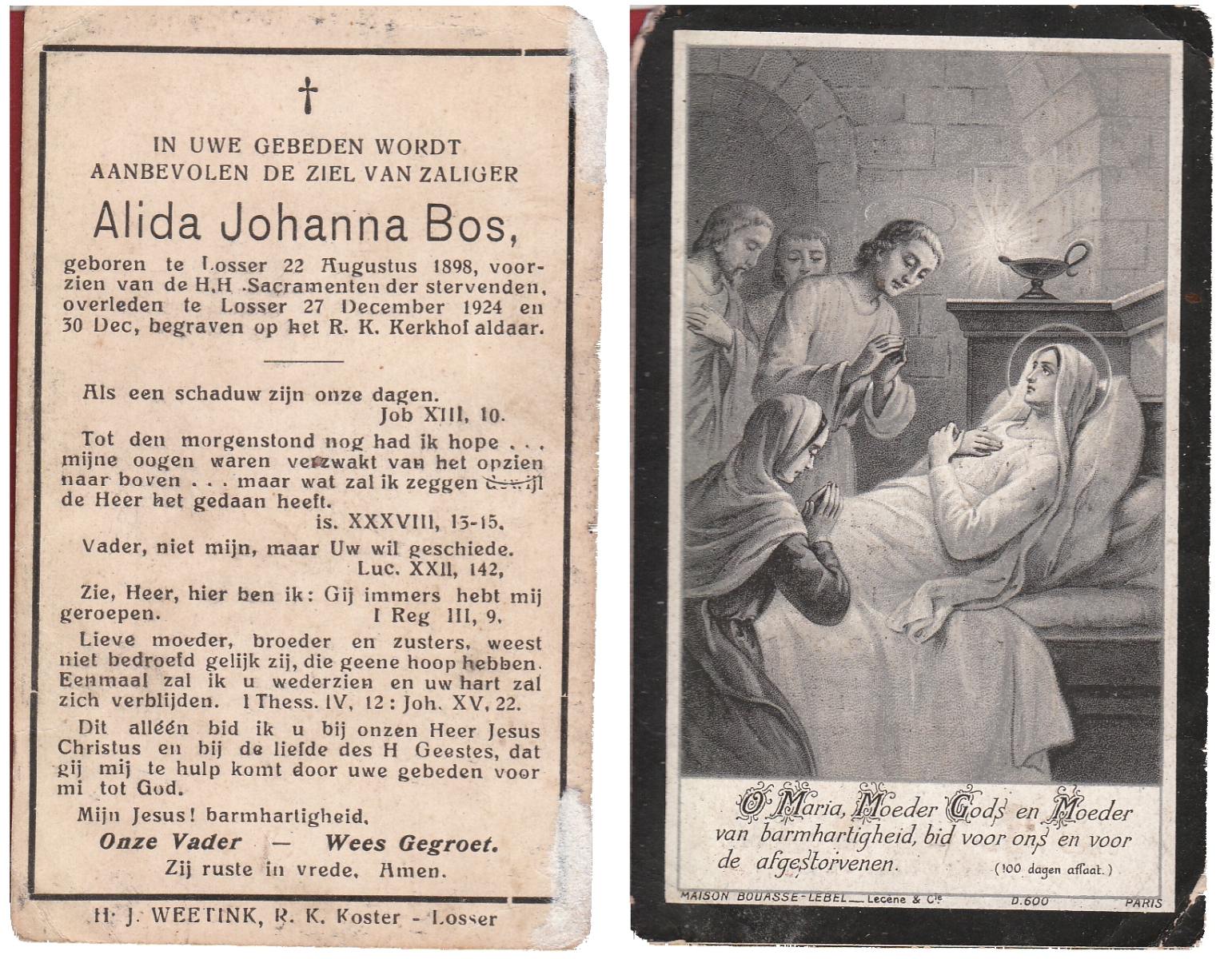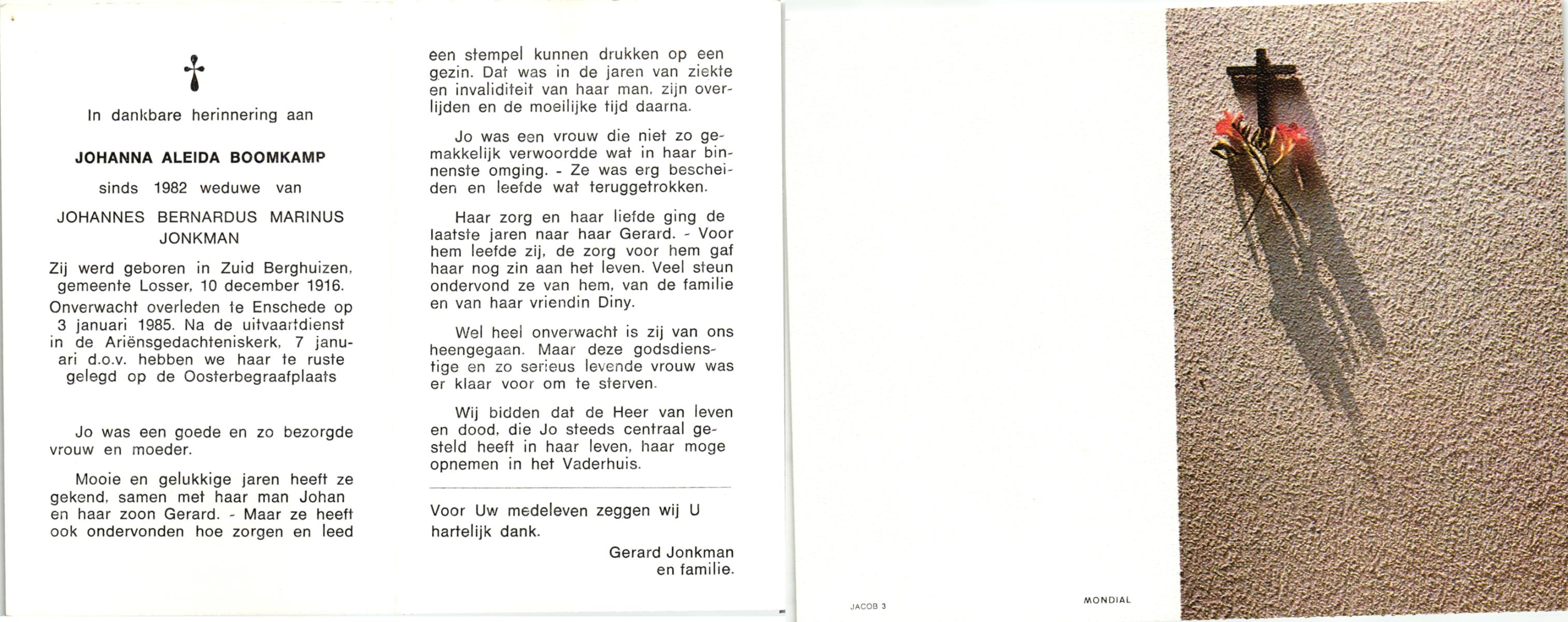 BOOMKAMP, , Johanna Aleida, geboren op 10-12-1916 te Losser, Zuid Berghuizen, overleden op 3-1-1985 te Enschede op 68-jarige leeftijd, begraven op 7-1-1985 te Enschede.