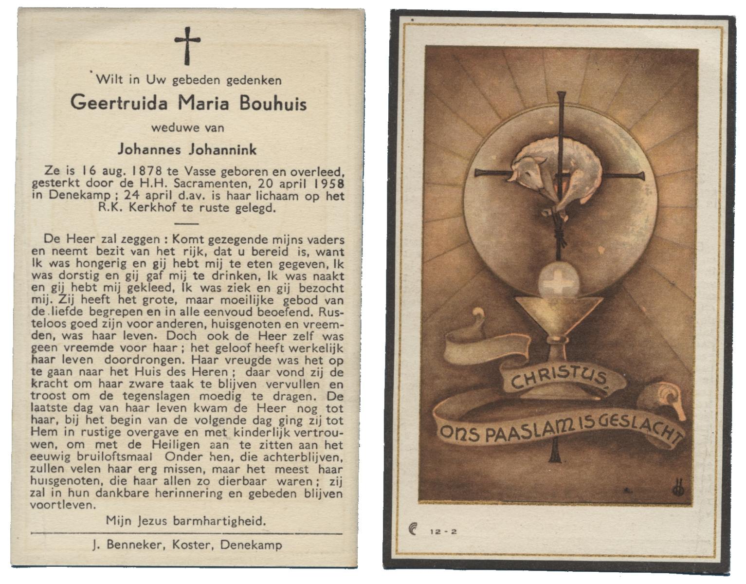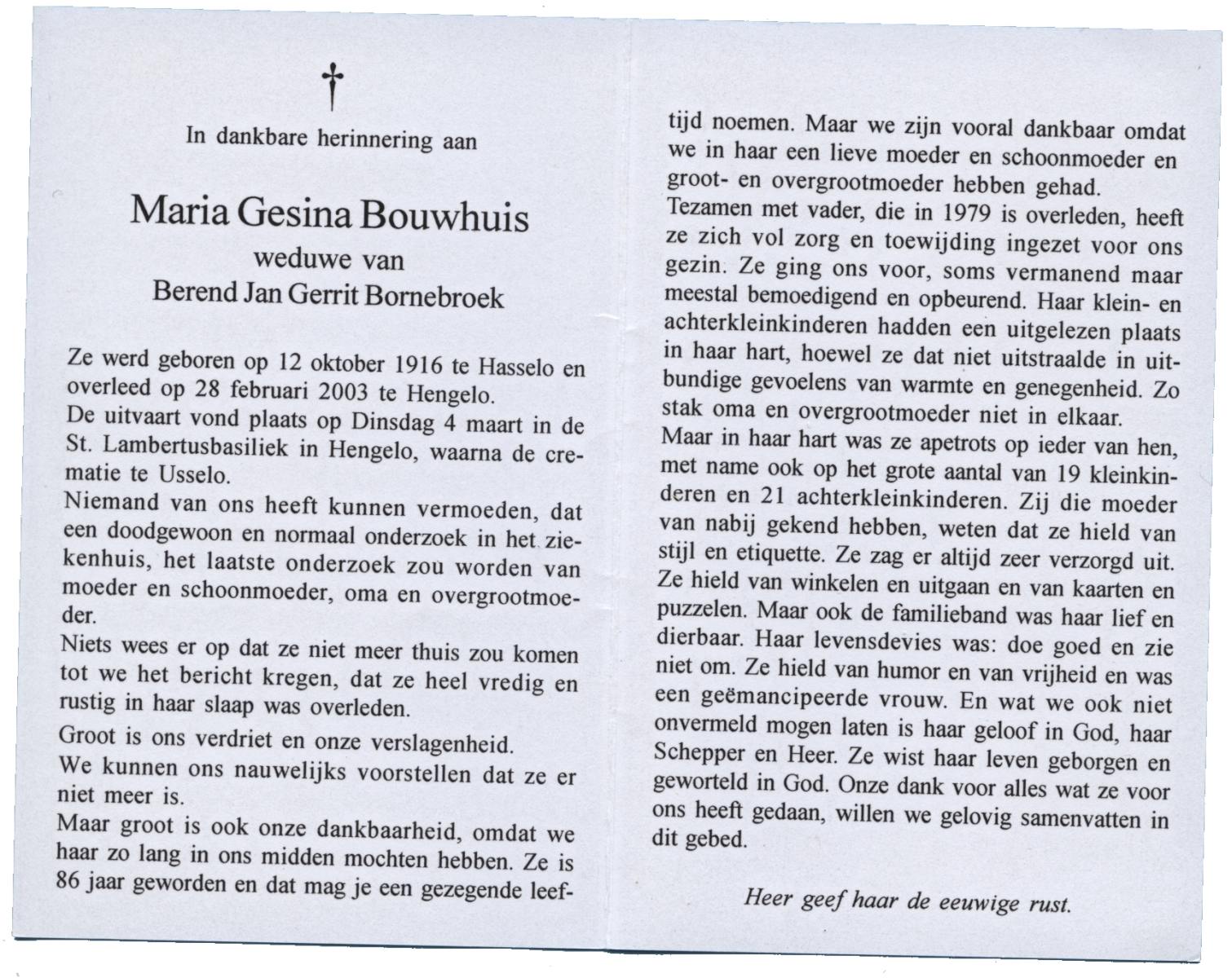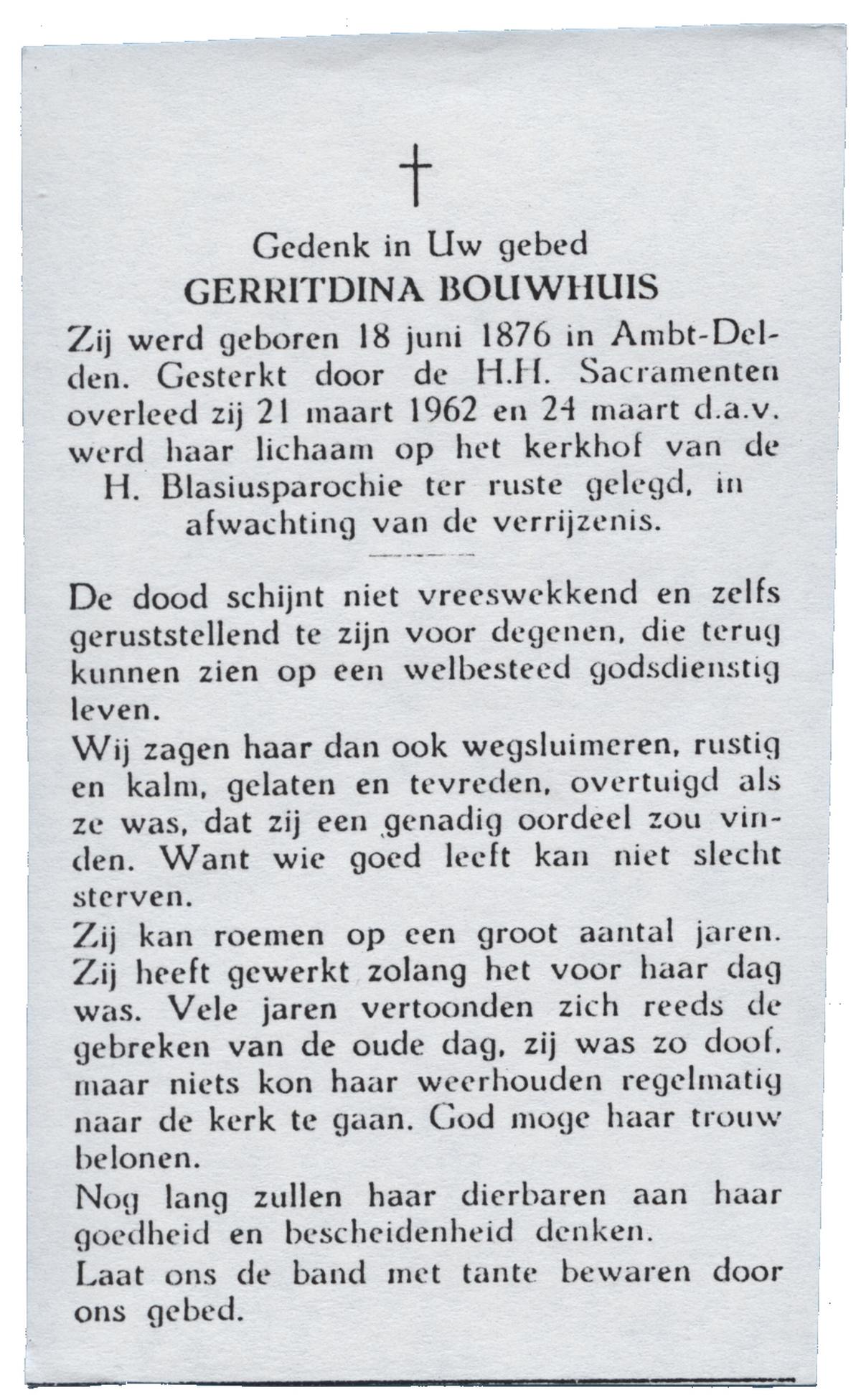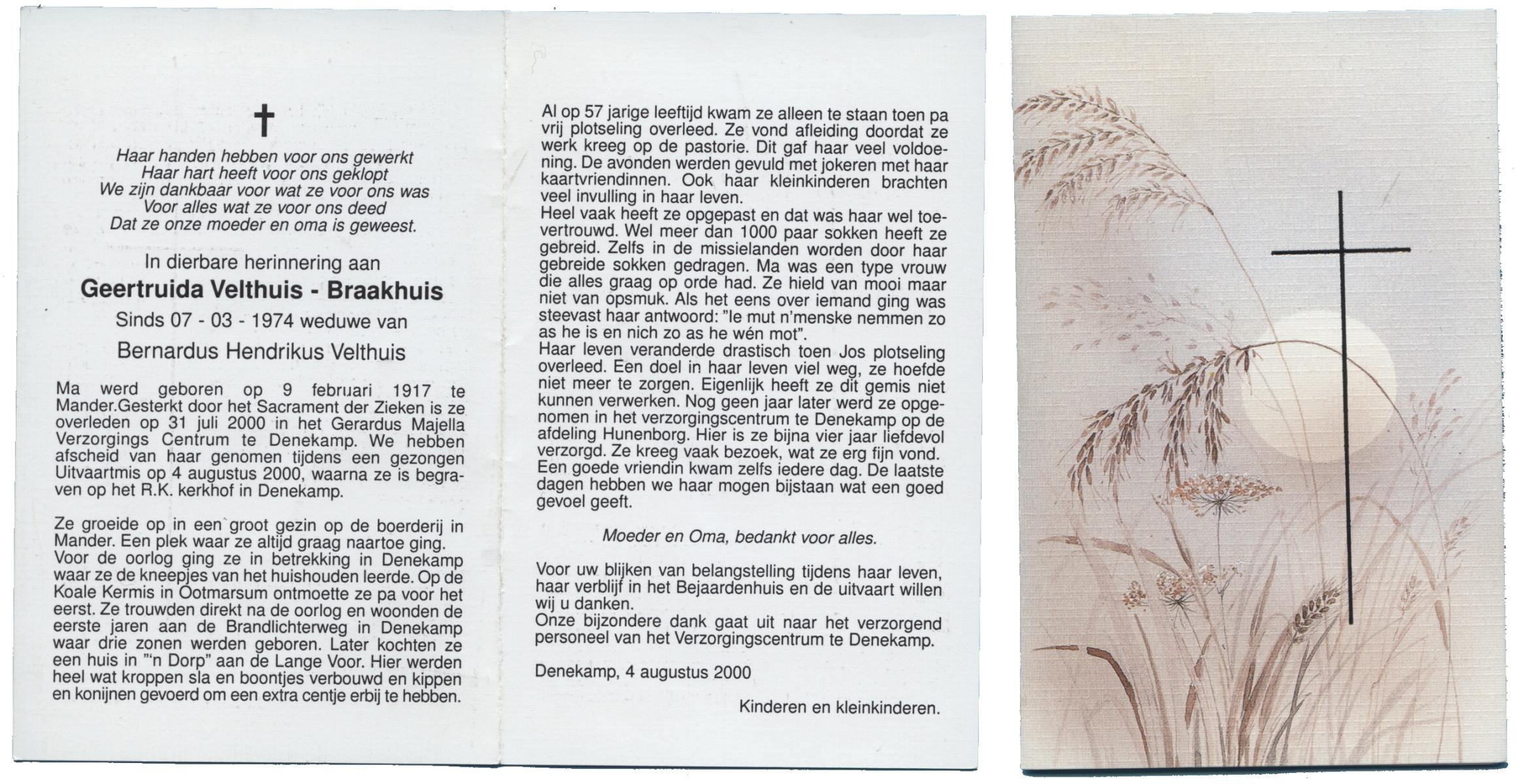 BRAAKHUIS, Geertruida, geboren op 9-2-1917 te Mander, overleden op 31-7-2000 te Denekamp op 83-jarige leeftijd, begraven op 4-8-2000 te Denekamp R.K.kerkhof.