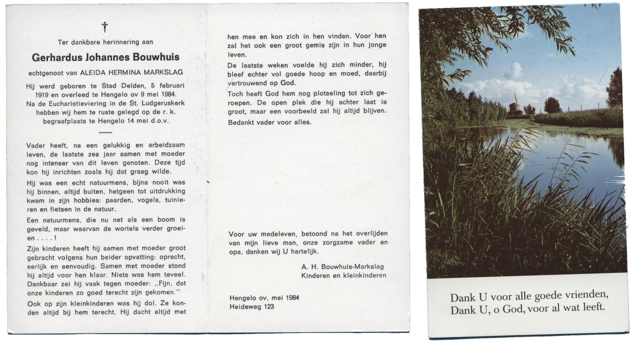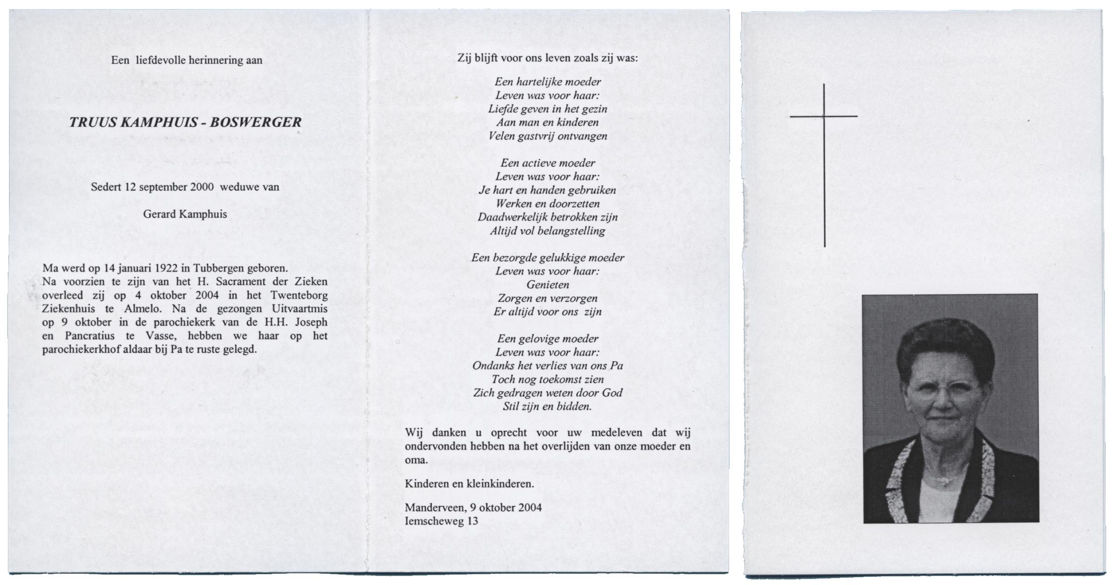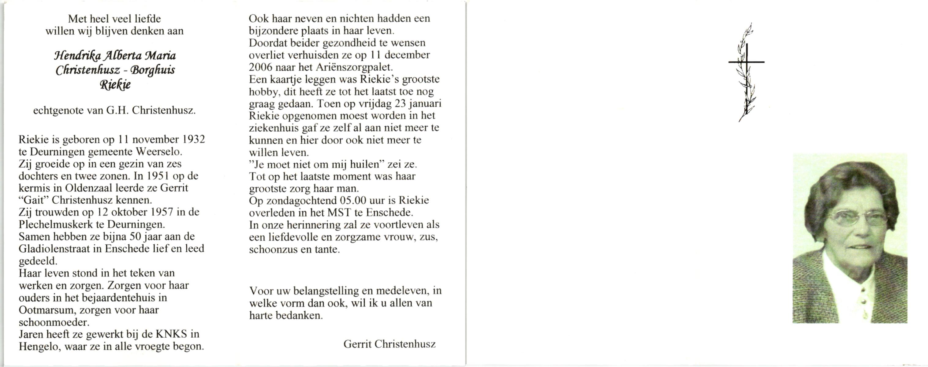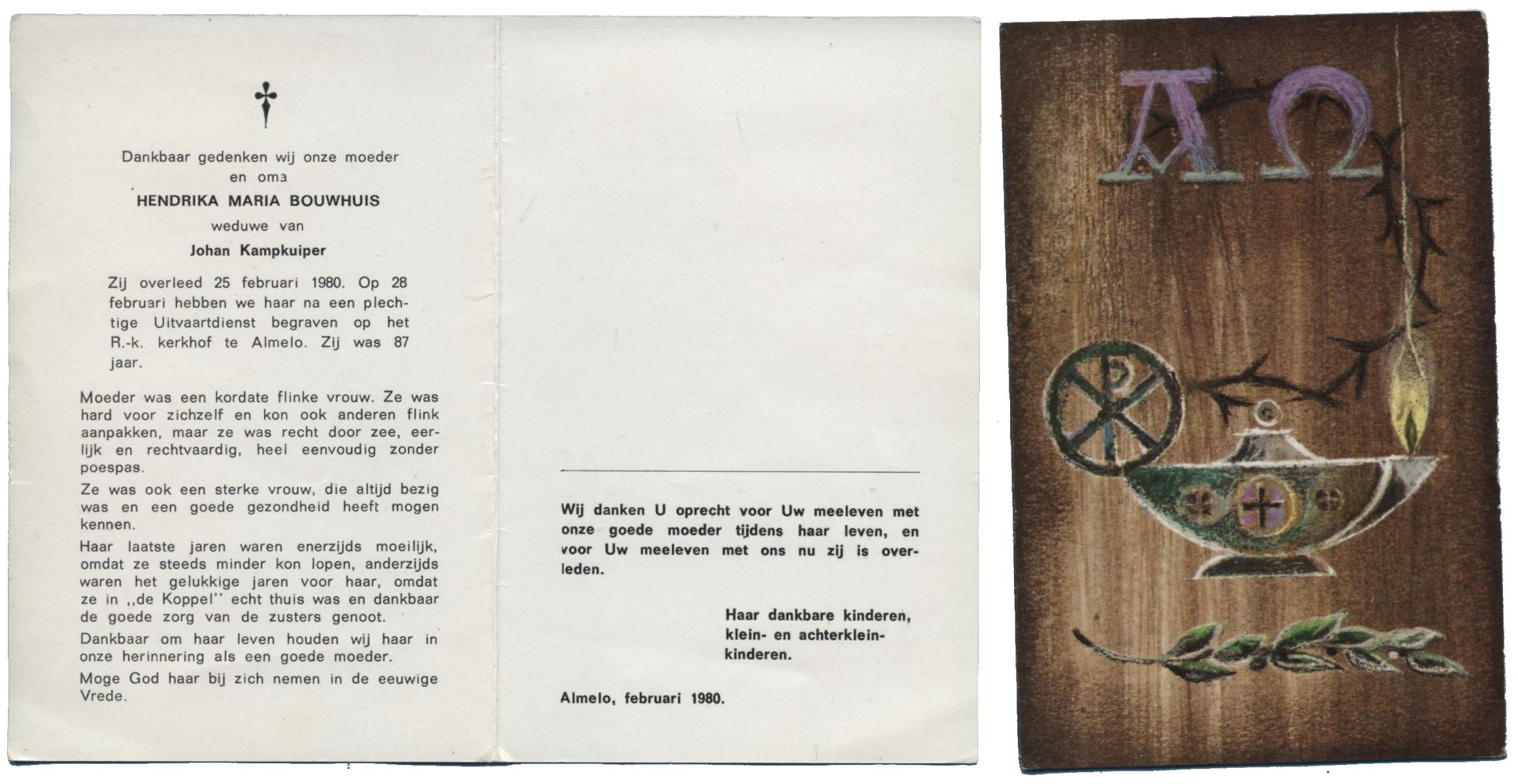 BRAAKHUIS, Geertruida, geboren op 9-2-1917 te Mander, overleden op 31-7-2000 te Denekamp op 83-jarige leeftijd, begraven op 4-8-2000 te Denekamp R.K.kerkhof.