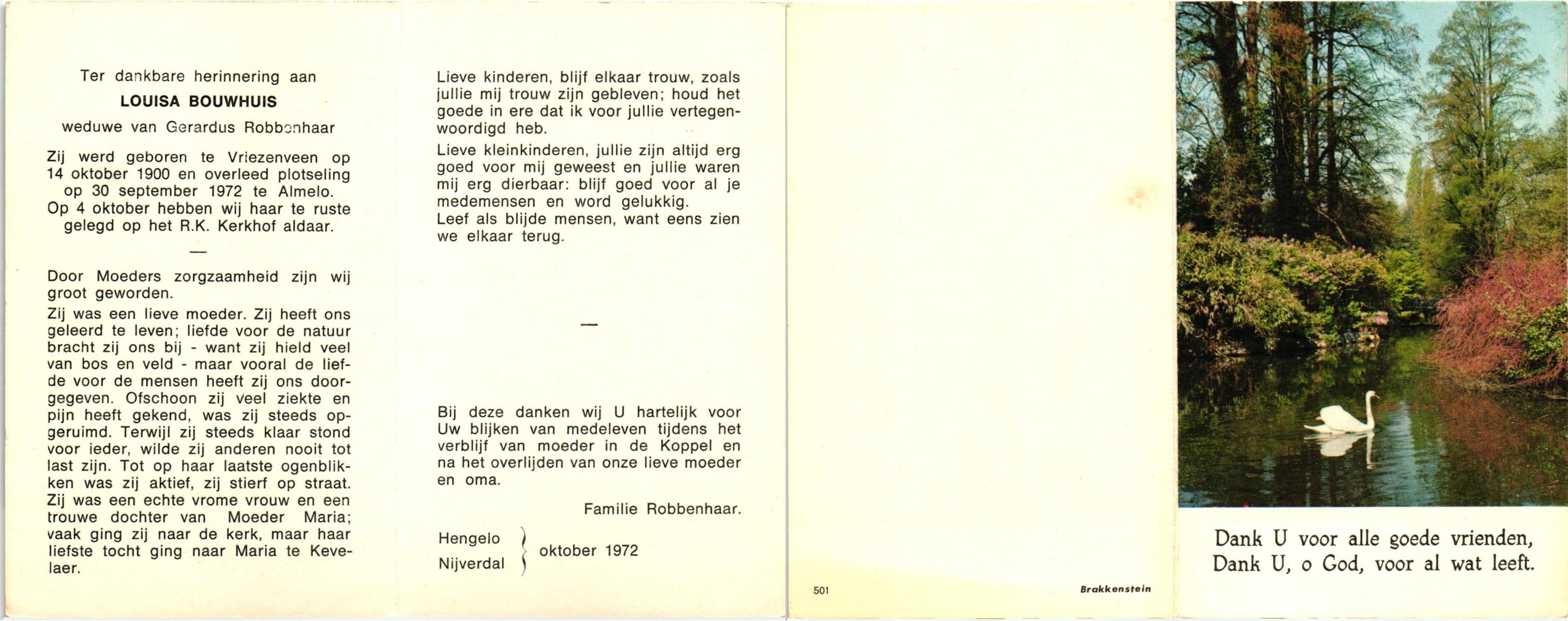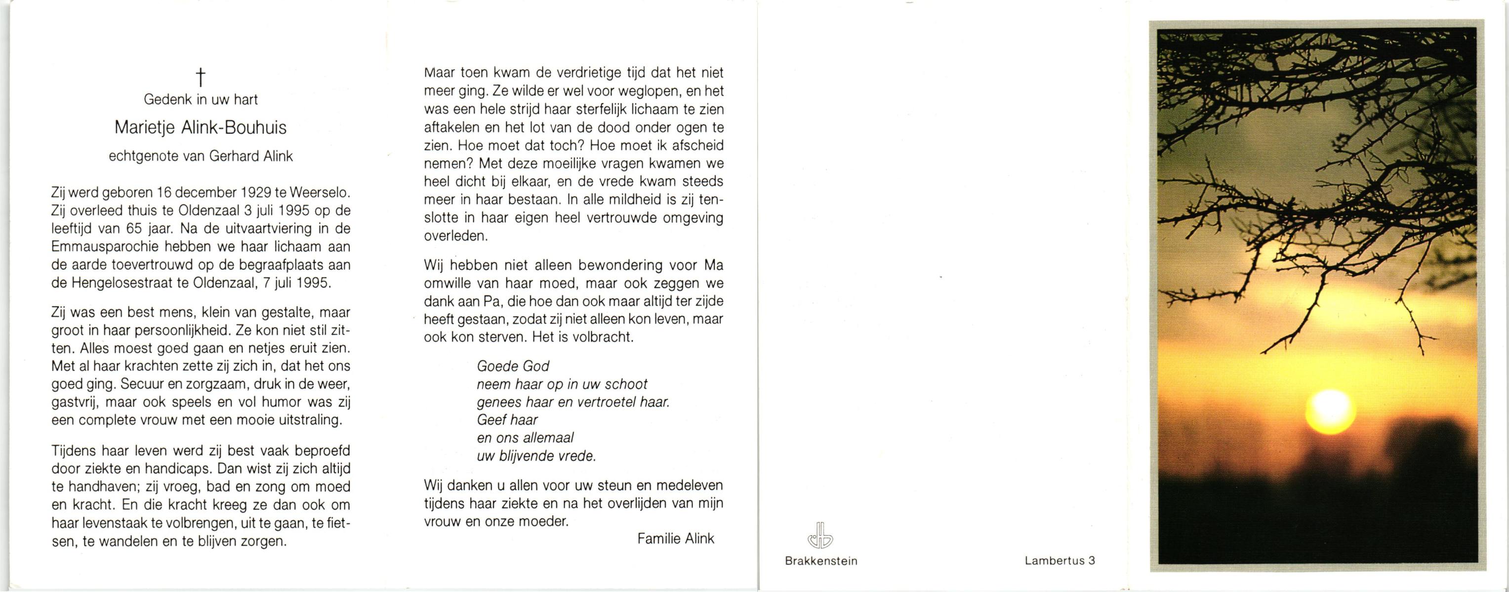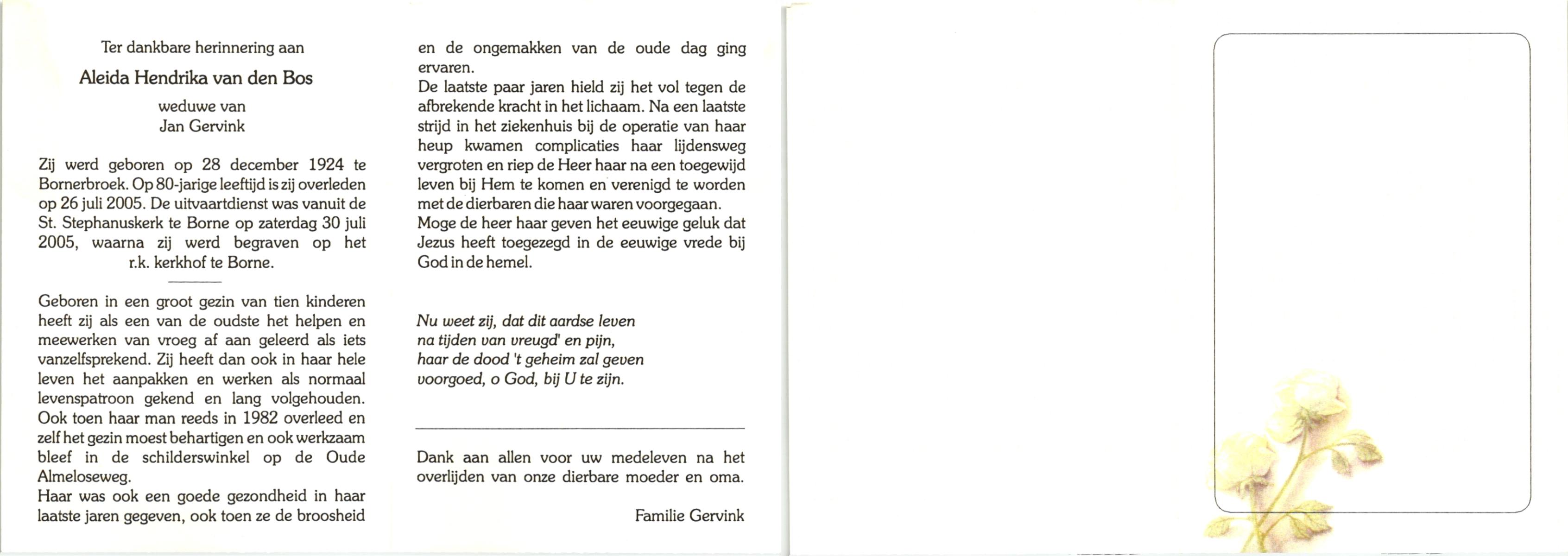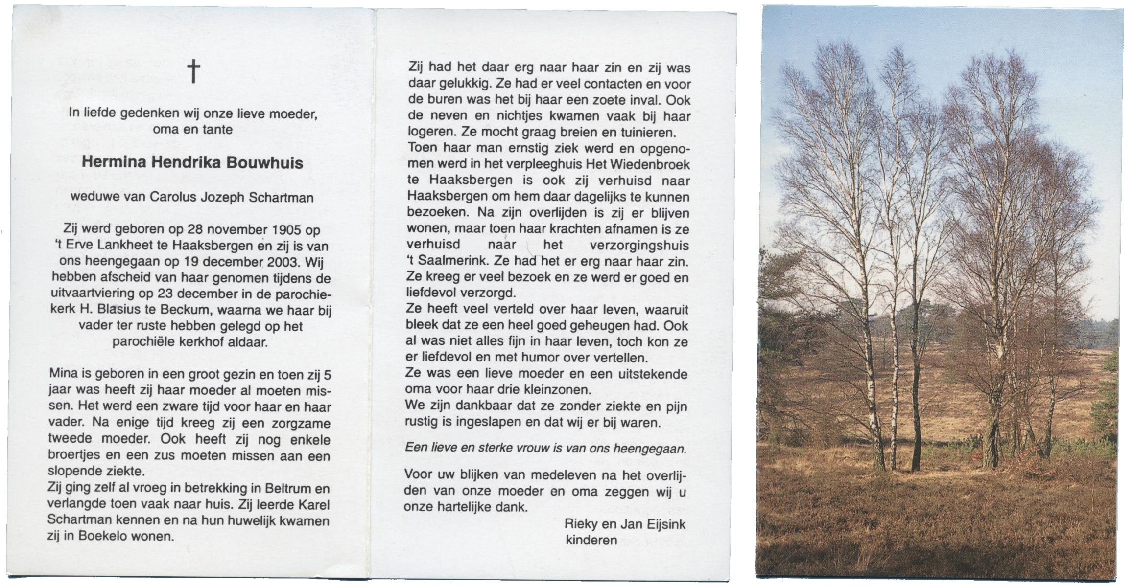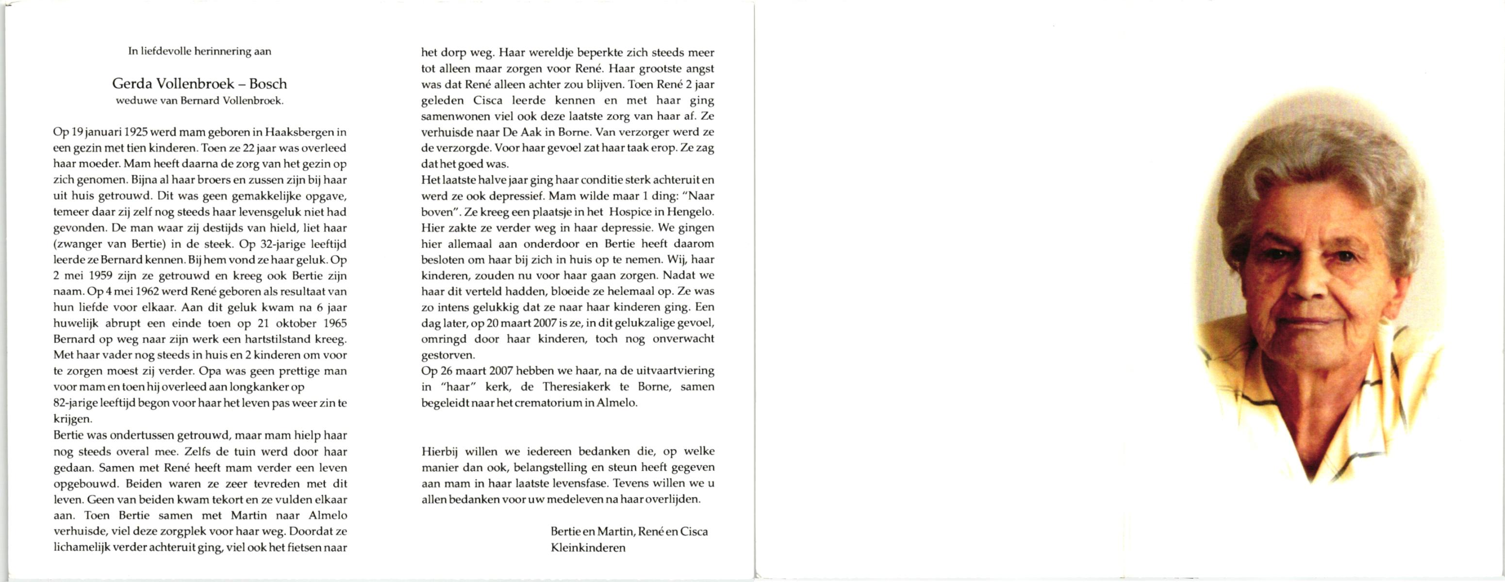 BRAAKHUIS, Geertruida, geboren op 9-2-1917 te Mander, overleden op 31-7-2000 te Denekamp op 83-jarige leeftijd, begraven op 4-8-2000 te Denekamp R.K.kerkhof.