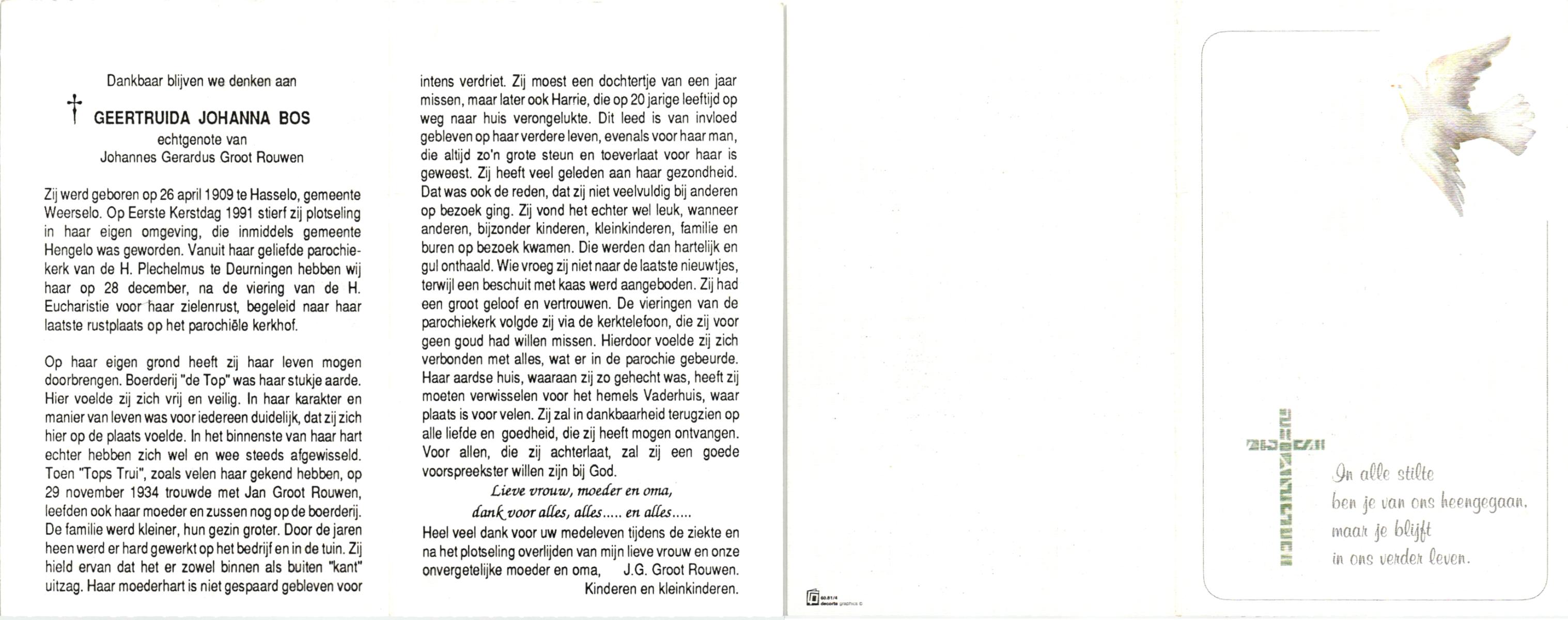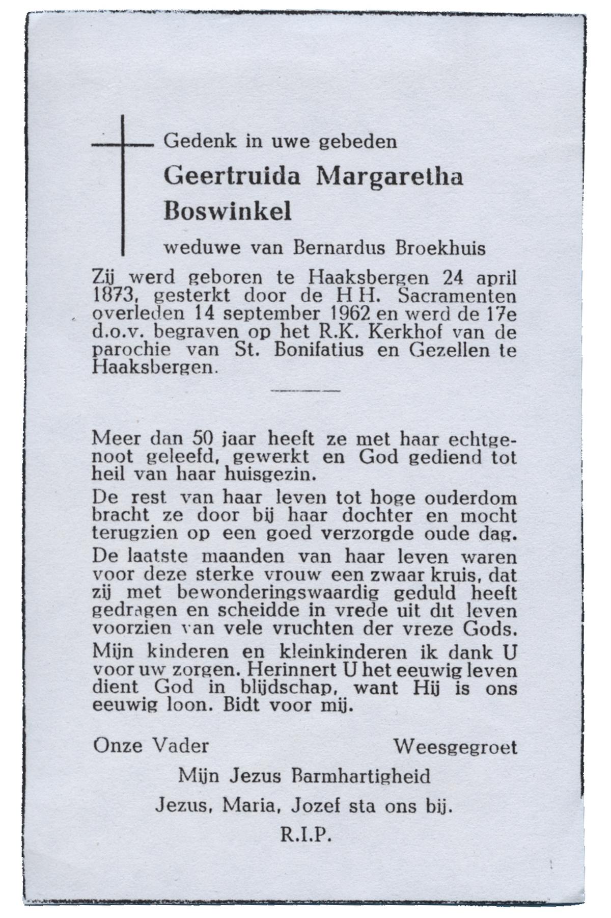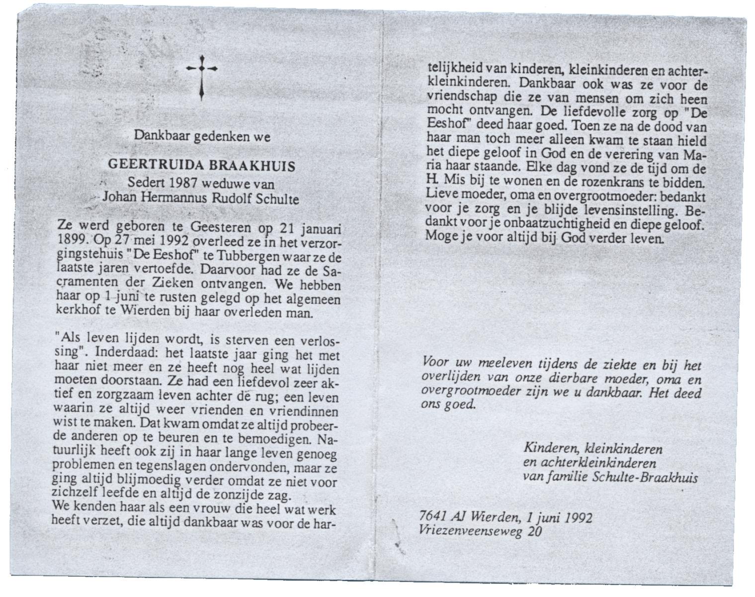 BRAAKHUIS, Geertruida, geboren op 21-01-1899 te Geesteren (Ov.), overleden op 27-5-1992 te Tubbergen op 93-jarige leeftijd, begraven op 1-6-1992 te Wierden.