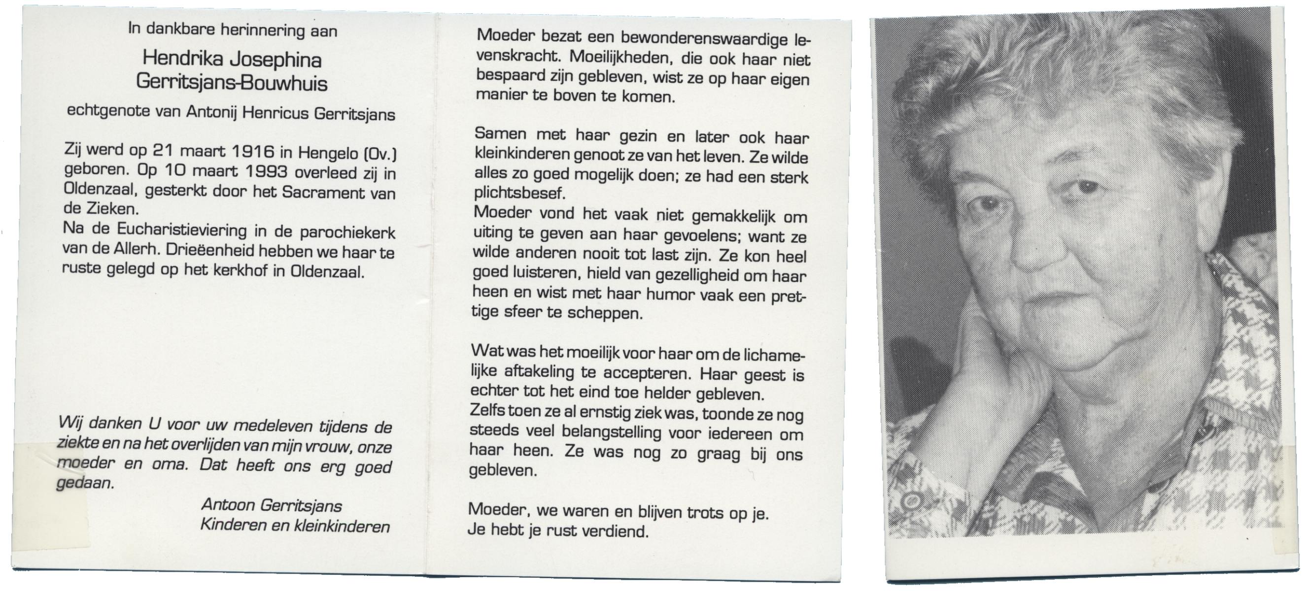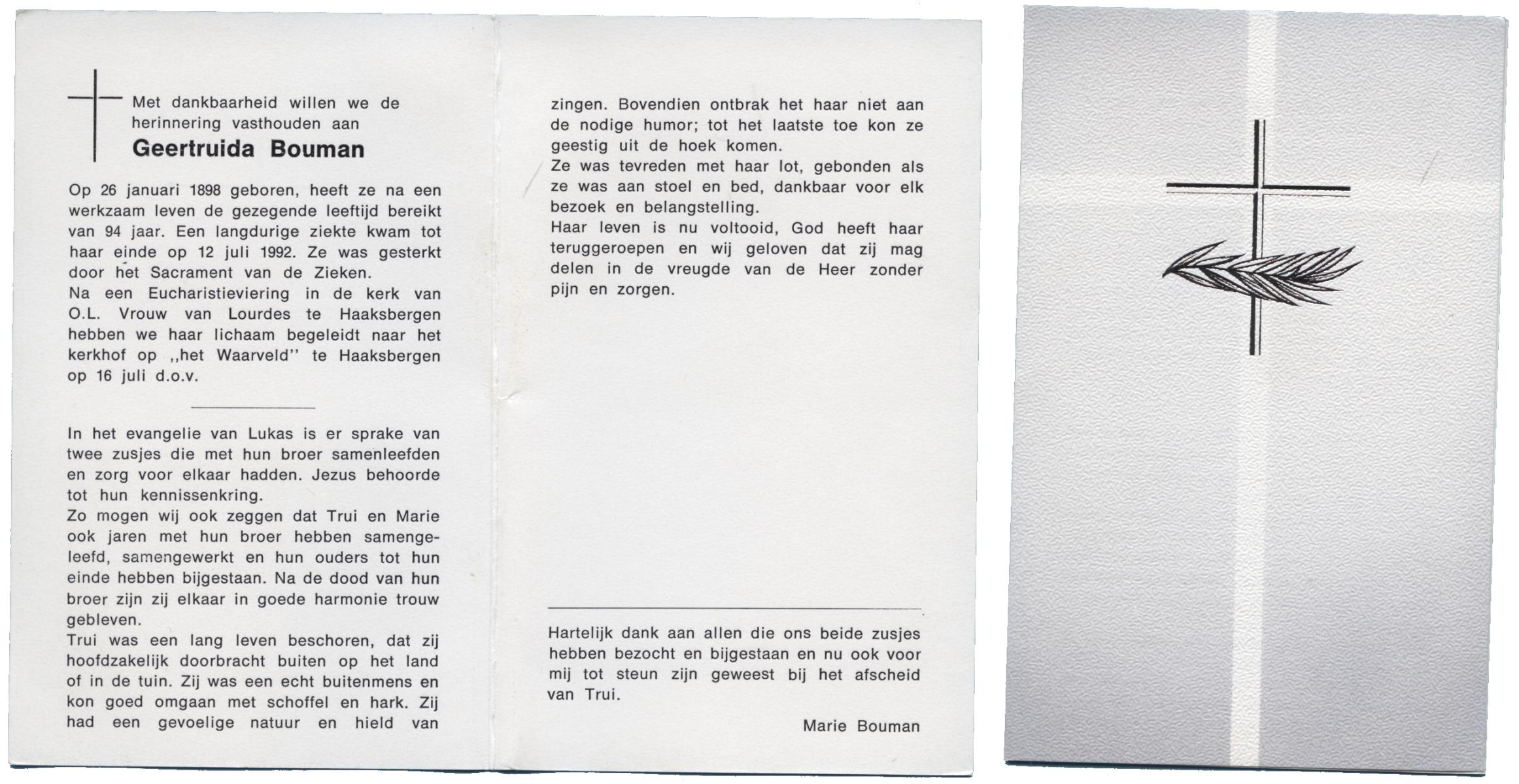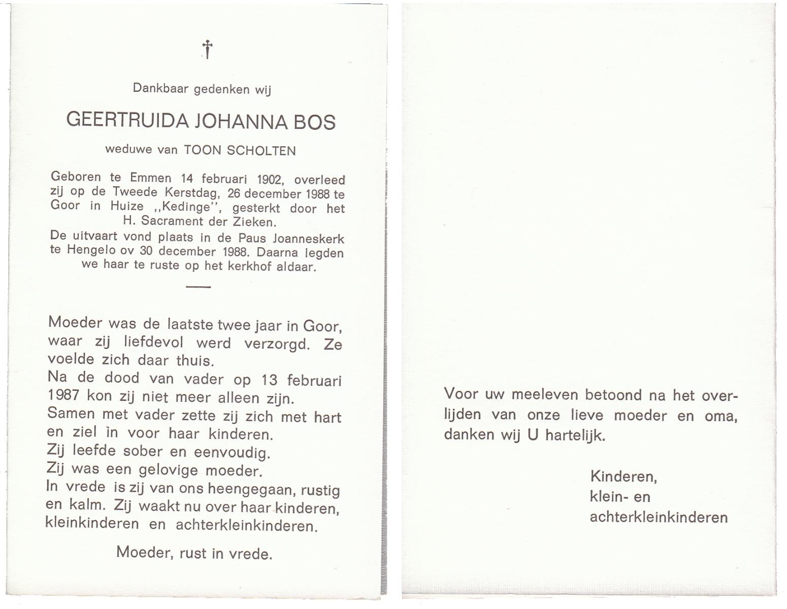 BRAAKHUIS, Geertruida, geboren op 21-01-1899 te Geesteren (Ov.), overleden op 27-5-1992 te Tubbergen op 93-jarige leeftijd, begraven op 1-6-1992 te Wierden.