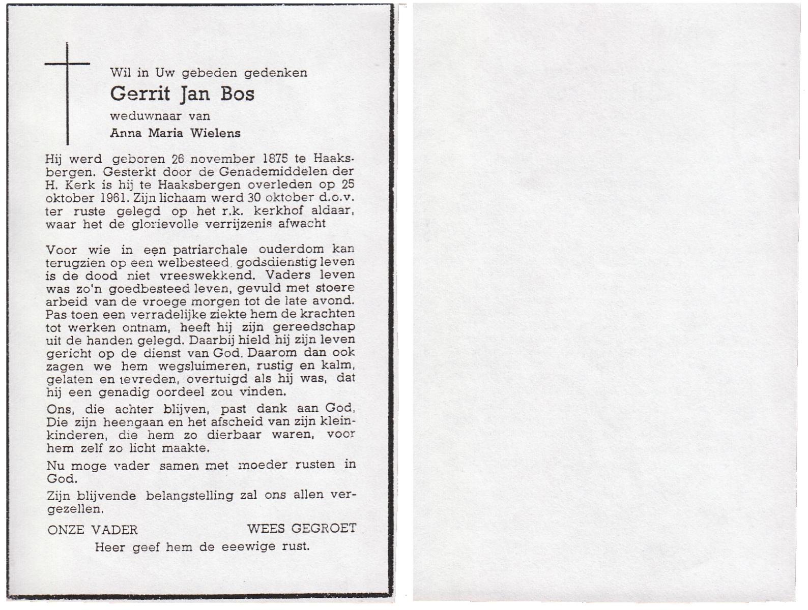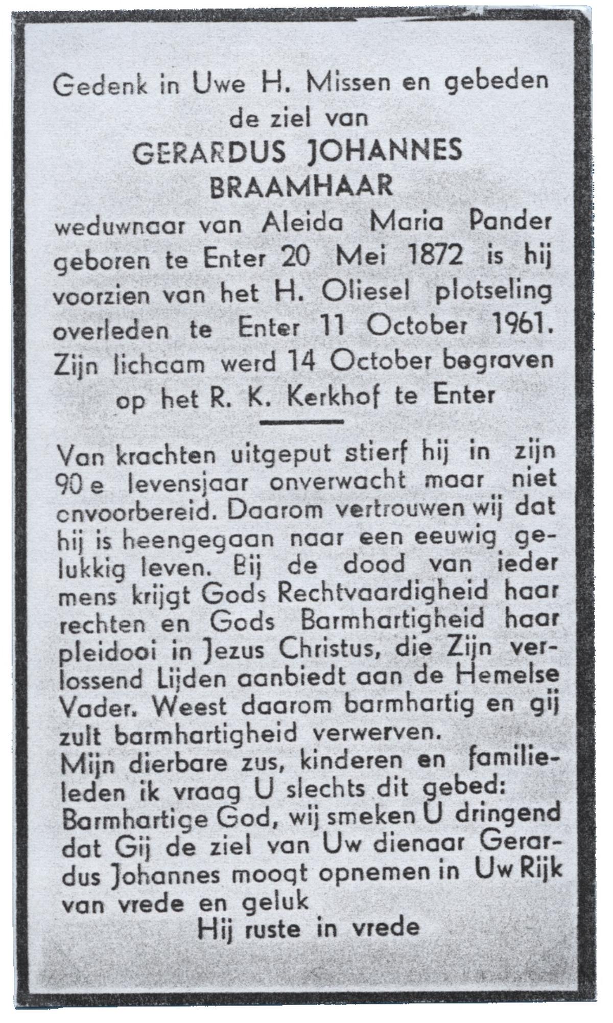 BRAAMHAAR, Gerardus Johannes, geboren op 20-05-1872 te Enter, overleden op 11-10-1961 te Enter op 89-jarige leeftijd, begraven op 14-10-1961 te Wierden.