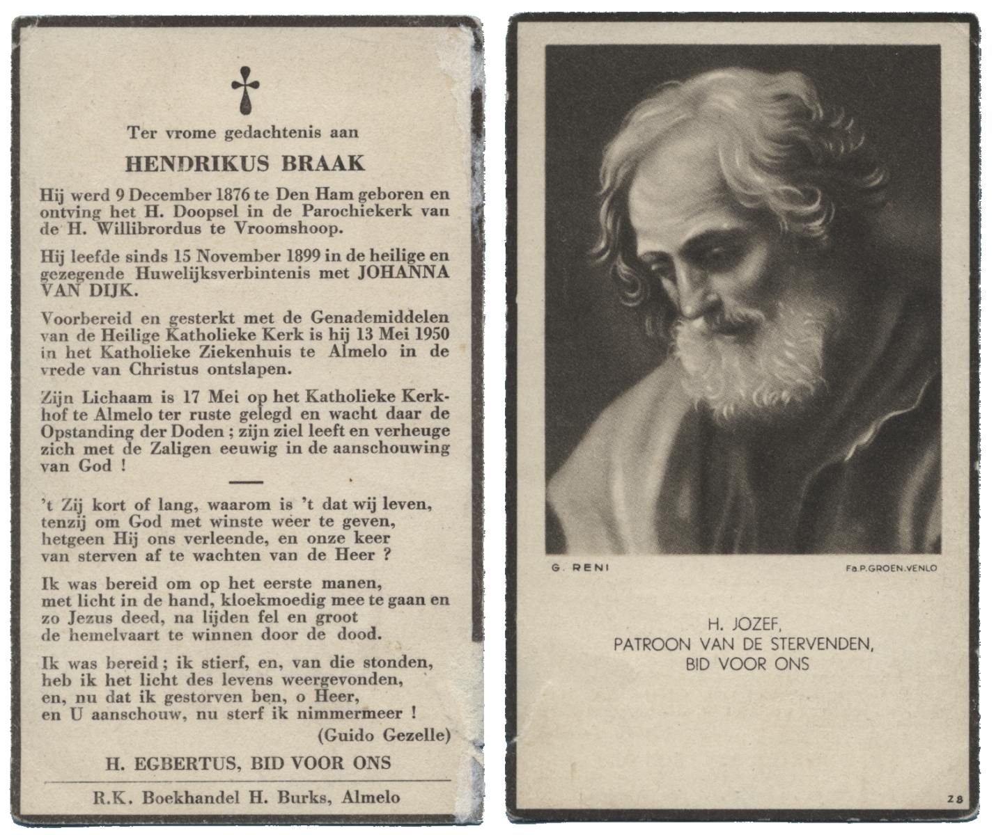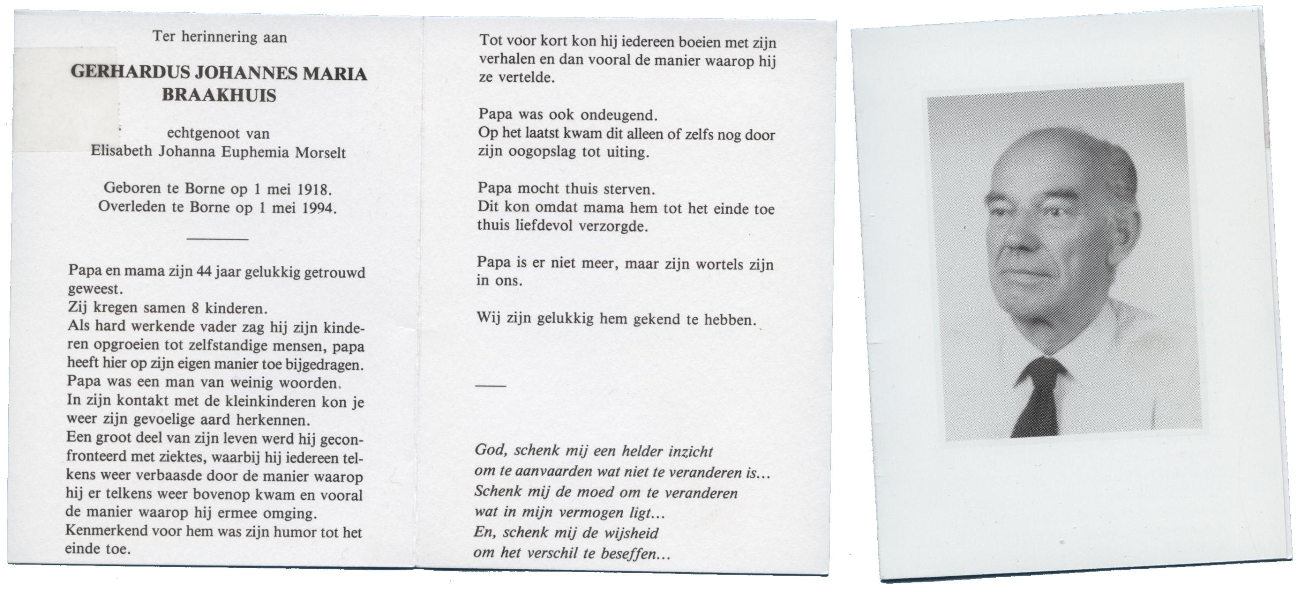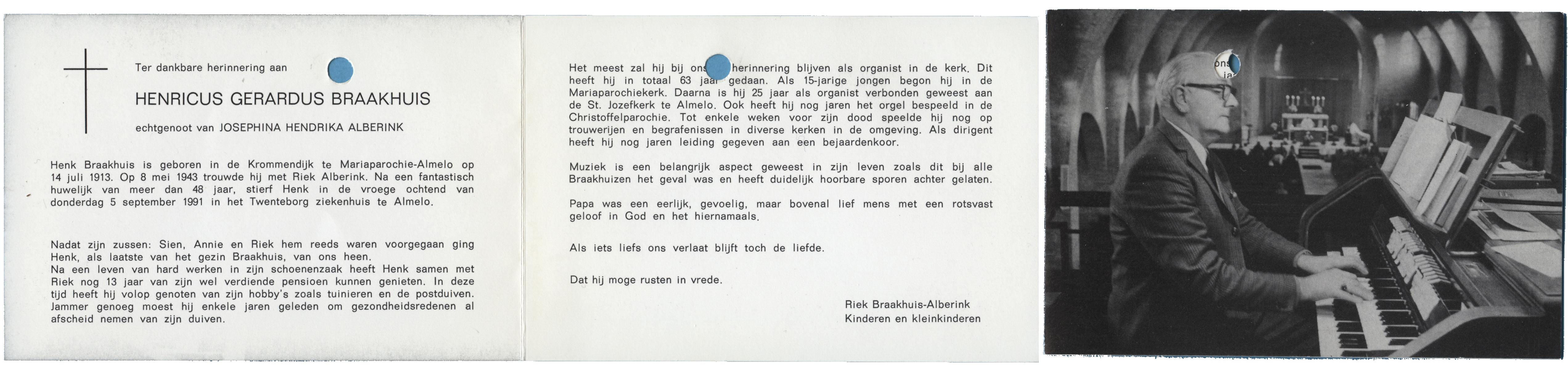 BRAAKHUIS, Henricus Gerardus, geboren op 14-7-1913 te Mariaparochie, Almelo, overleden op 5-9-1991 te Almelo op 78-jarige leeftijd.