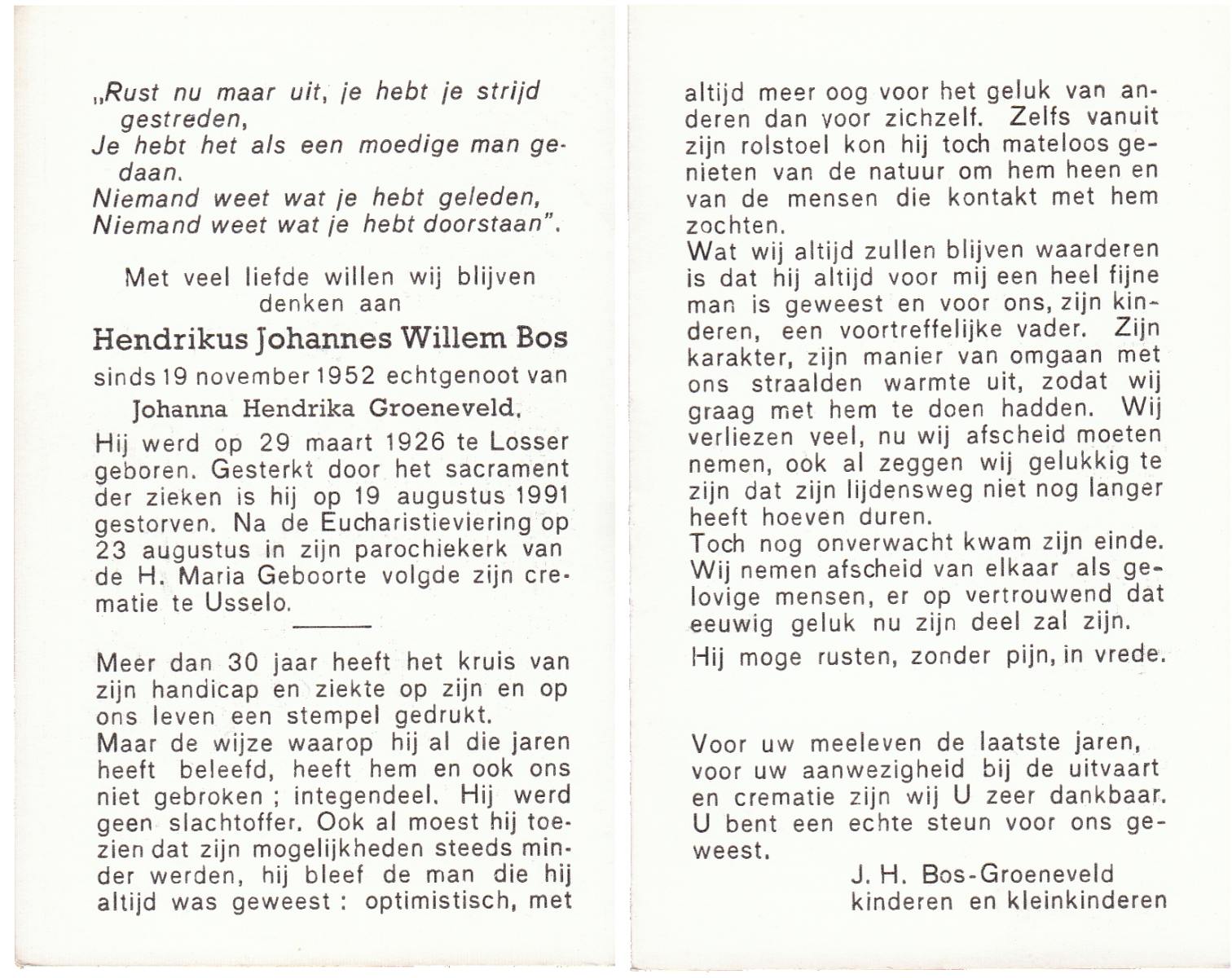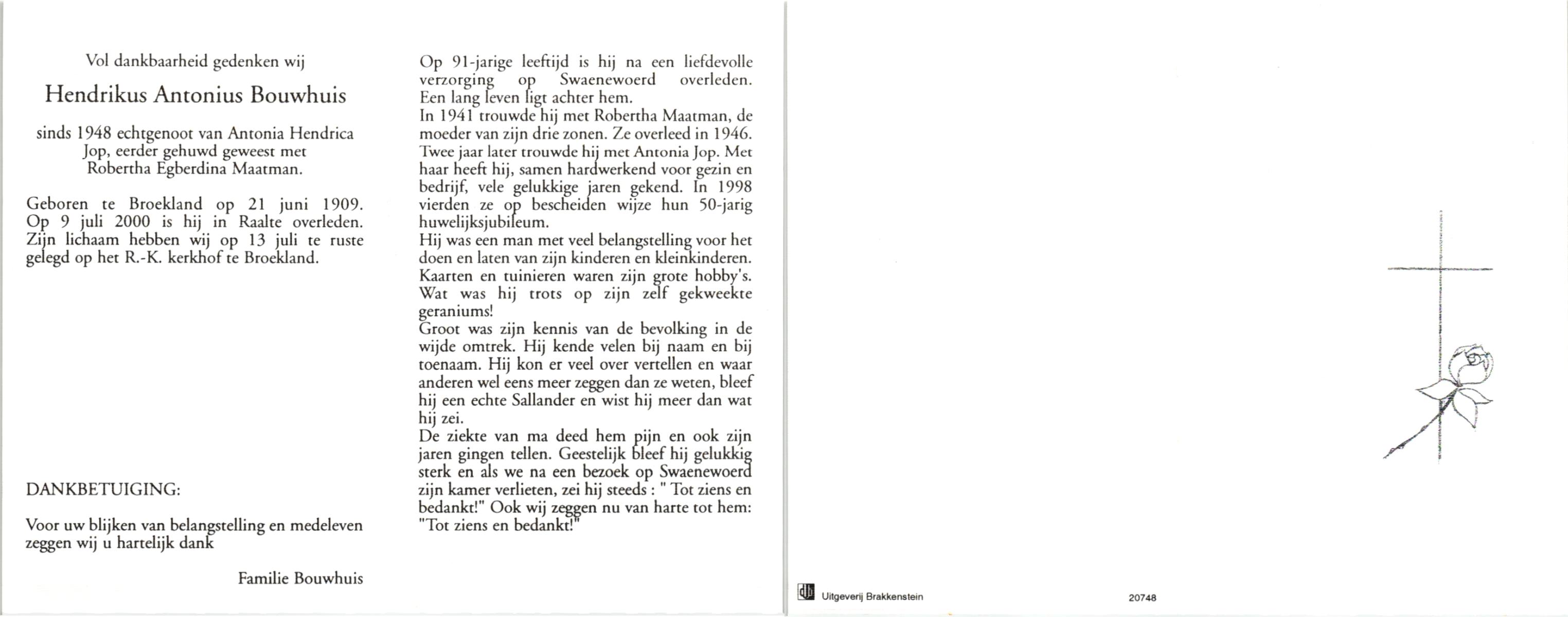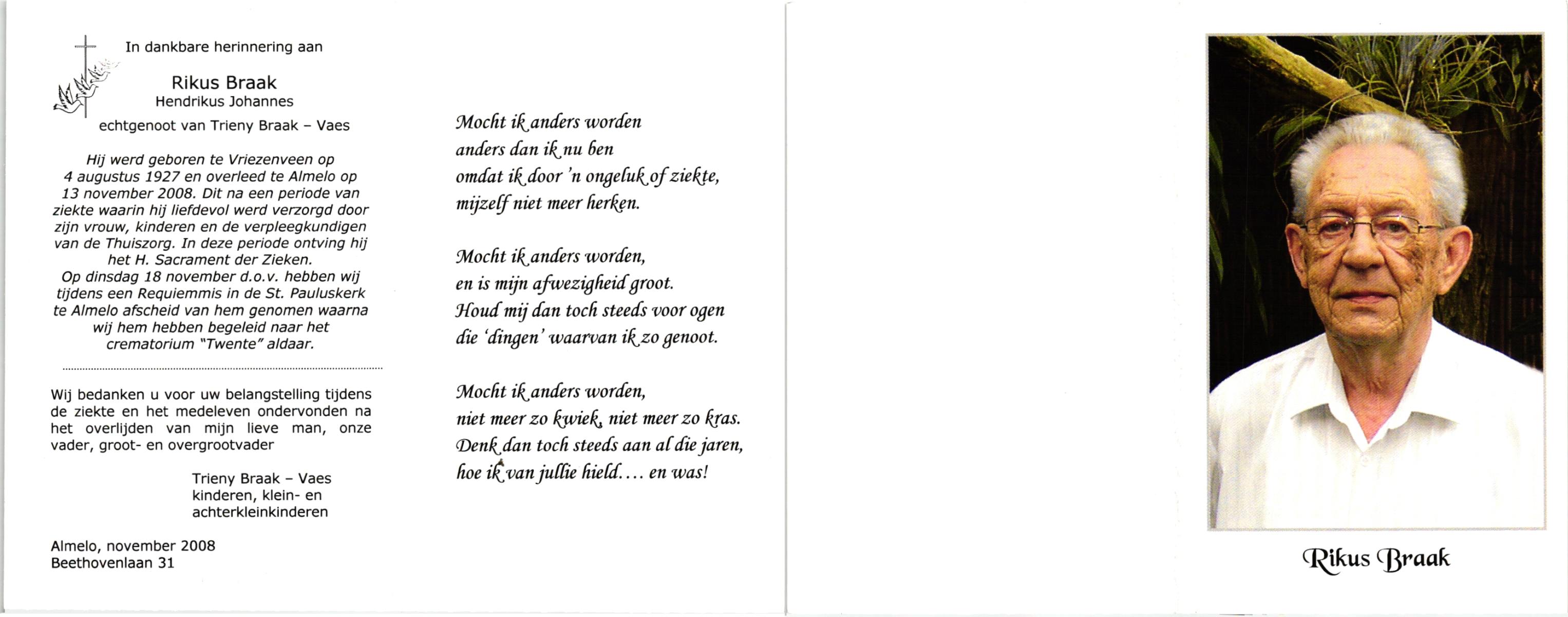 BRAAKHUIS, Henricus Gerardus, geboren op 14-7-1913 te Mariaparochie, Almelo, overleden op 5-9-1991 te Almelo op 78-jarige leeftijd.