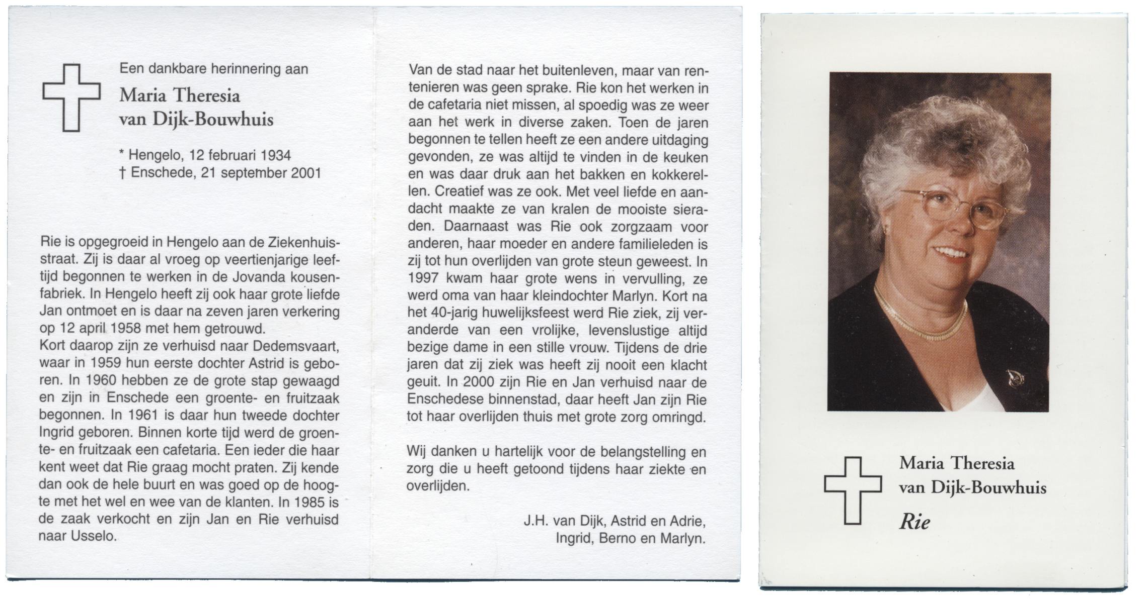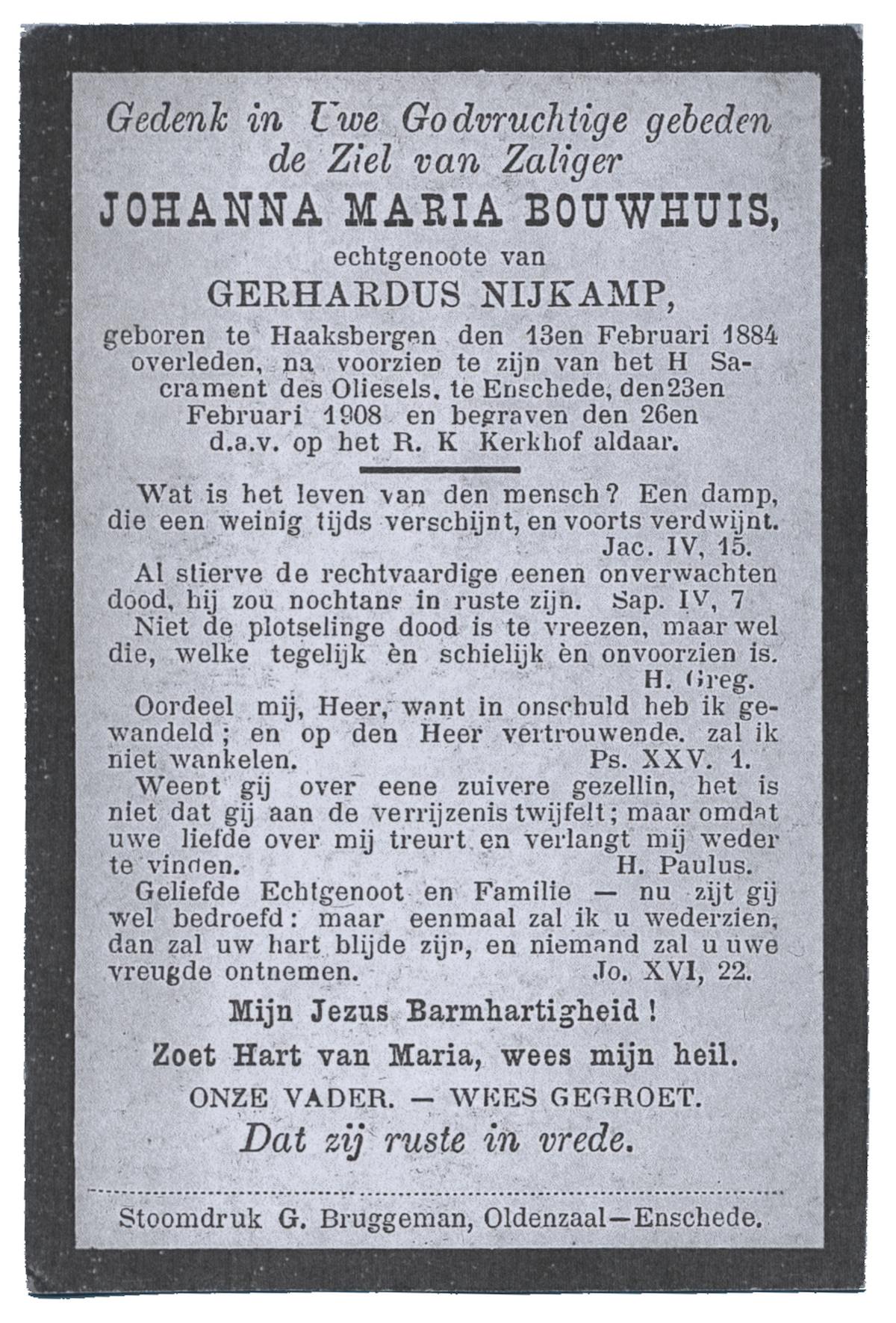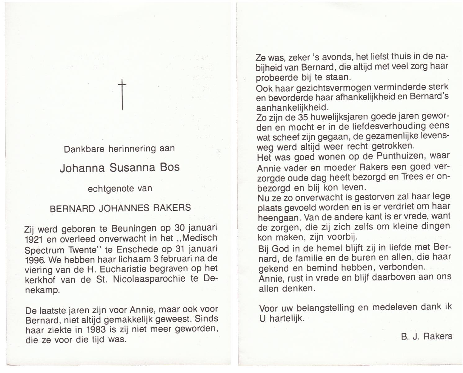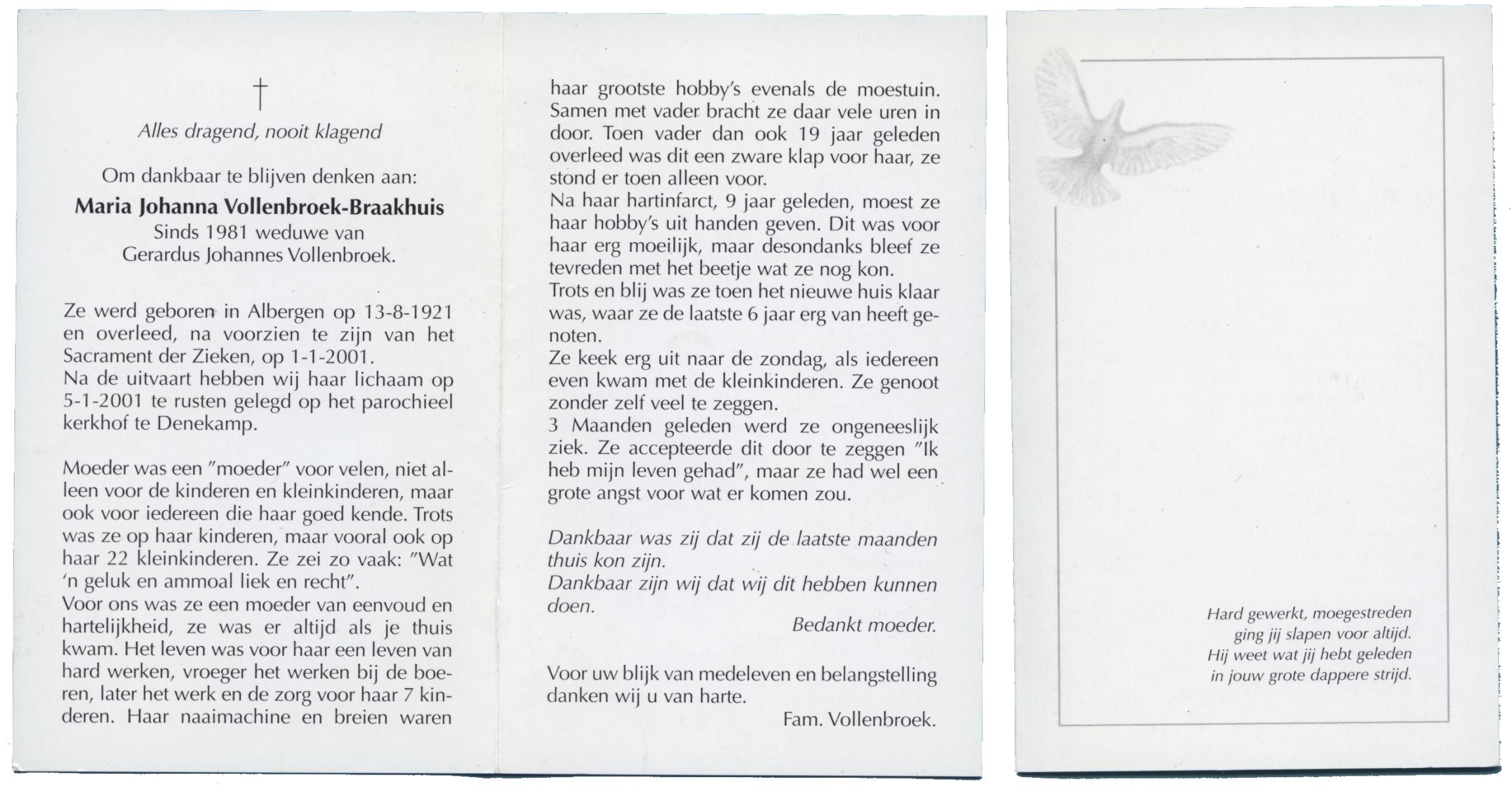 BRAAKHUIS, Maria Johanna, geboren op 13-8-1921 te Albergen, overleden op 1-1-2001 op 79-jarige leeftijd, begraven op 5-1-2001 te Denekamp R.K.kerkhof.