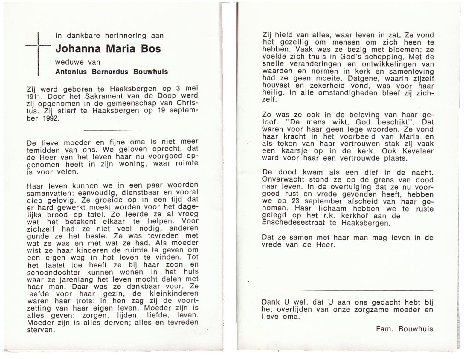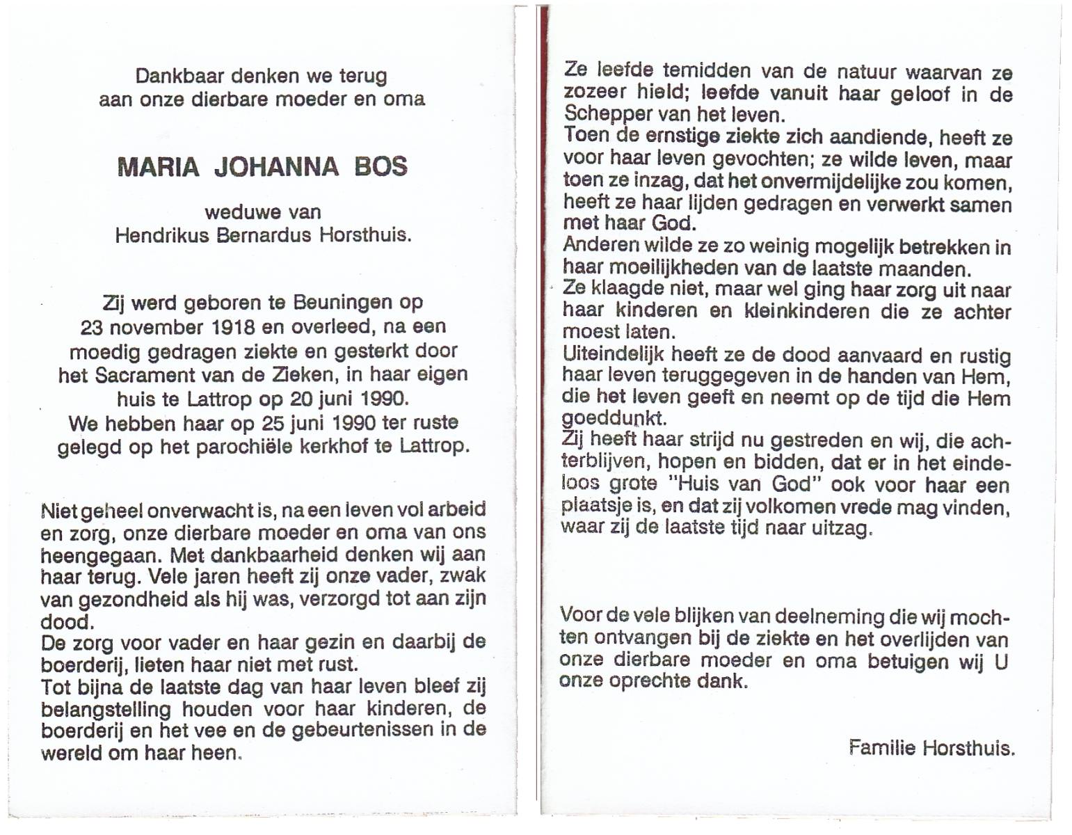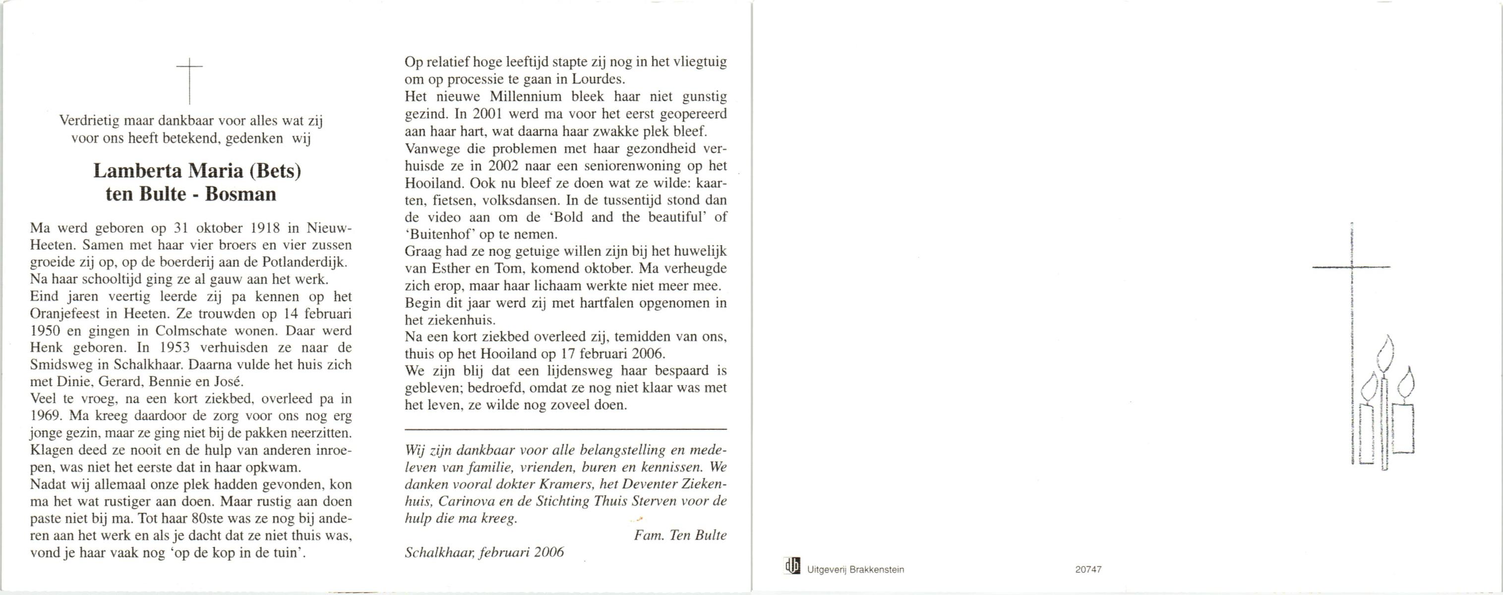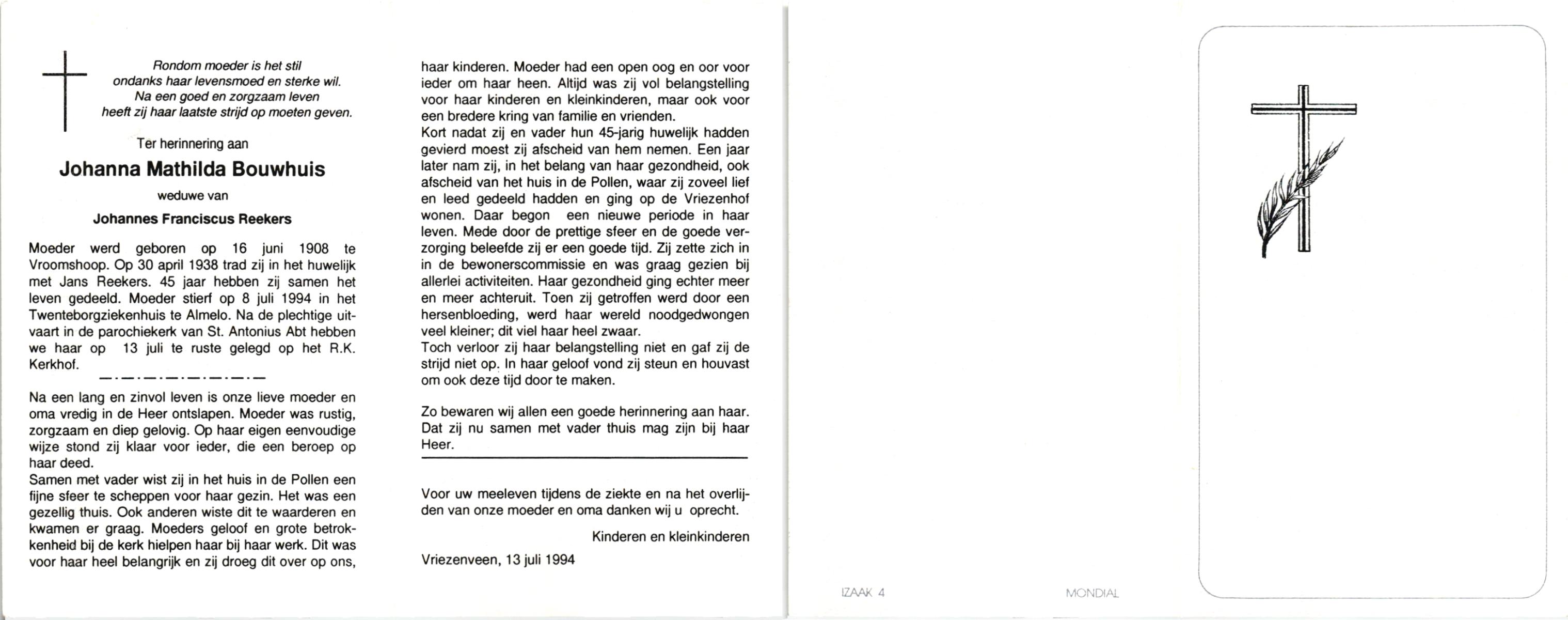 BRAAKHUIS, Maria Johanna, geboren op 13-8-1921 te Albergen, overleden op 1-1-2001 op 79-jarige leeftijd, begraven op 5-1-2001 te Denekamp R.K.kerkhof.