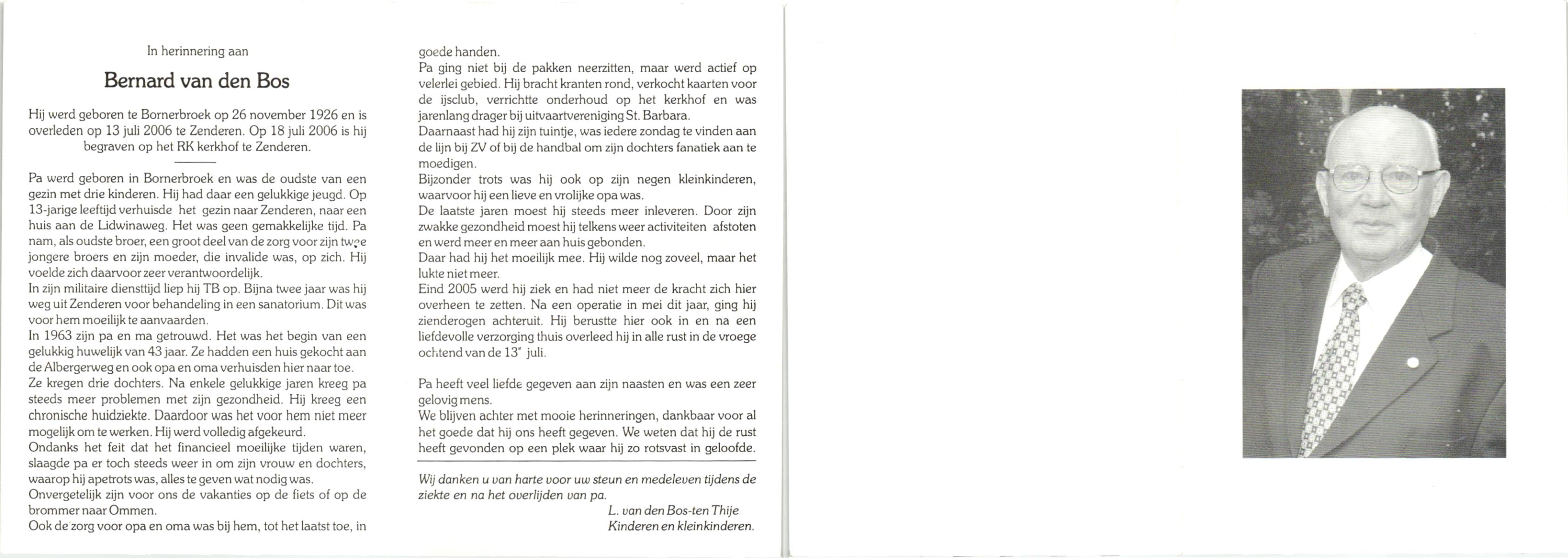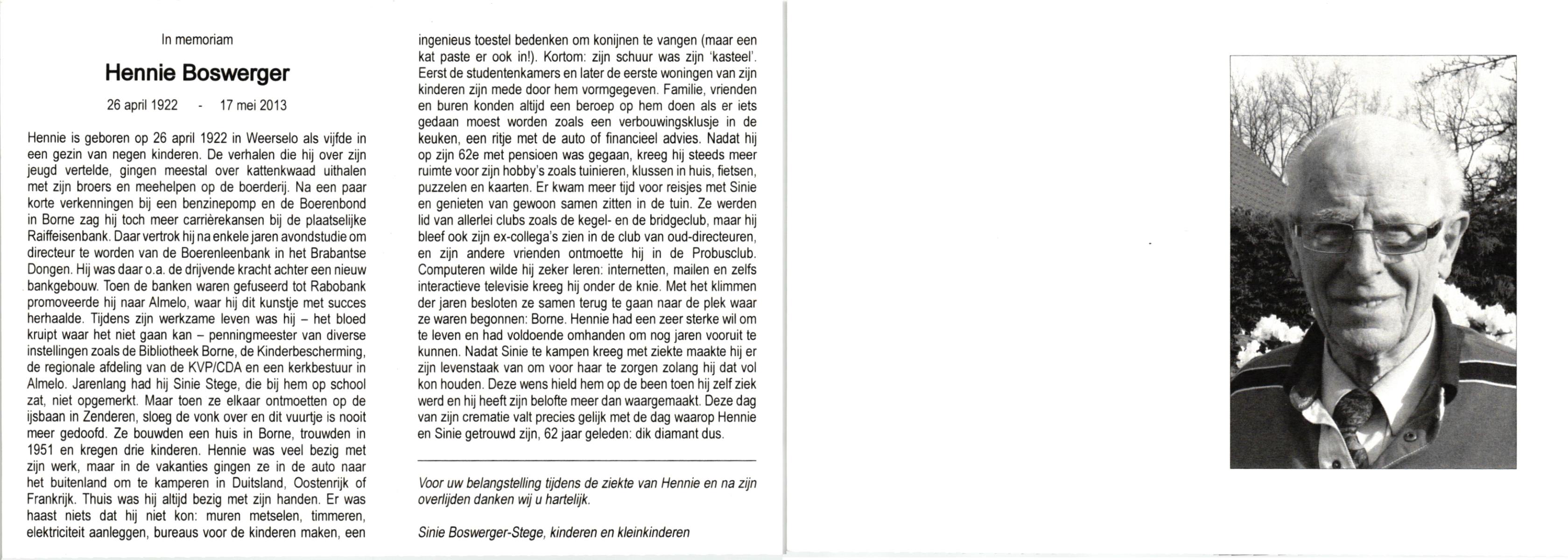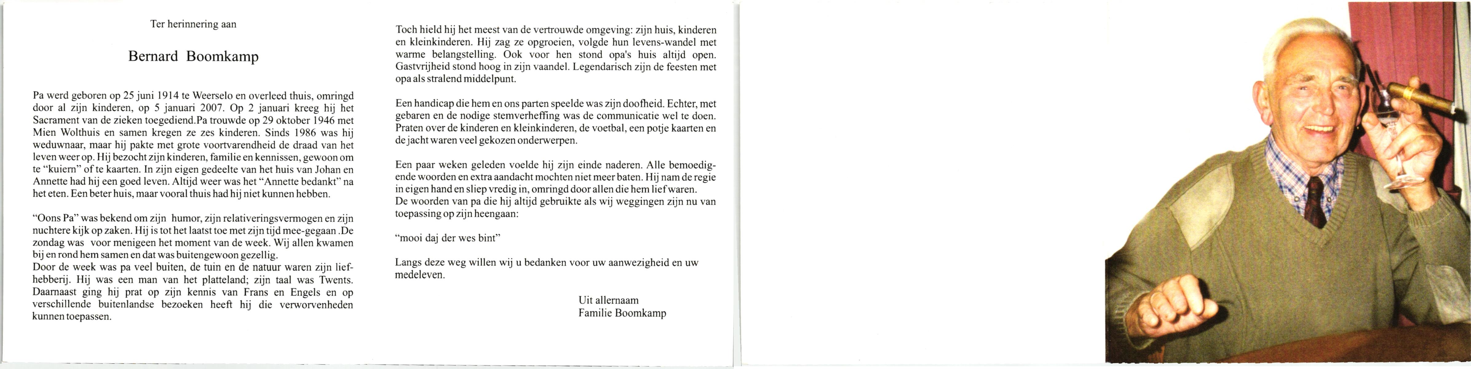 BOOMKAMP, , Bernard, geboren op 25-6-1914 te Weerselo, overleden op 5-1-2007 op 92-jarige leeftijd.