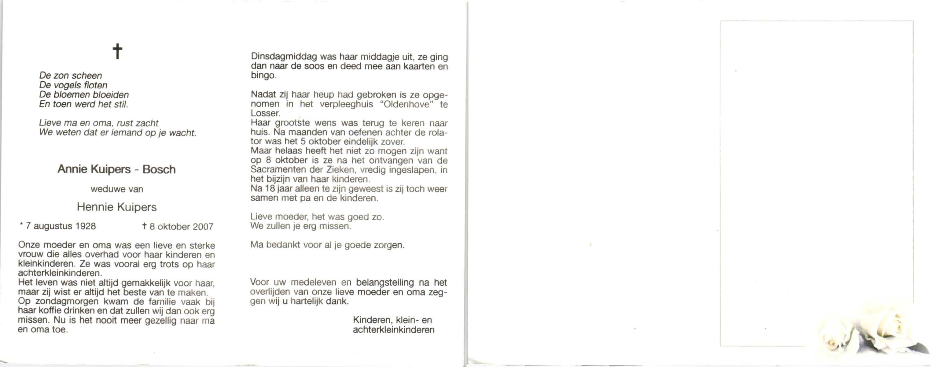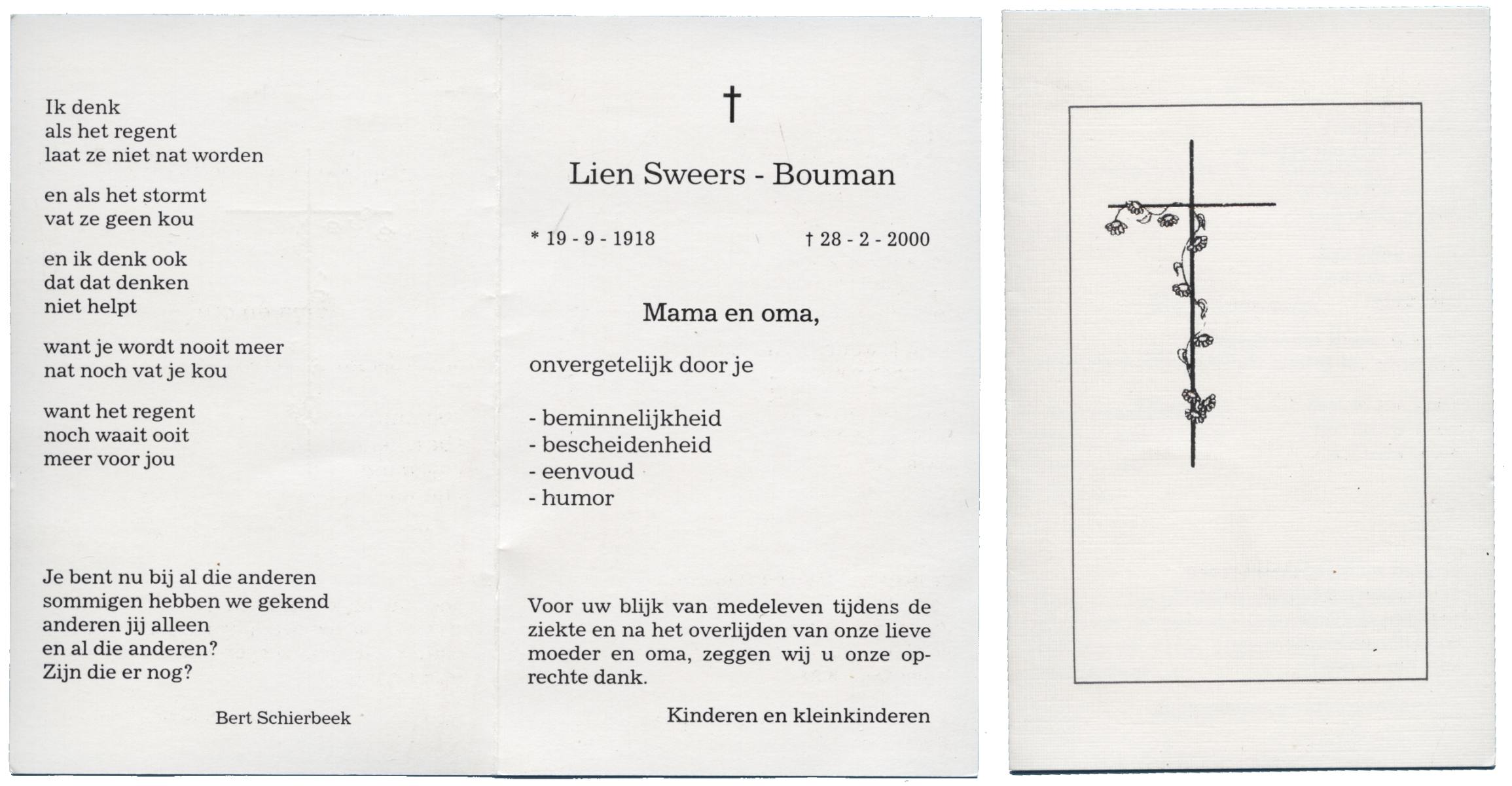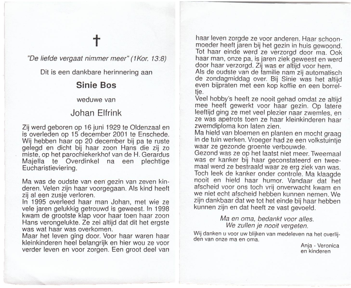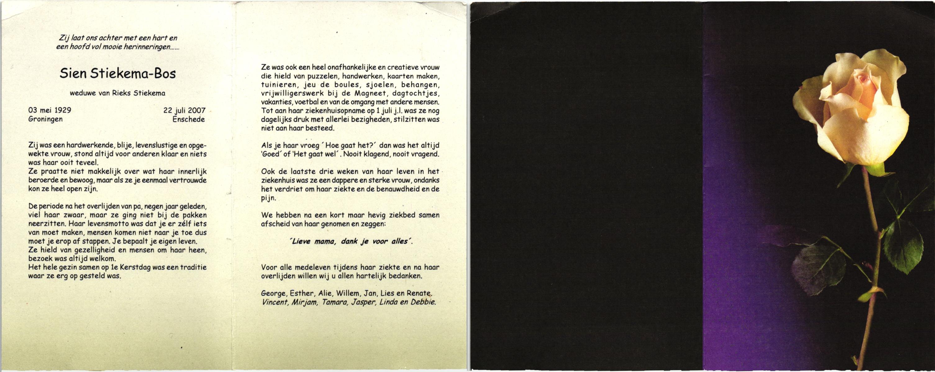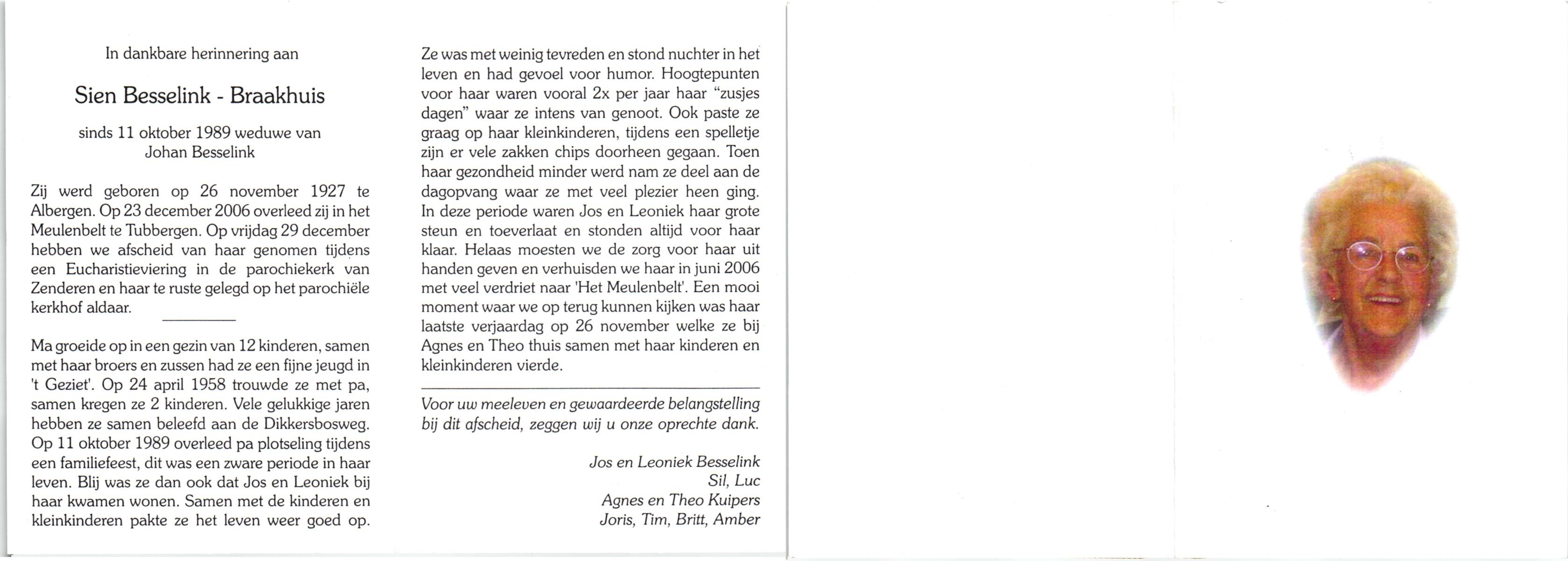 BRAAKHUIS, Sien, geboren op 26-11-1927 te Albergen, overleden op 23-12-2006 te Tubbergen op 79-jarige leeftijd, begraven op 29-12-2006 te Tubbergen.