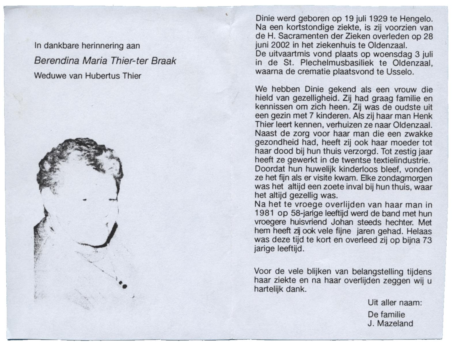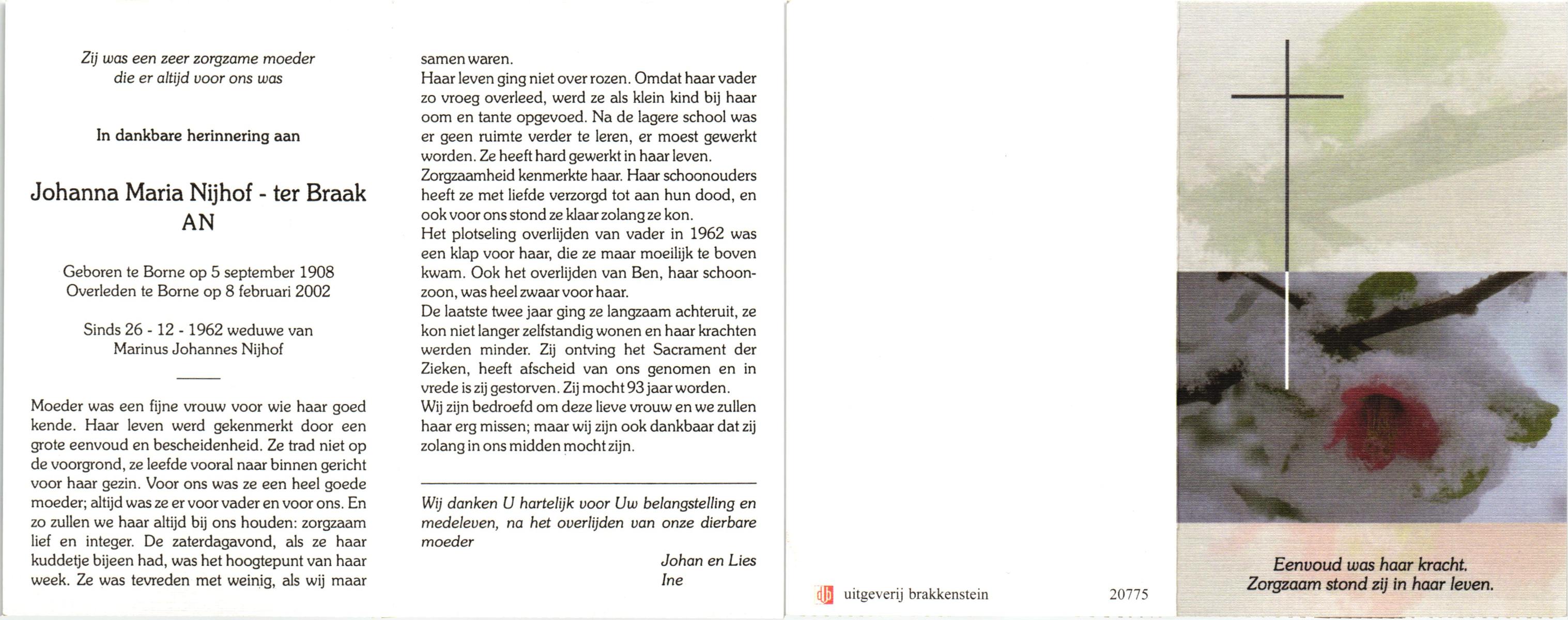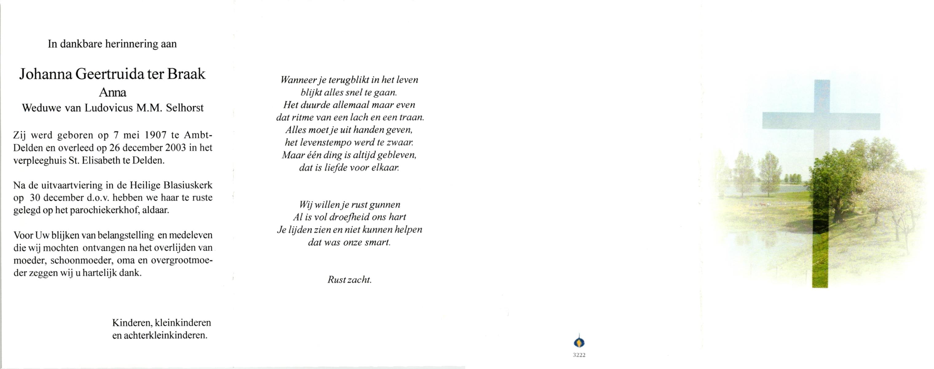 BRAAK, ter, Johanna Geertruida (Anna), geboren op 7-5-1907 te Delden, Ambt, overleden op 26-12-2003 te Delden op 95-jarige leeftijd, begraven op 30-12-2003 te Delden.
