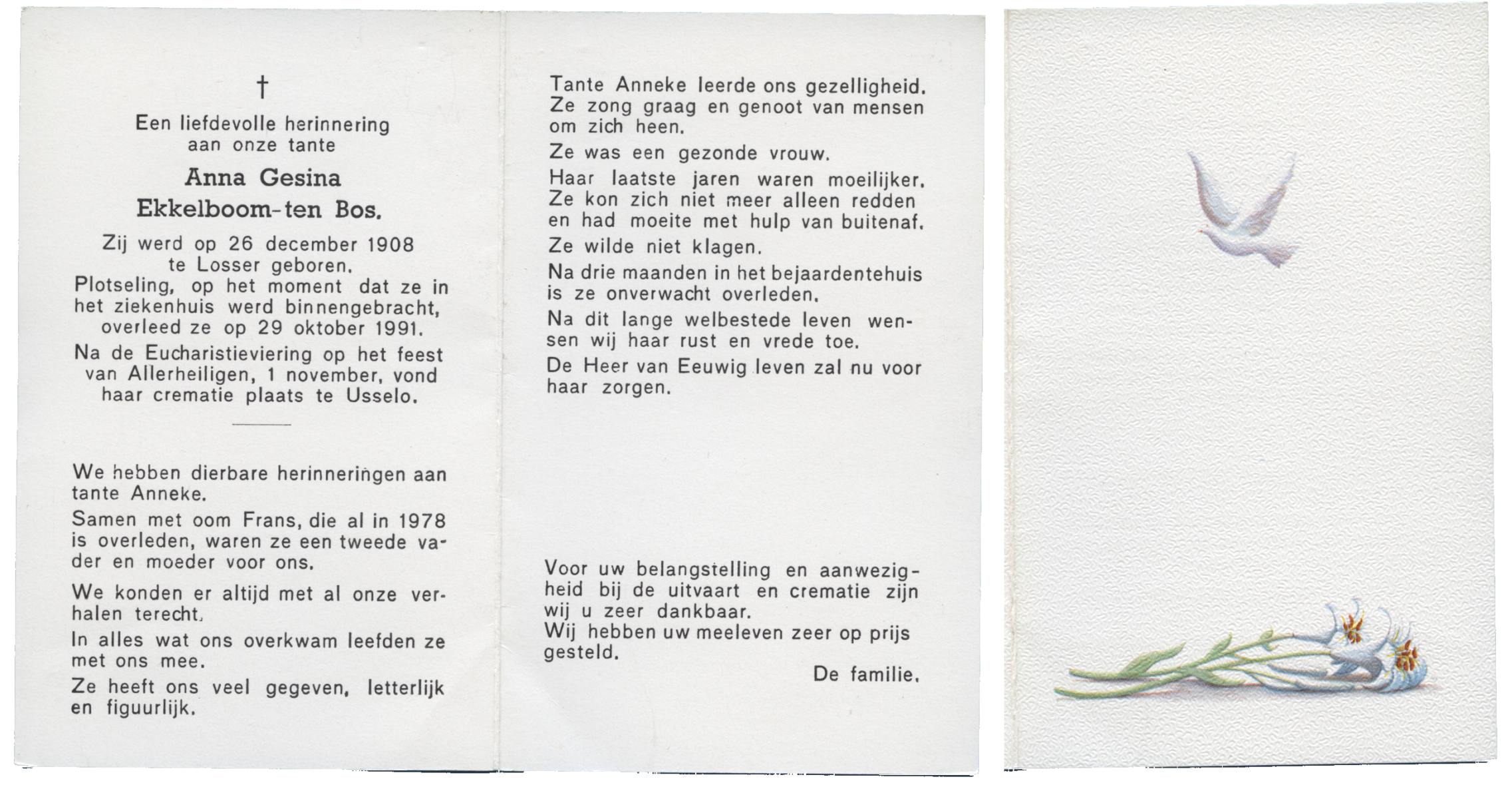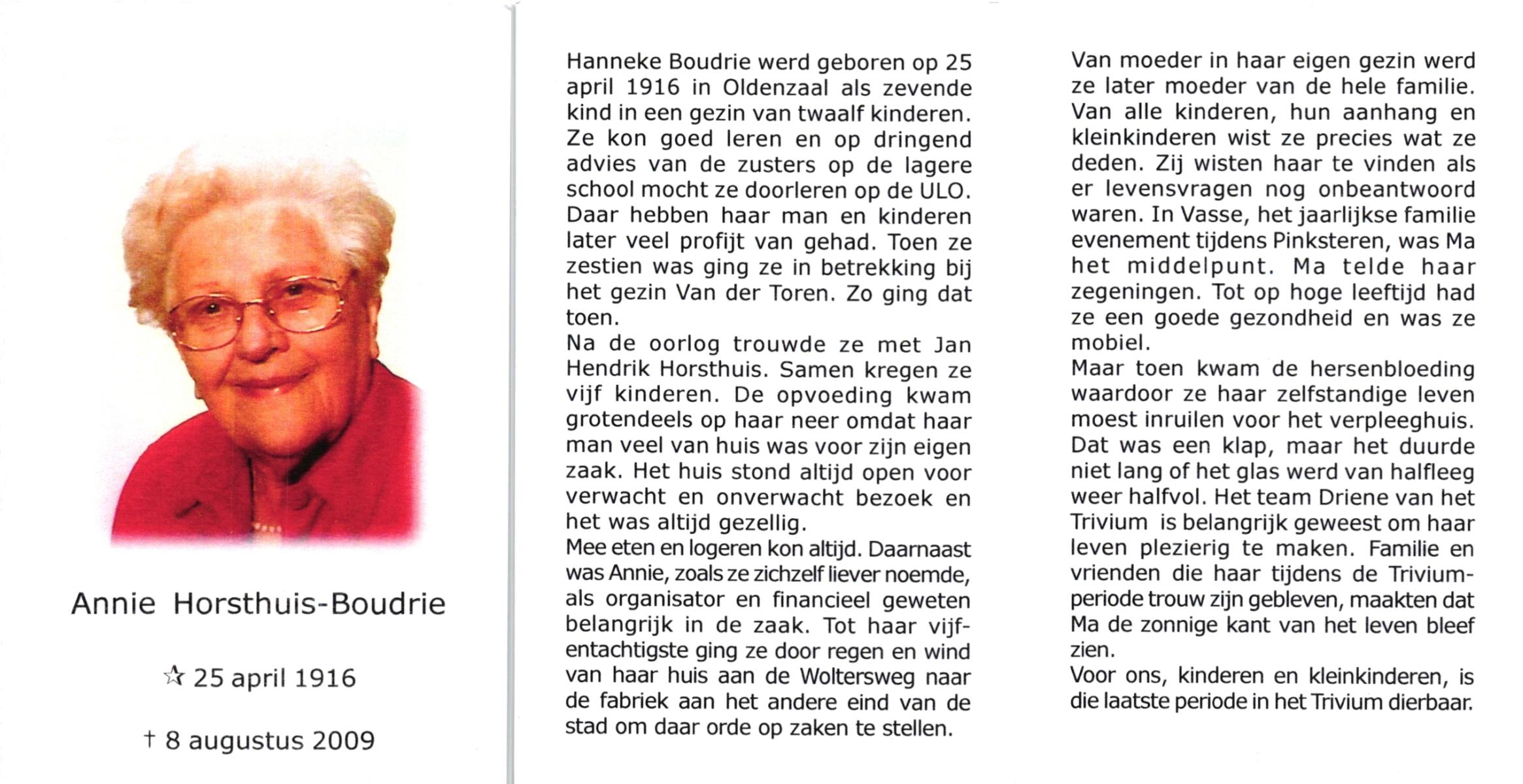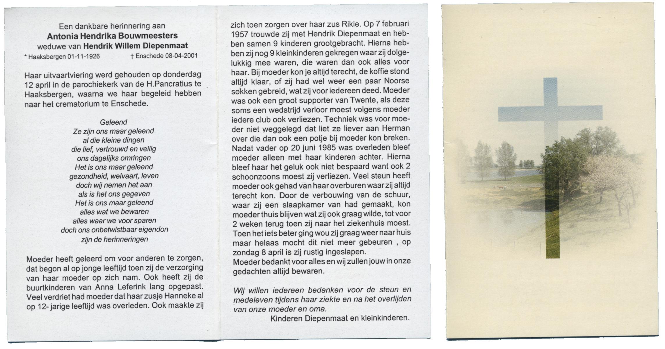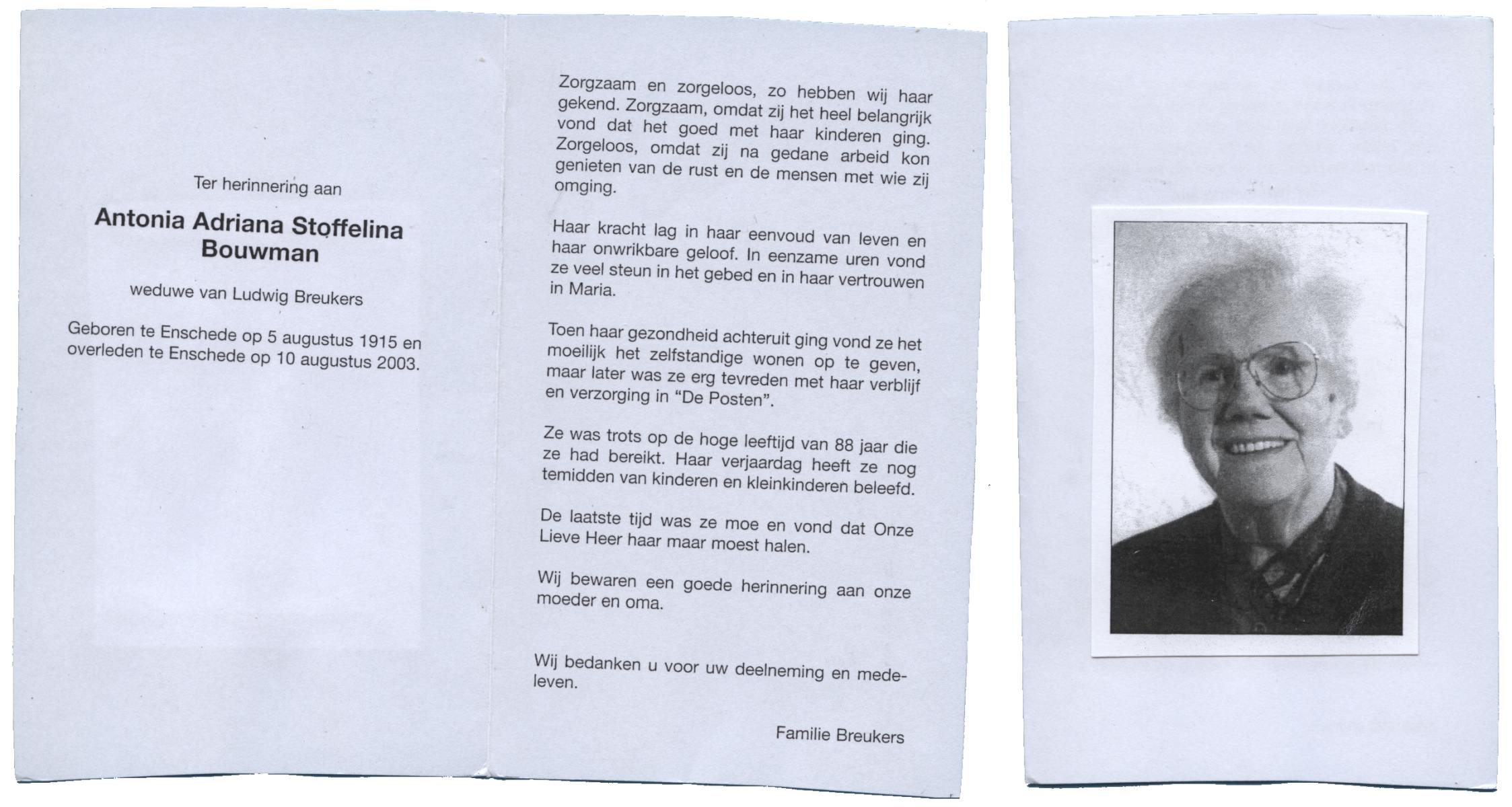 BRAAK, ter, Johanna Geertruida (Anna), geboren op 7-5-1907 te Delden, Ambt, overleden op 26-12-2003 te Delden op 95-jarige leeftijd, begraven op 30-12-2003 te Delden.