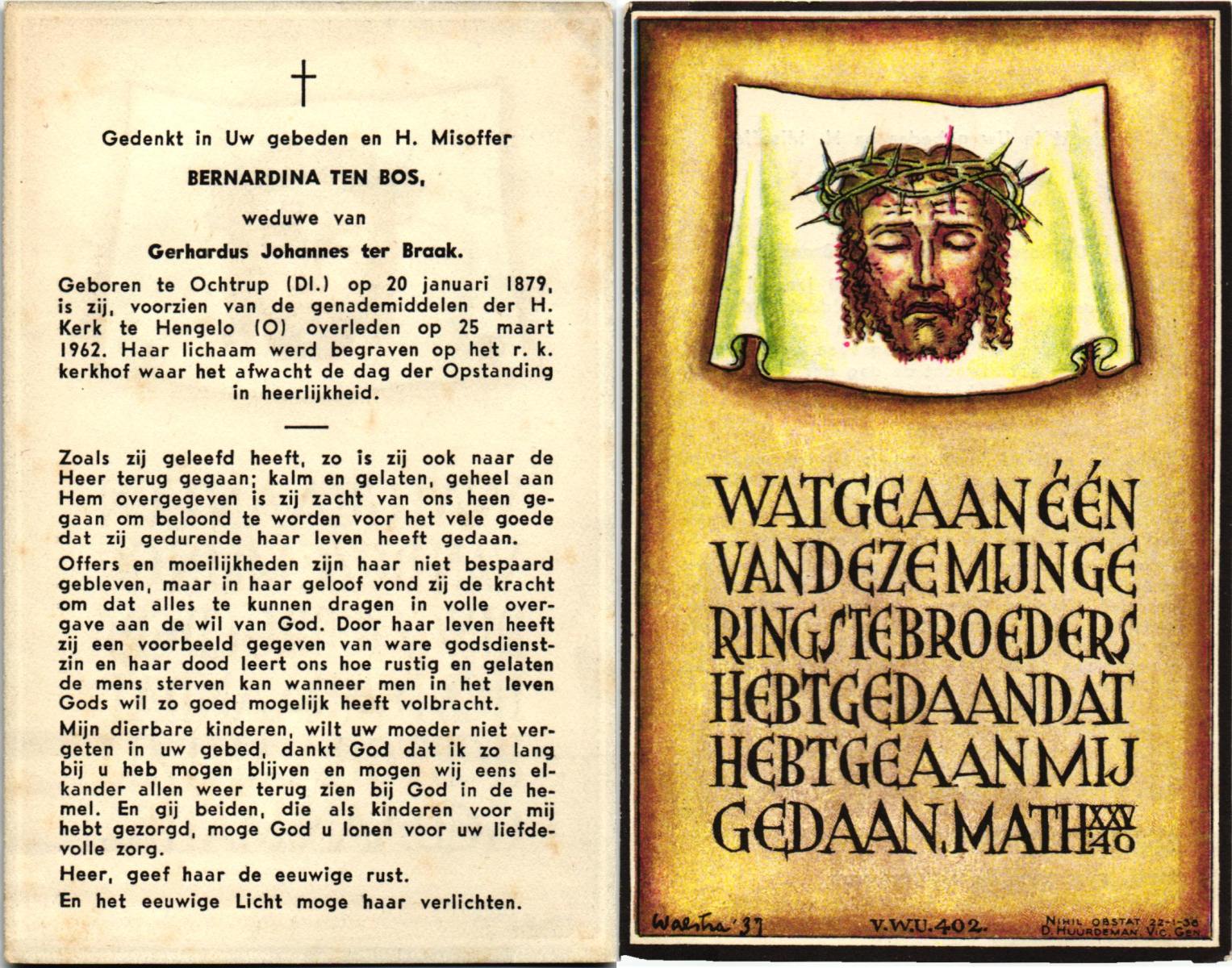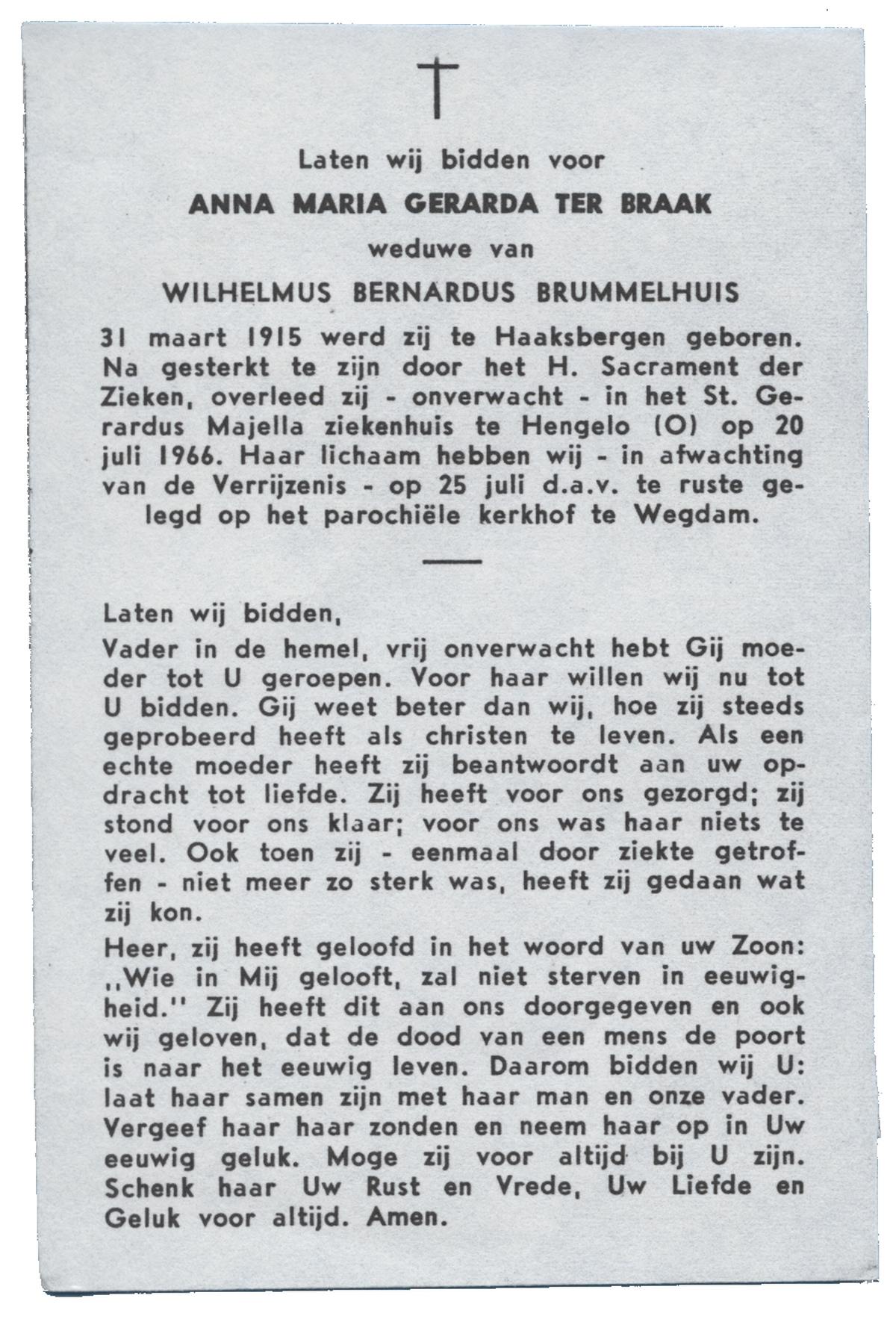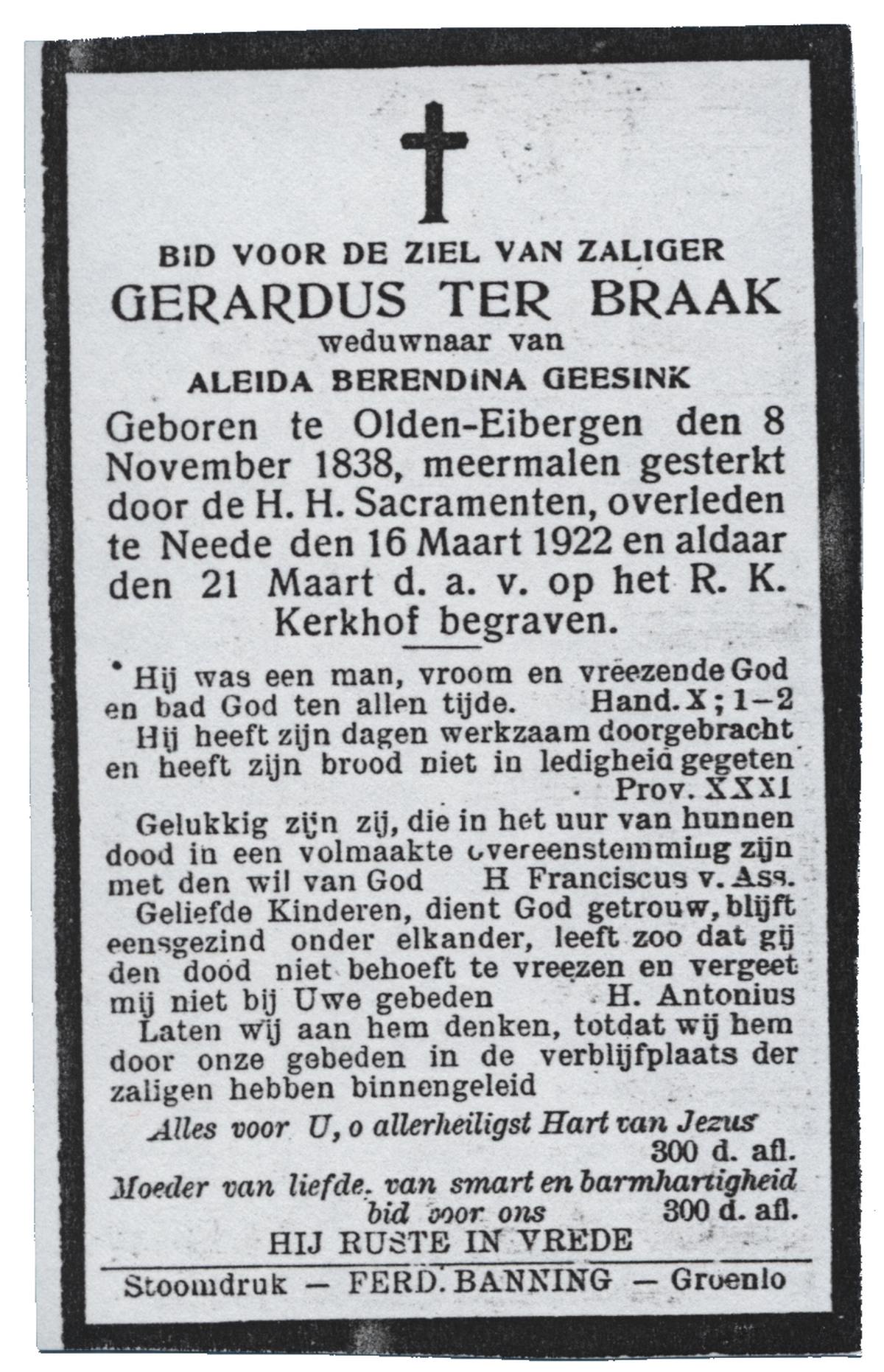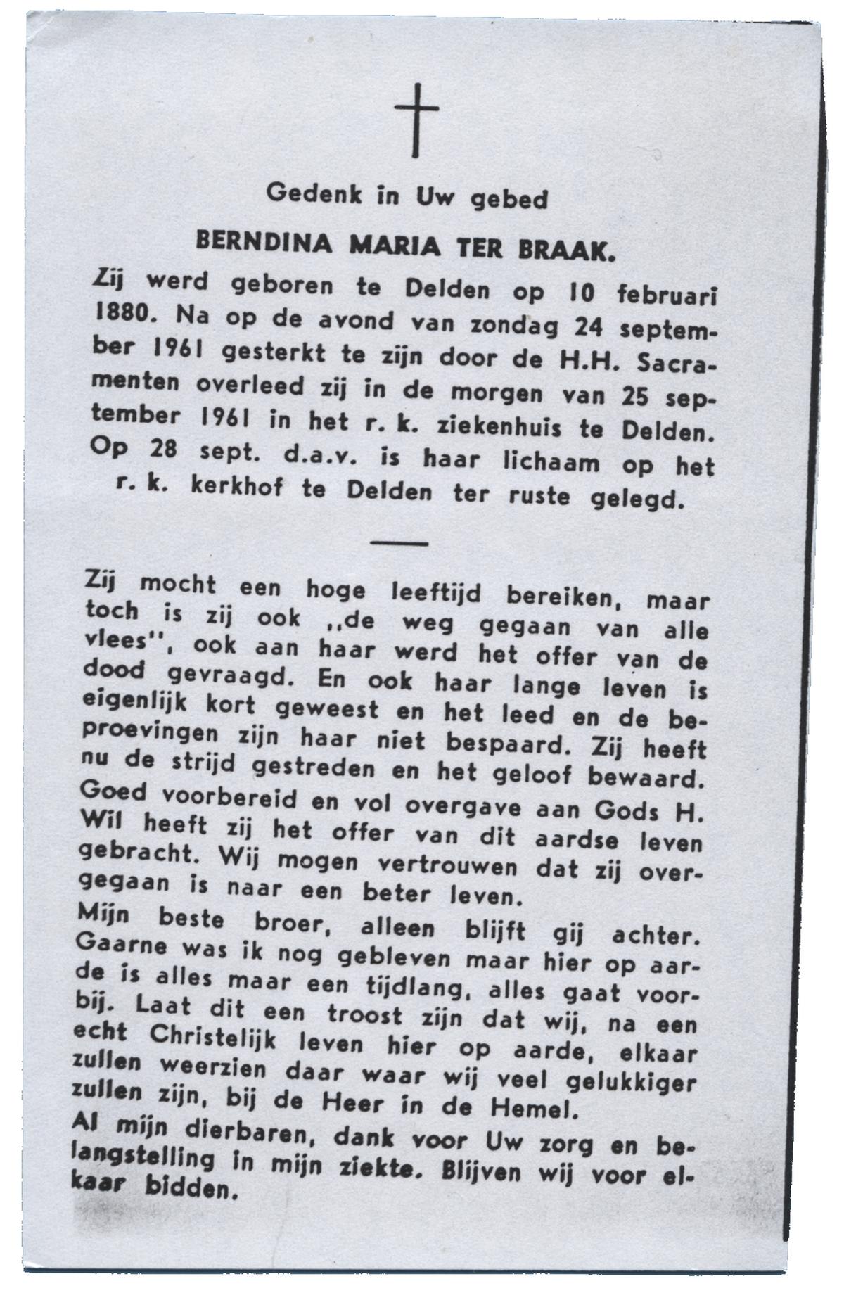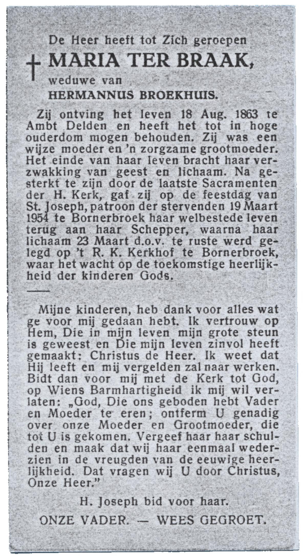 BRAAK, ter, Maria, geboren op 18-08-1863 te Delden, Ambt, overleden op 19-3-1954 te Bornerbroek op 90-jarige leeftijd, begraven op 23-3-1954 te Bornerbroek.
